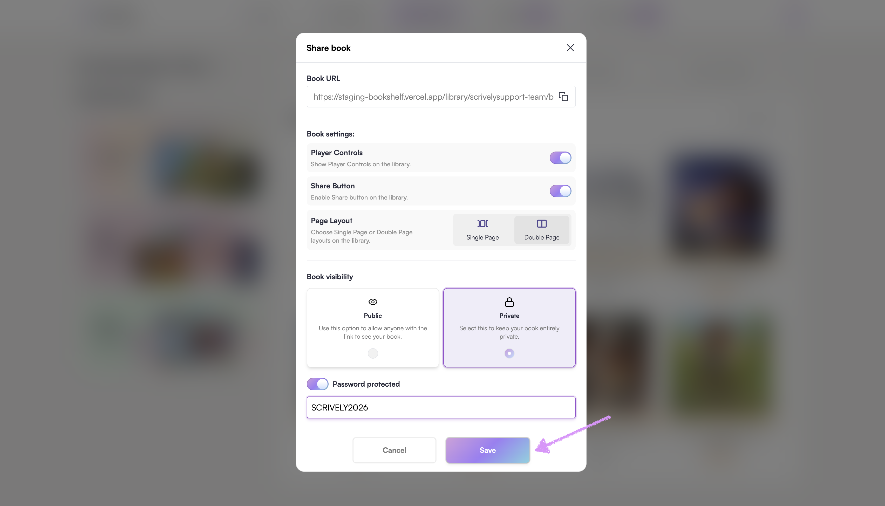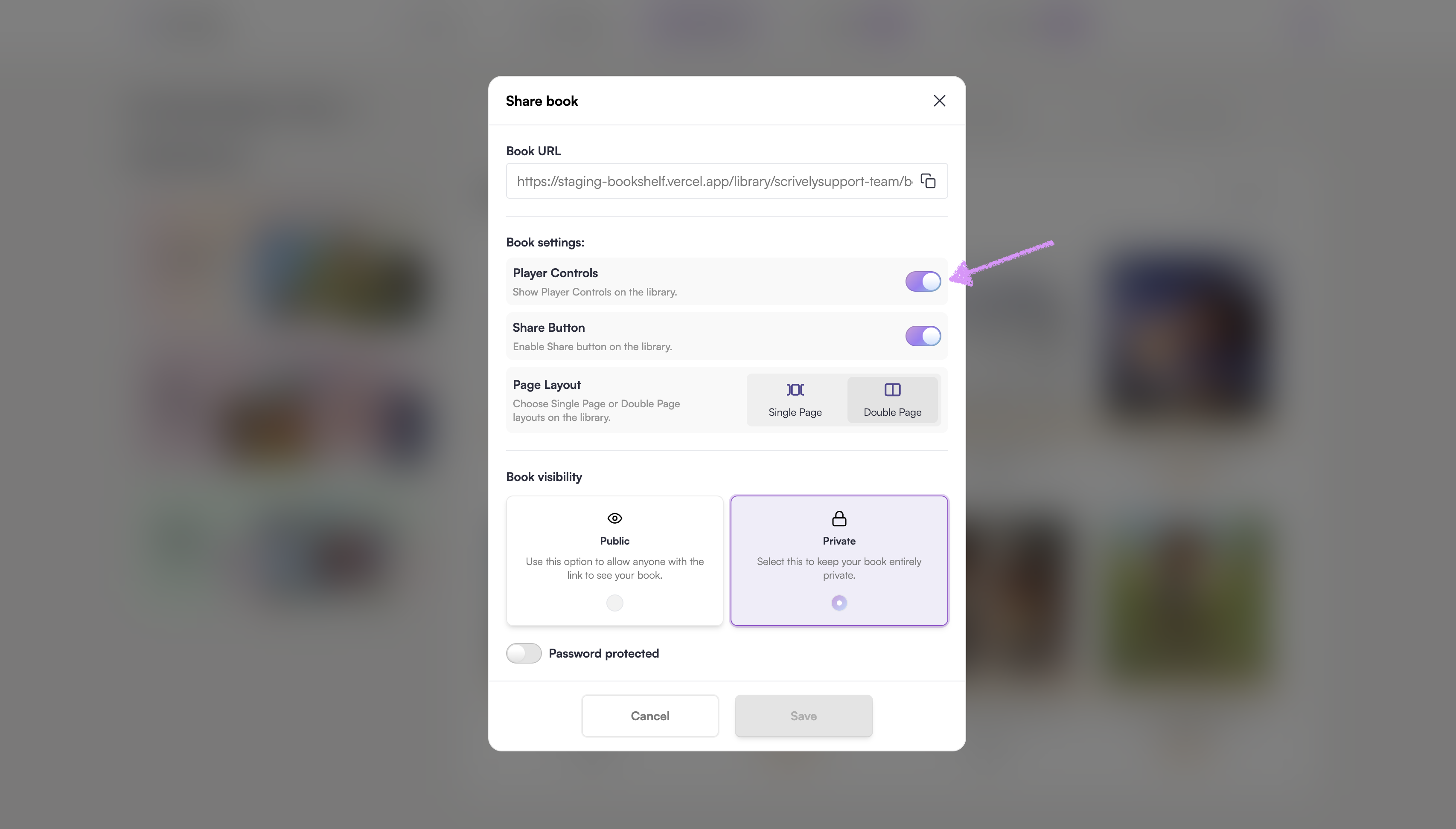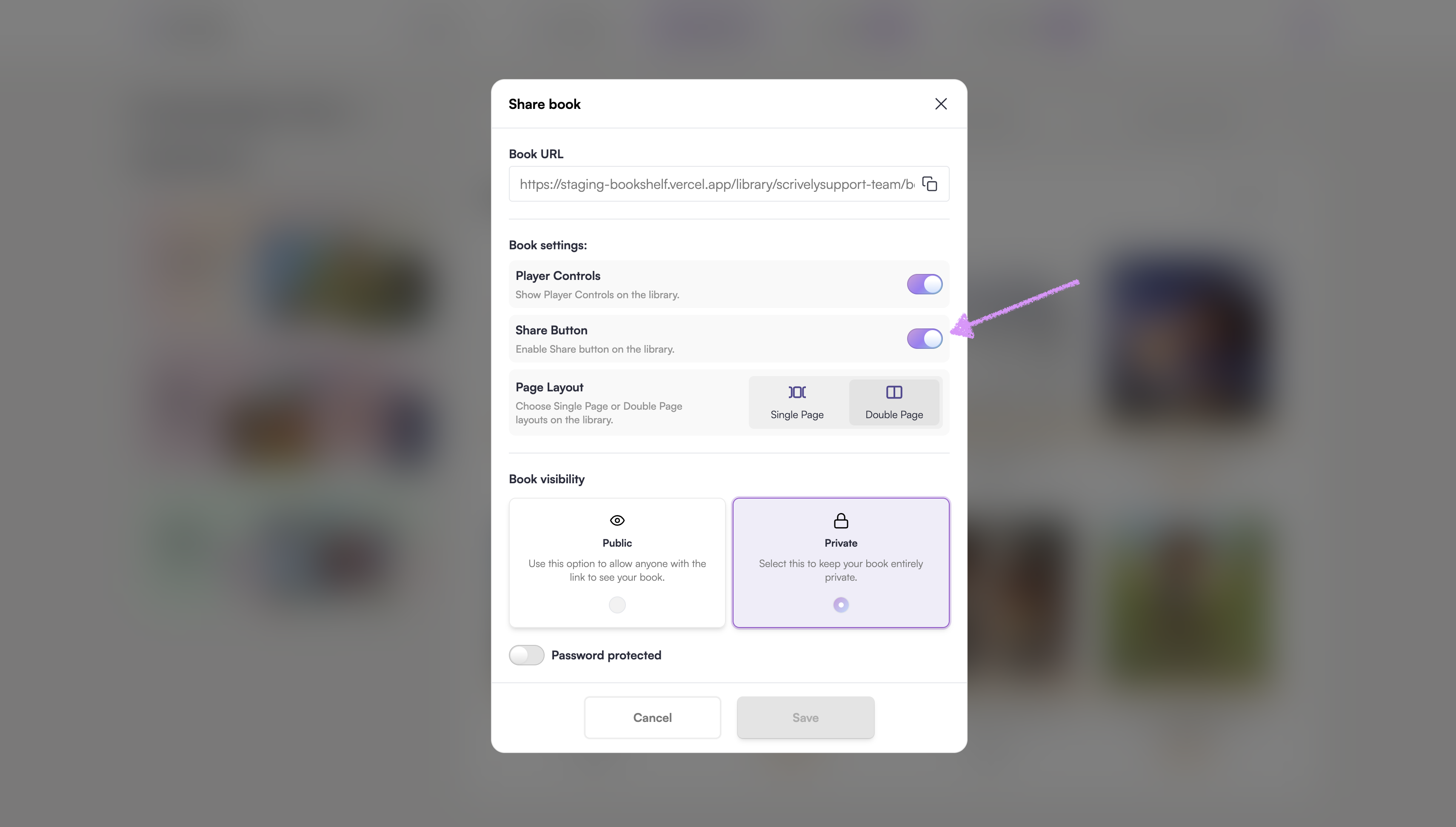 Toggle “Share Button” on or off. Turning this off prevents readers from sharing the book in your library.