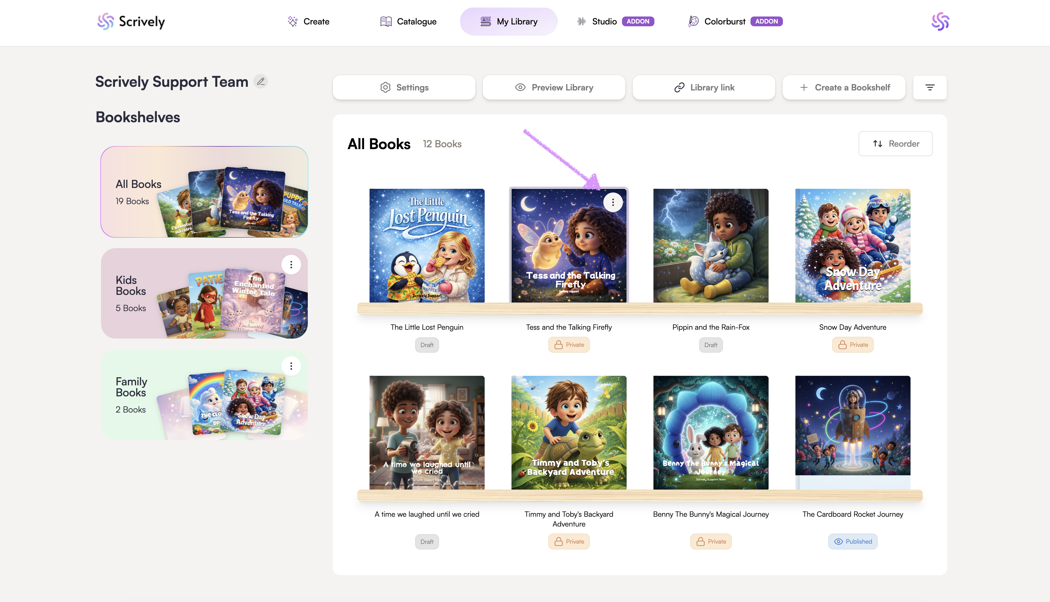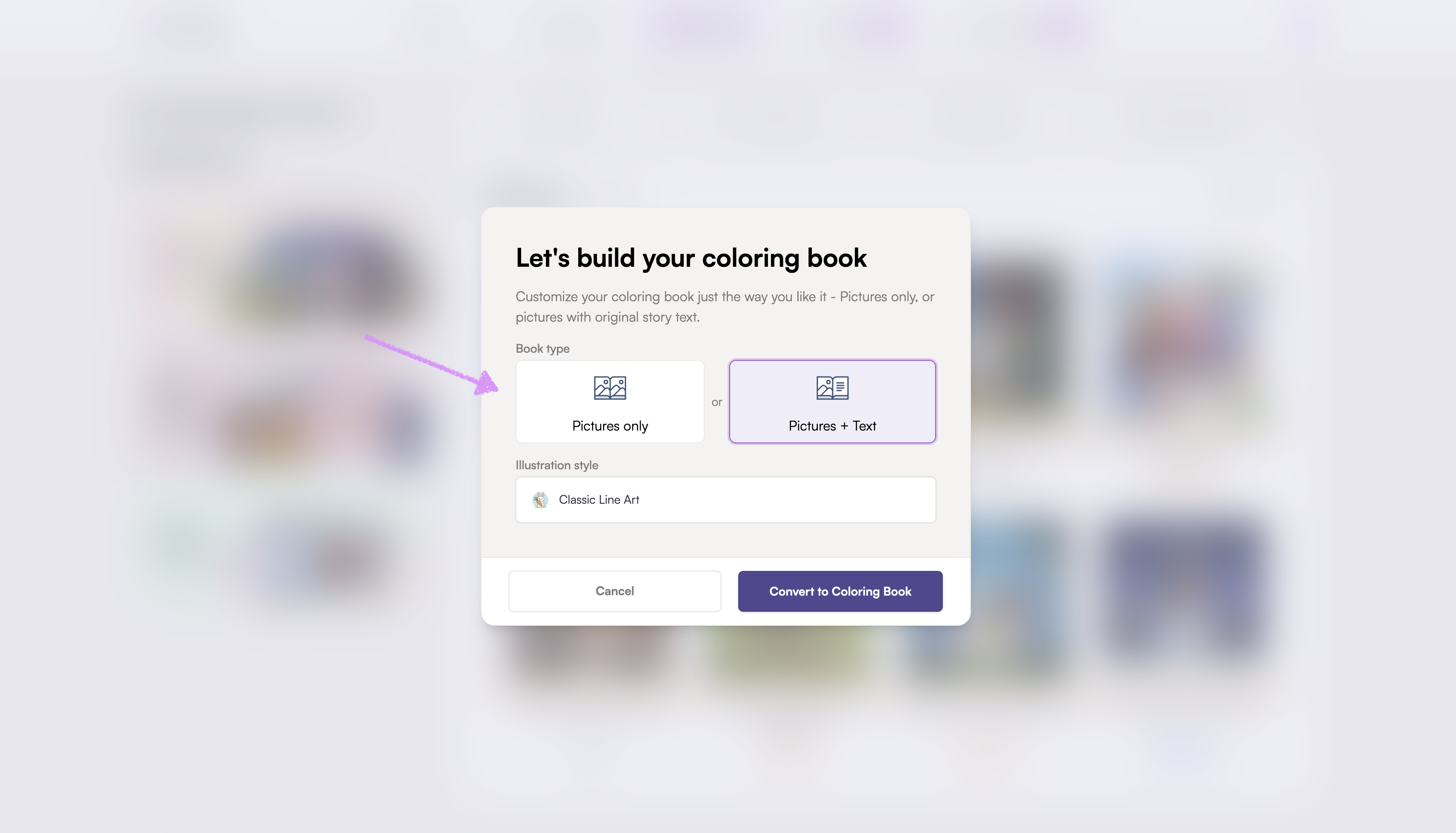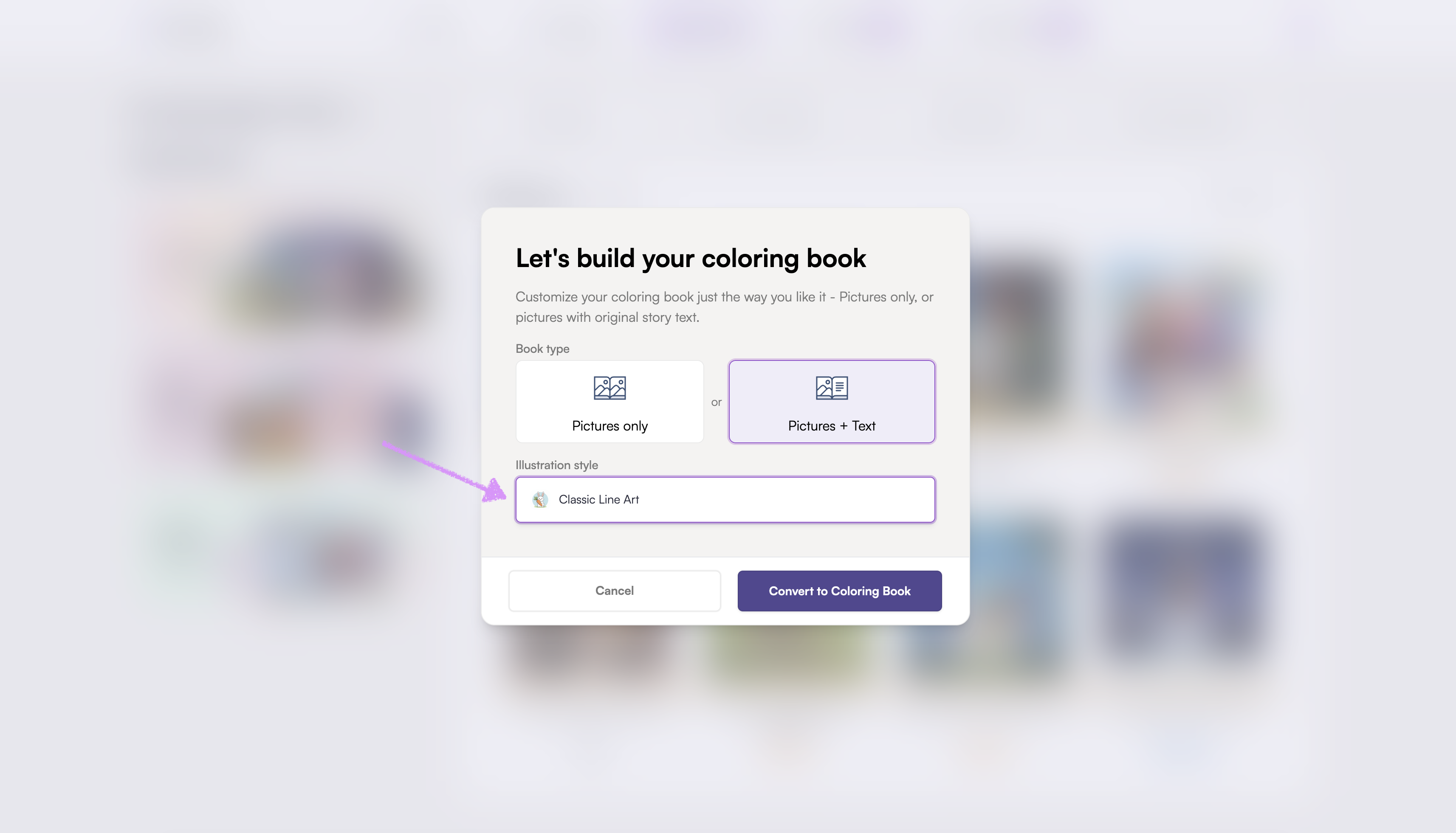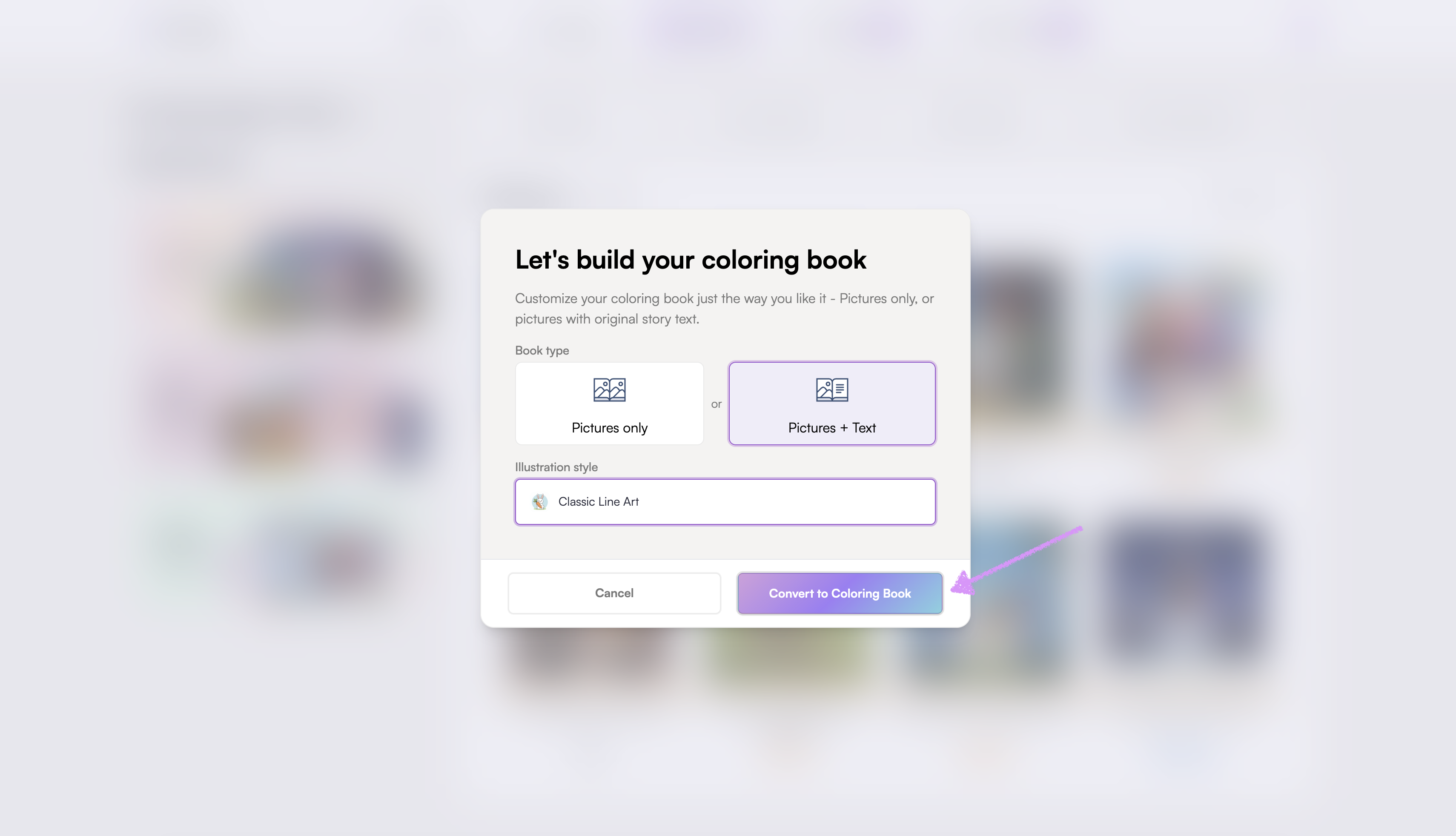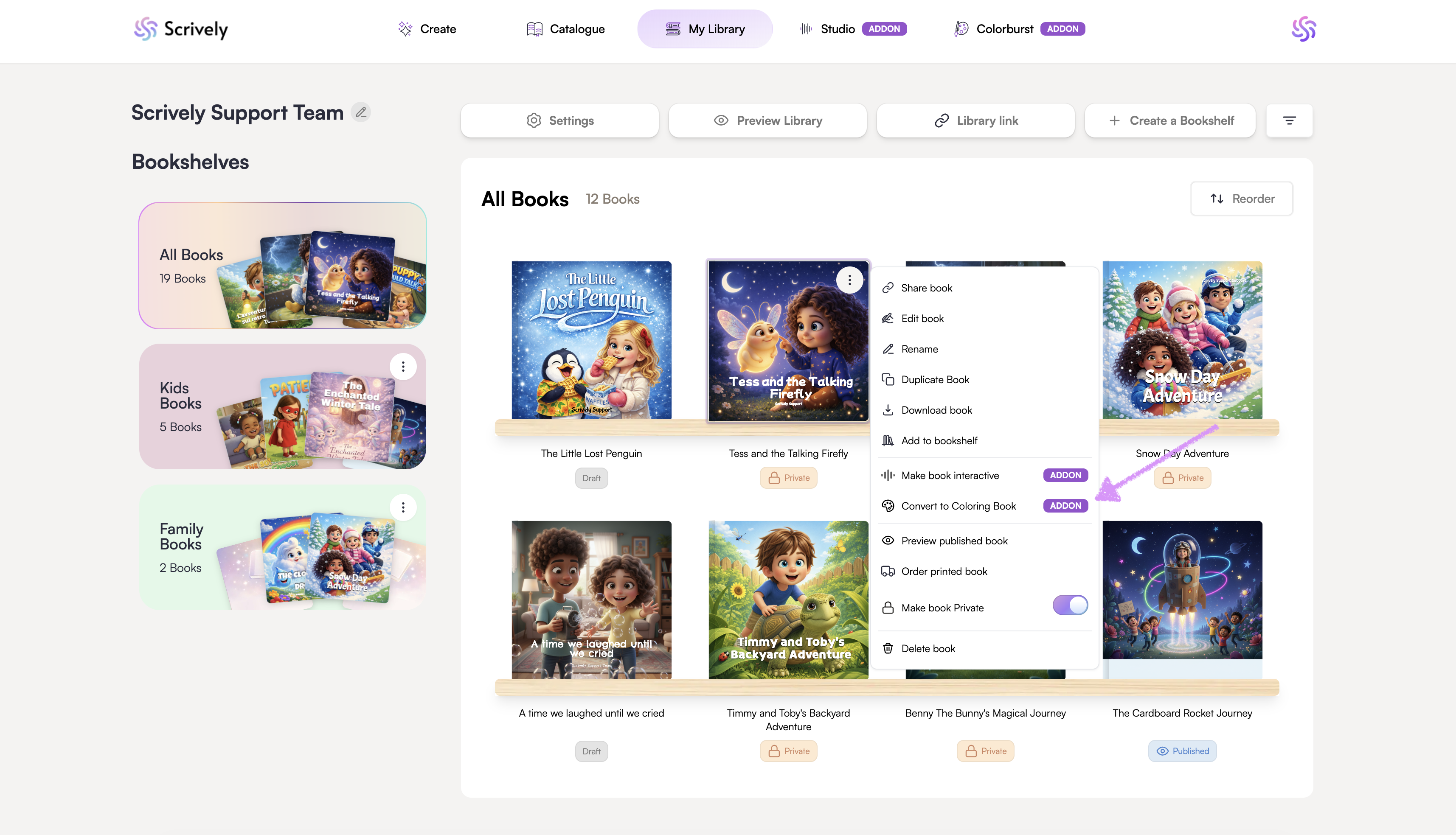 Scroll all the way down to your library at the bottom, then hover over the book you want to convert into a coloring book. Click the ellipsis (⋮) menu that appears.