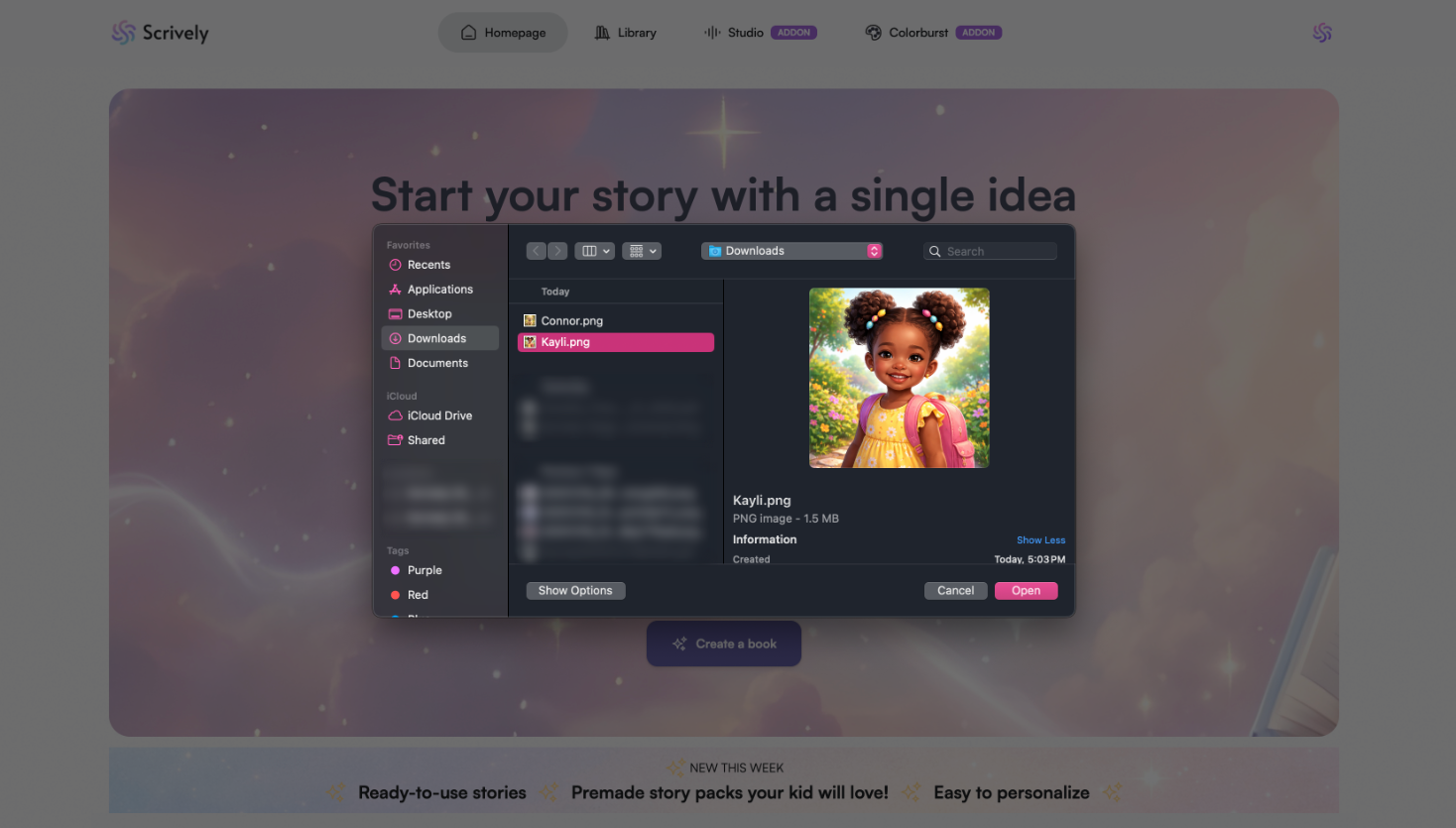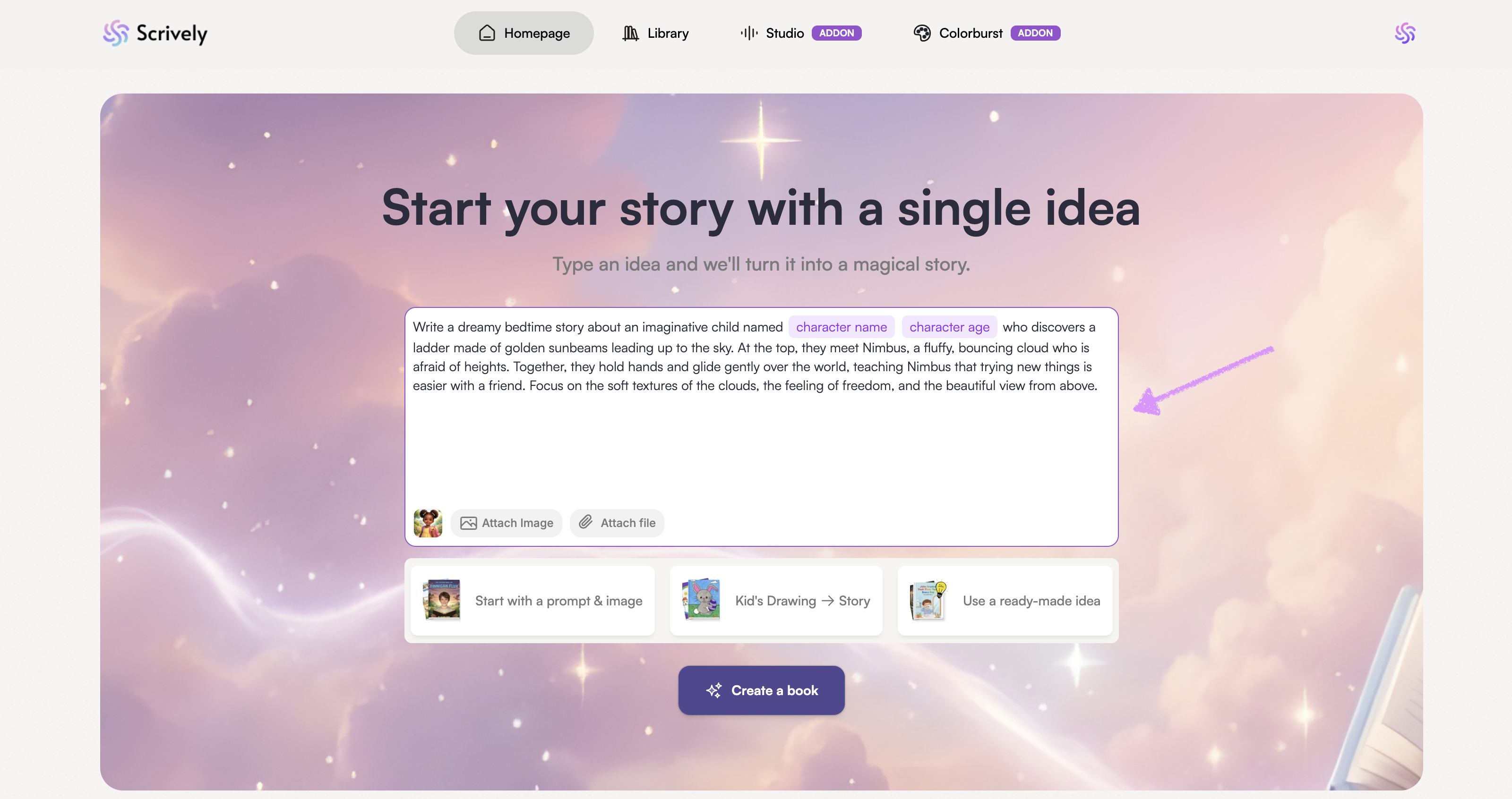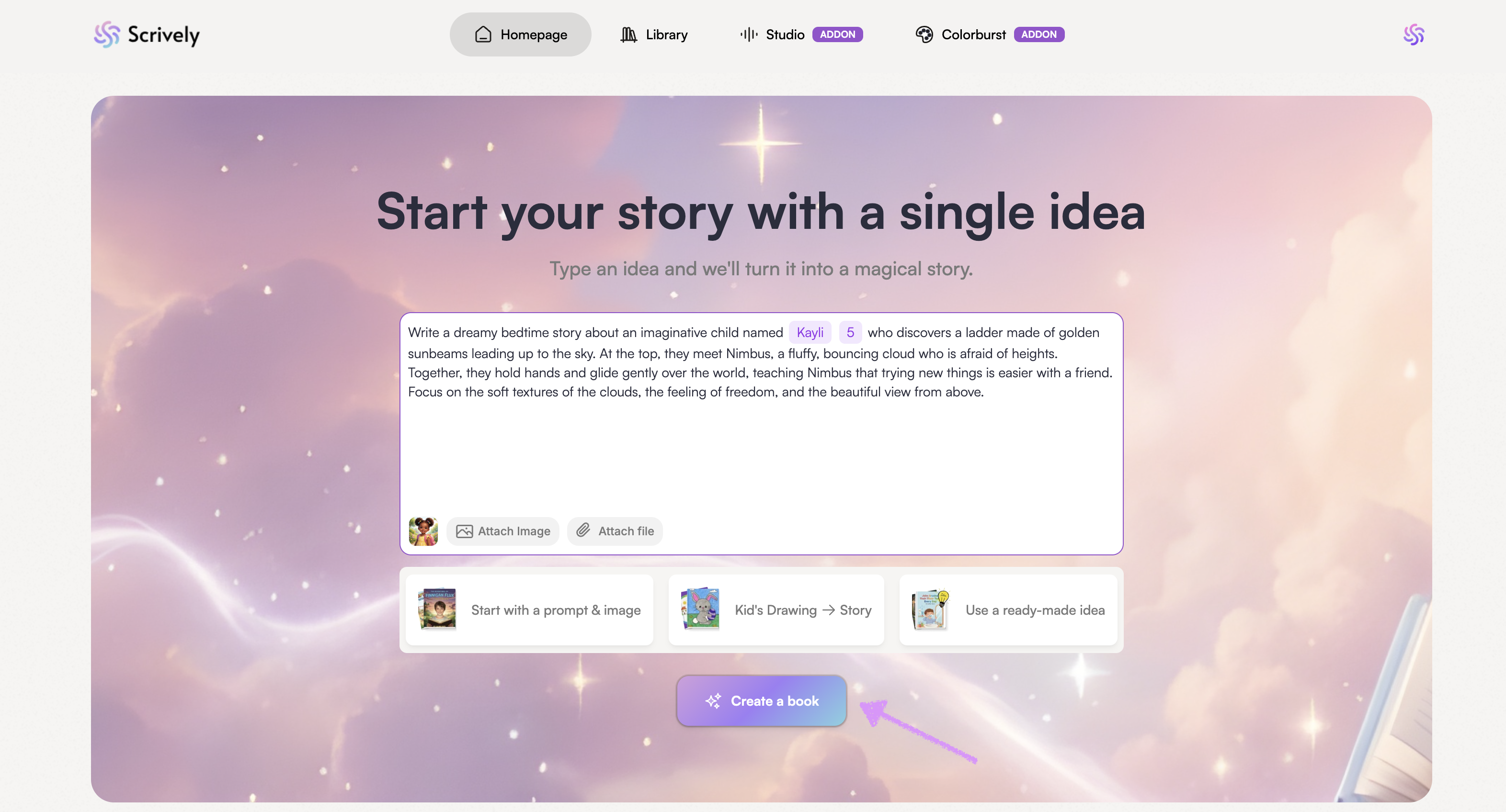 Bring your imagination to life with Scrively! With just an image and a prompt, you can create a personalized storybook full of fun, unique characters and exciting adventures. It’s an easy and playful way to turn your ideas into a book your child will love, making every story truly one-of-a-kind.