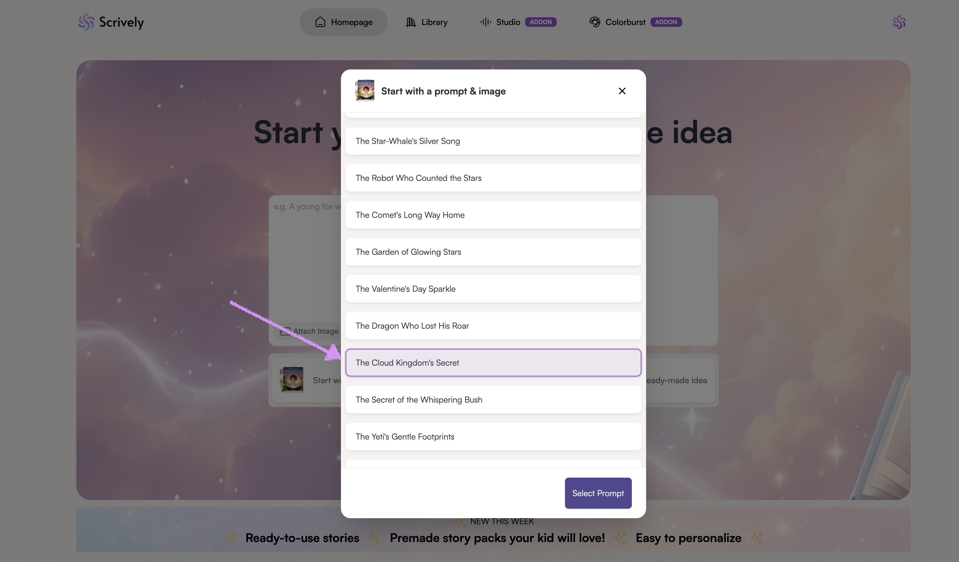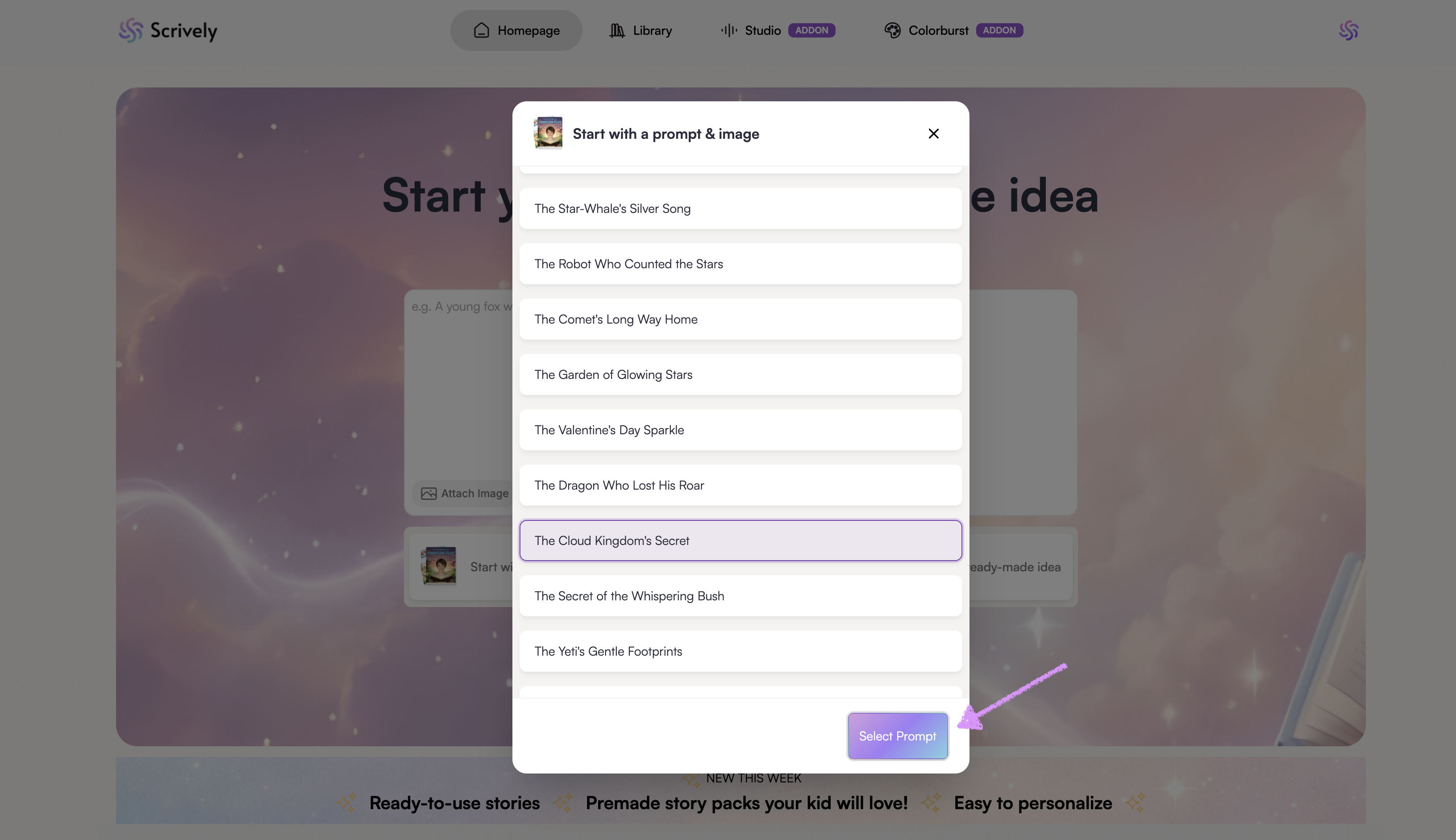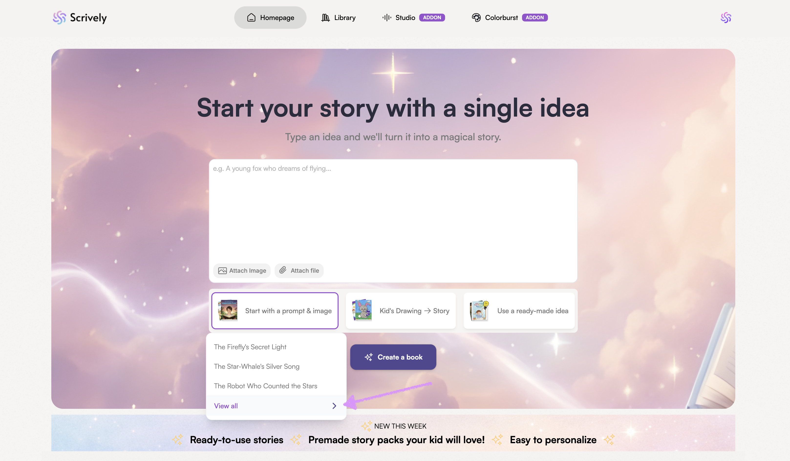 Bring your imagination to life with Scrively! With just an image and a prompt, you can create a personalized storybook full of fun, unique characters and exciting adventures. It’s an easy and playful way to turn your ideas into a book your child will love, making every story truly one-of-a-kind.