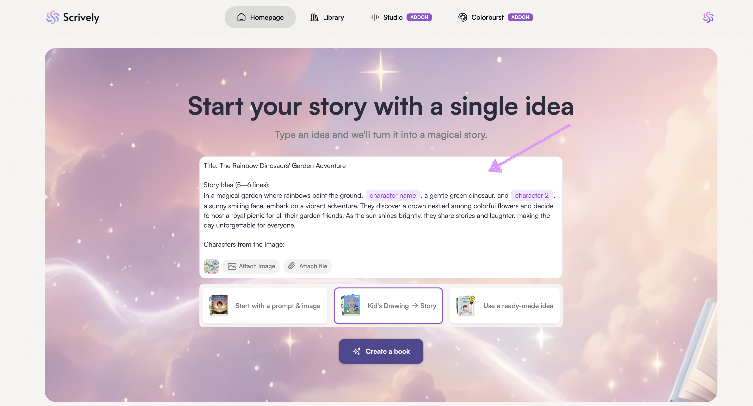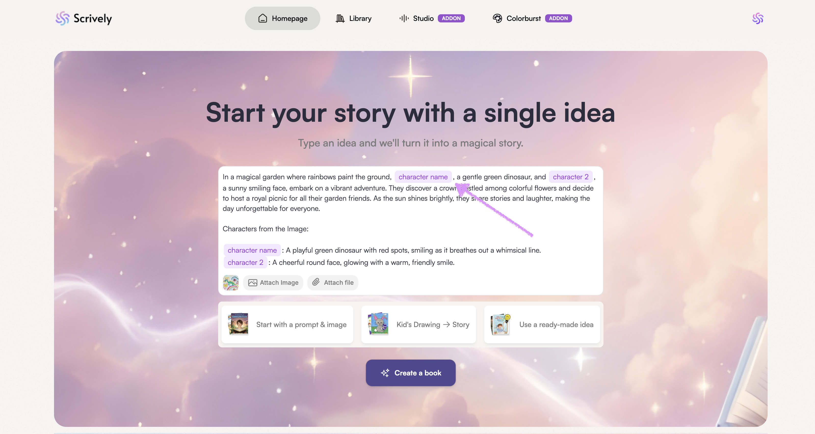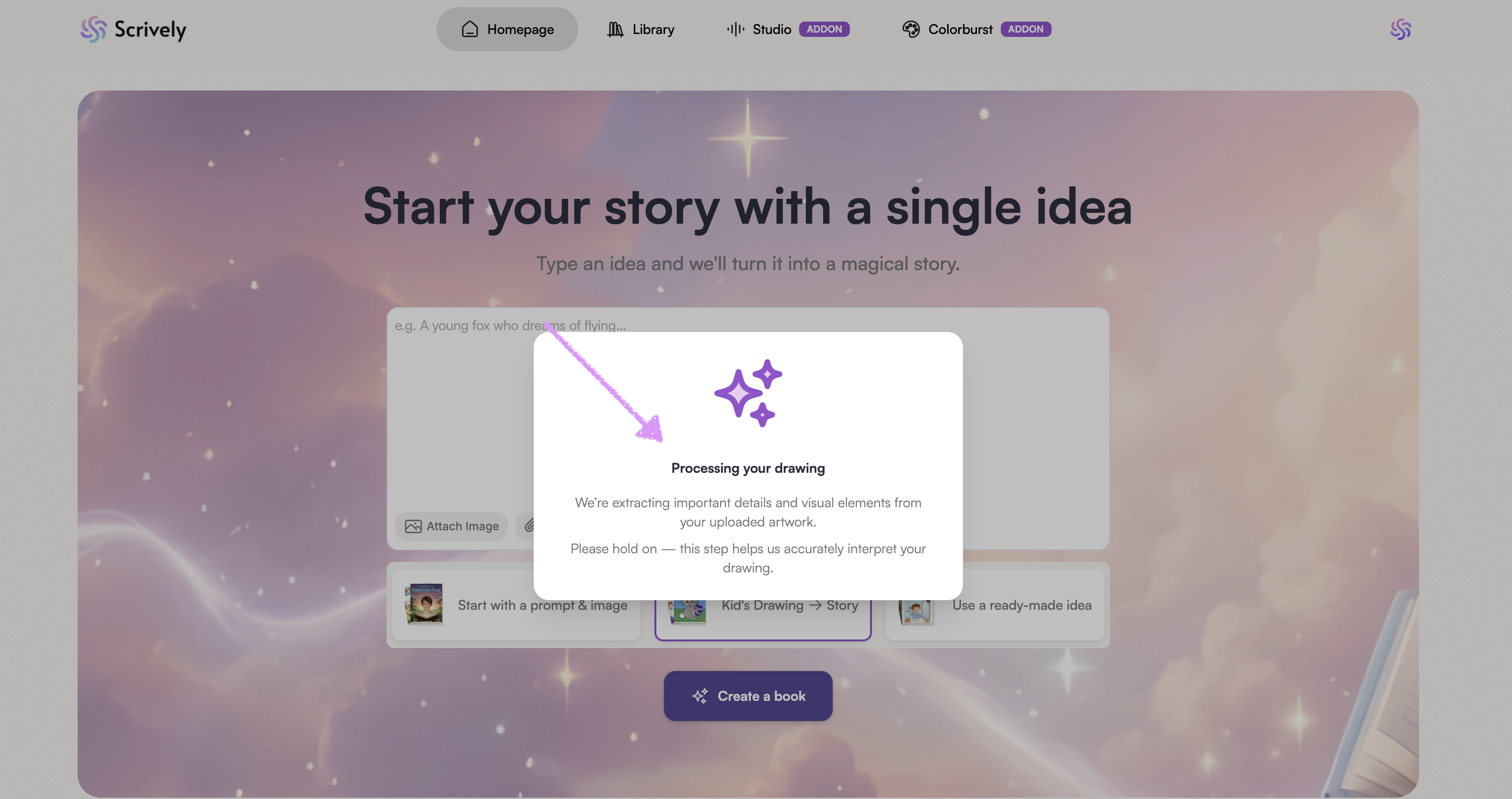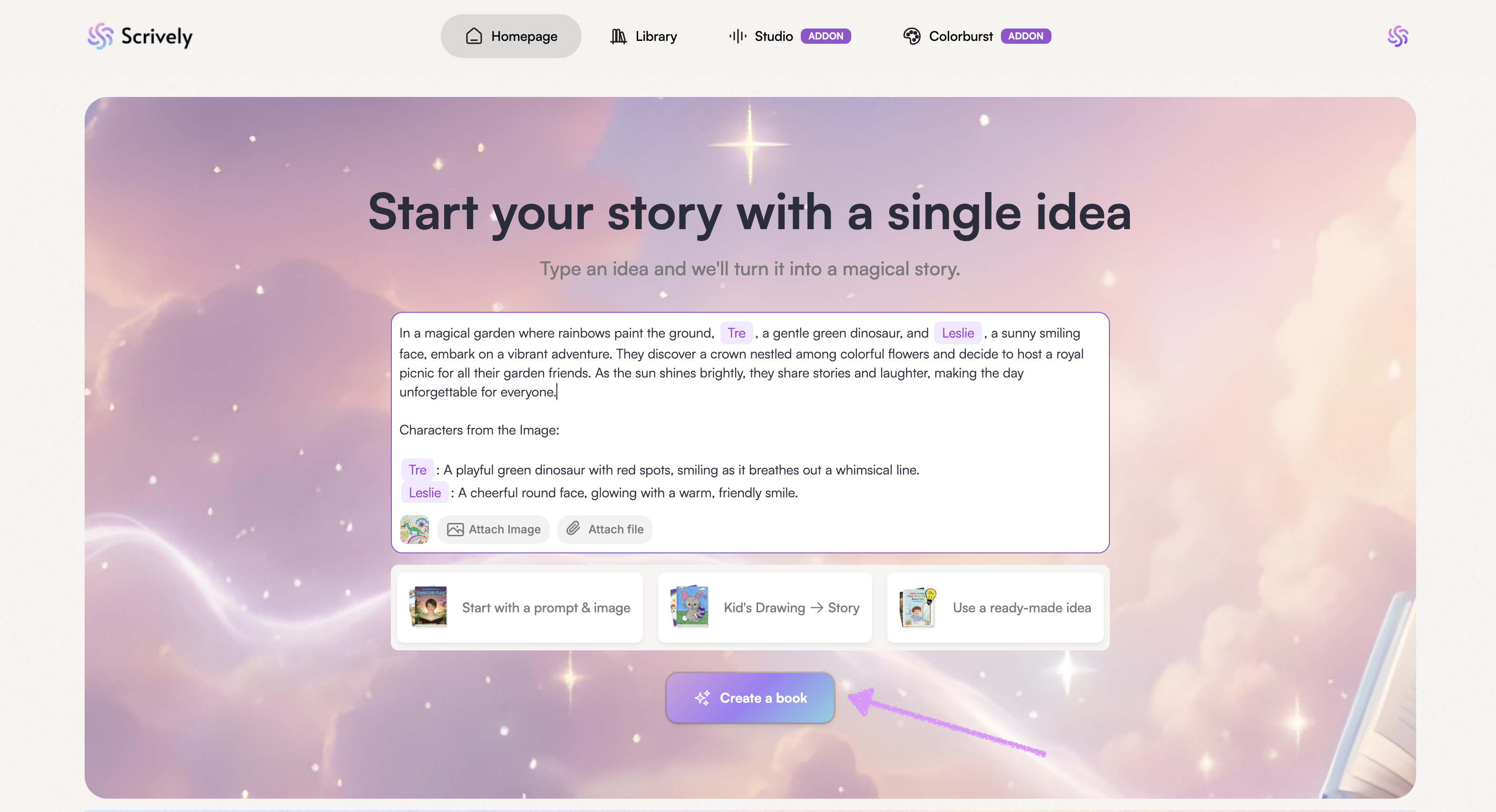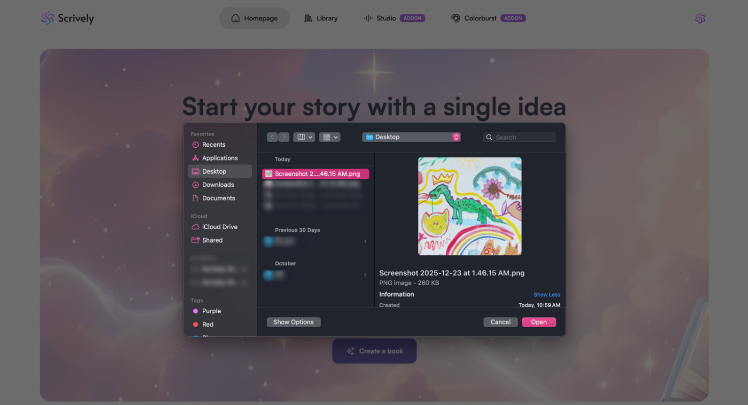 Every child’s drawing tells a story, so why not make it an actual story? With Scrively, you can take your child’s crayon masterpiece and use it to create a beautifully illustrated book. Their imagination leads the way, and the result is something you’ll both treasure forever.