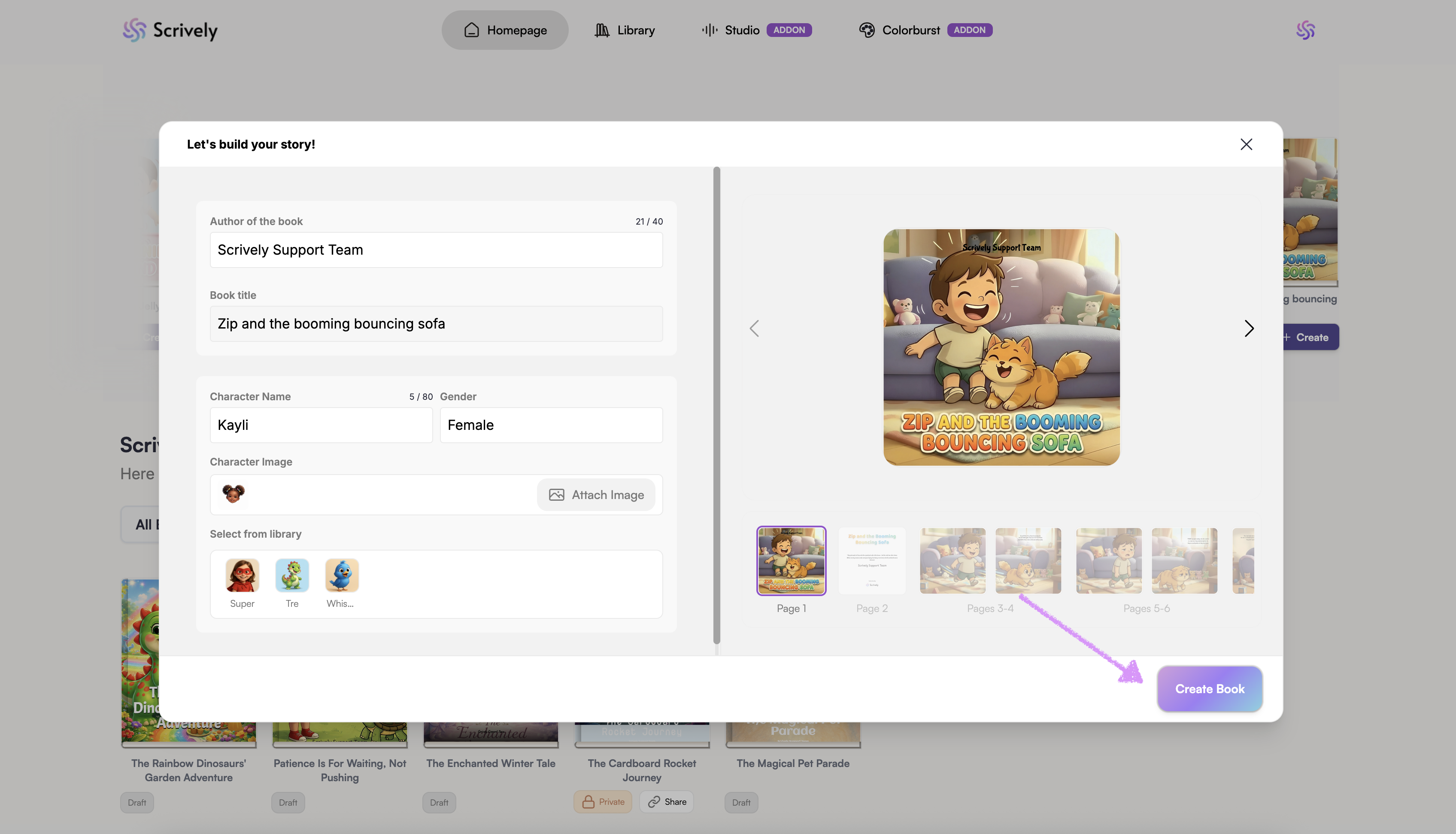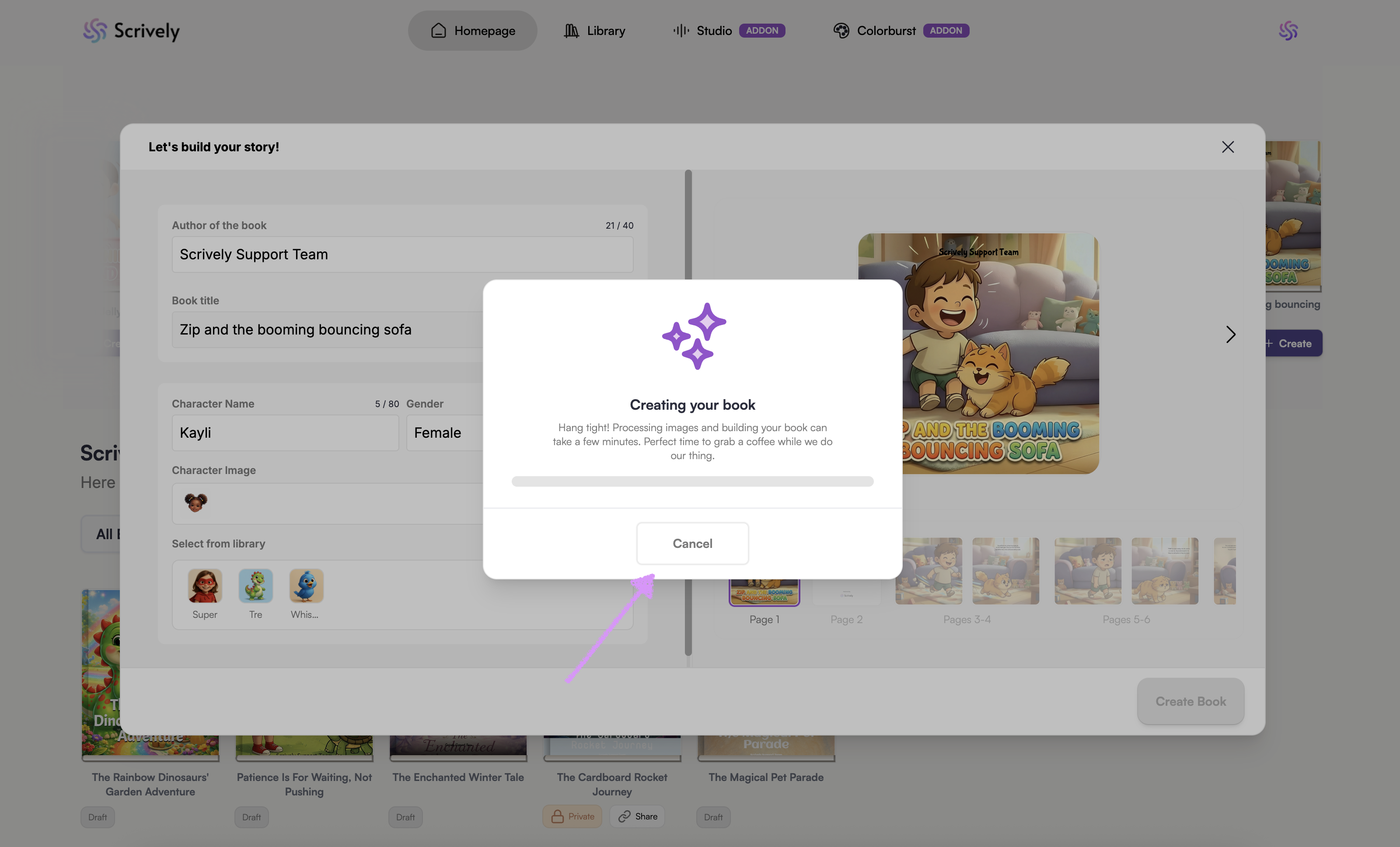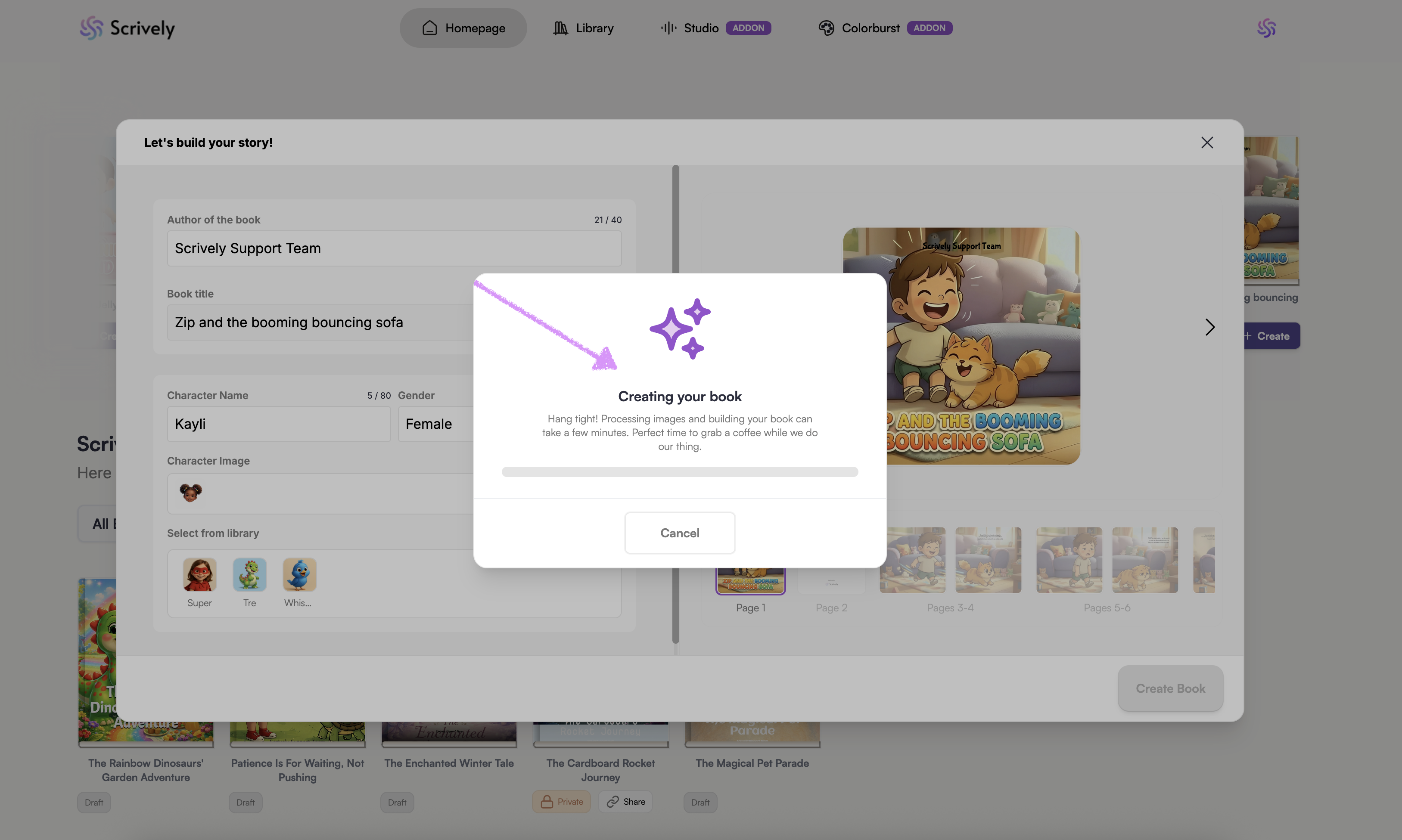 Scrively will take a few moments to think and create the book.