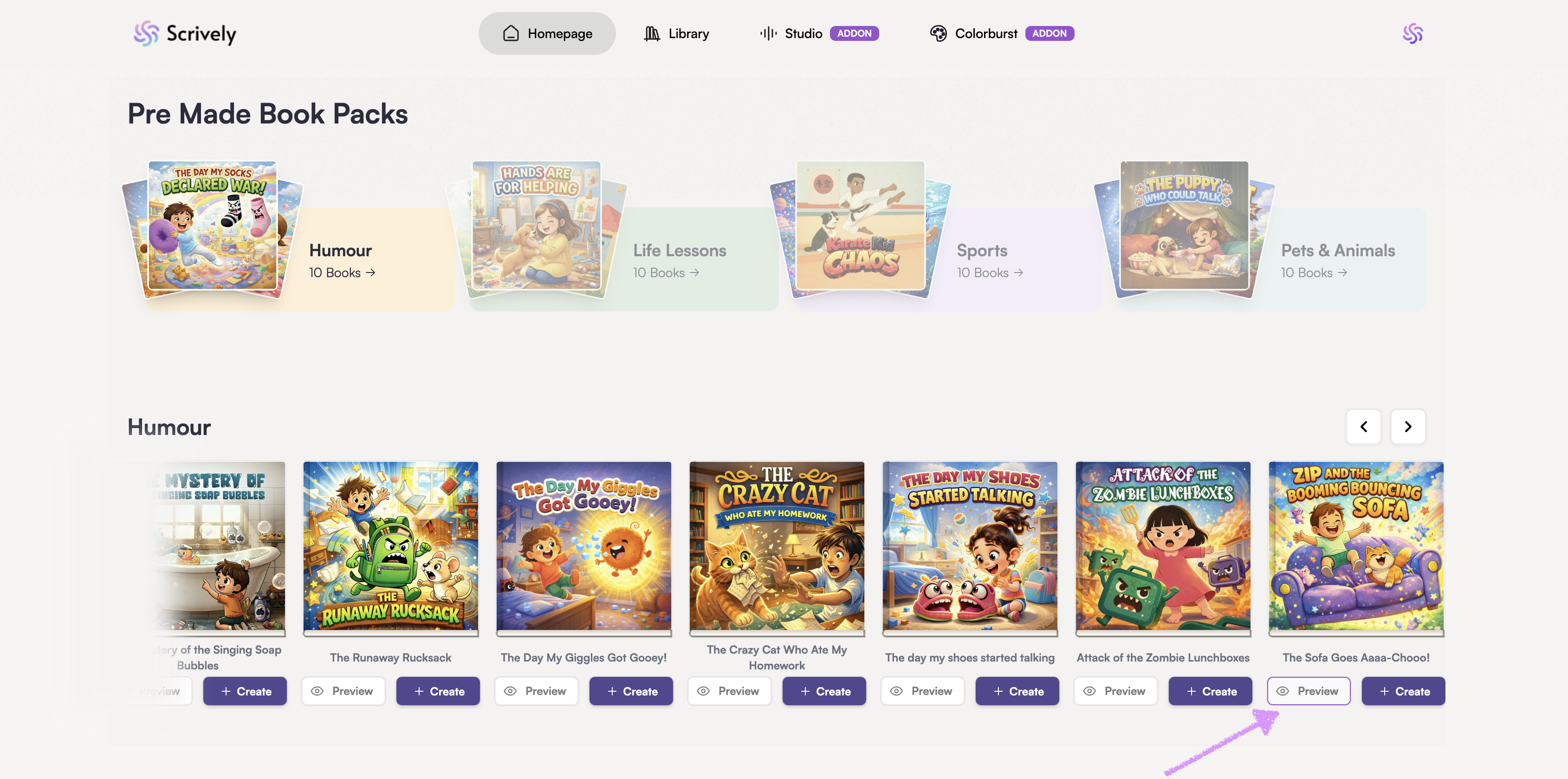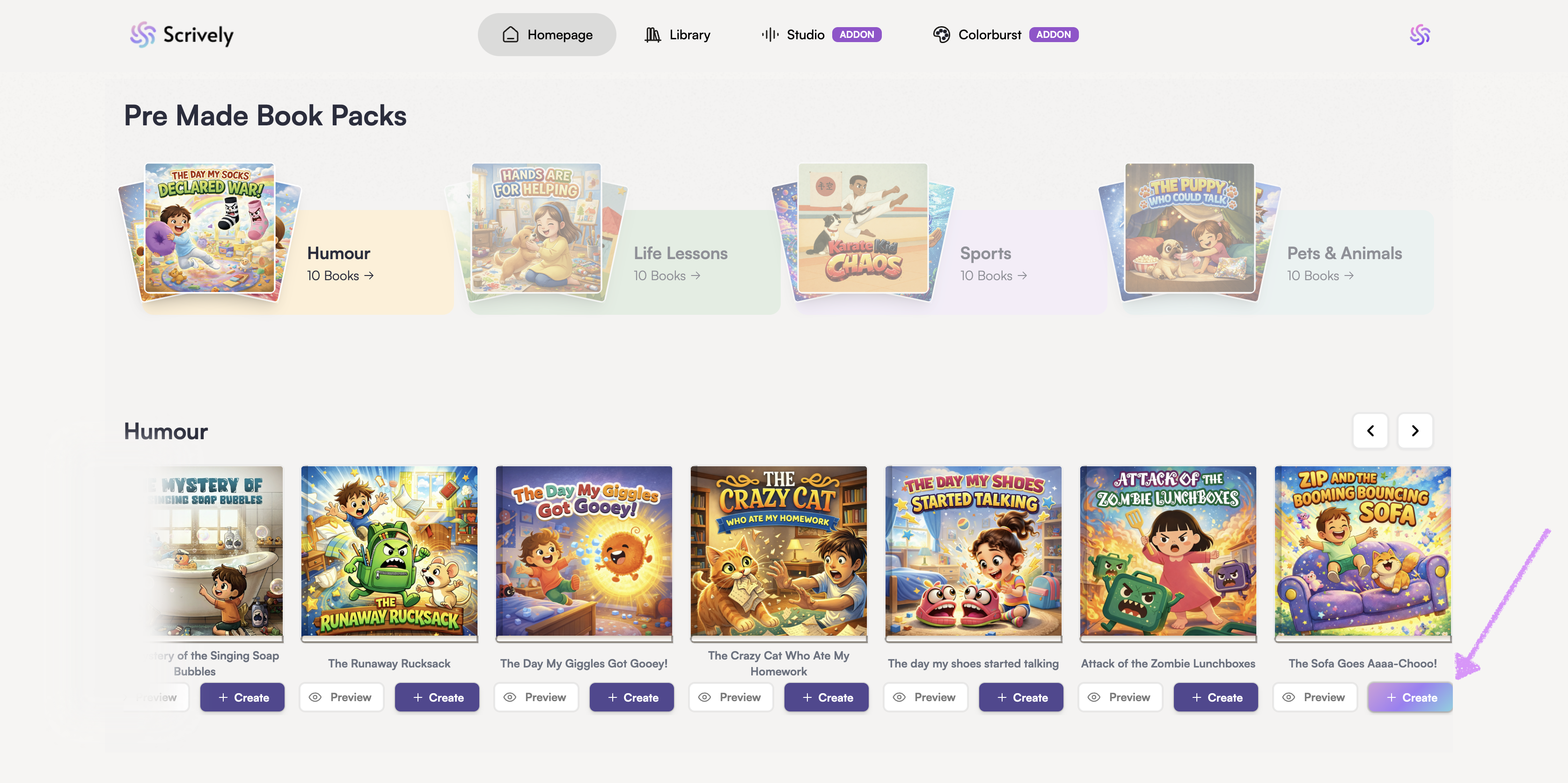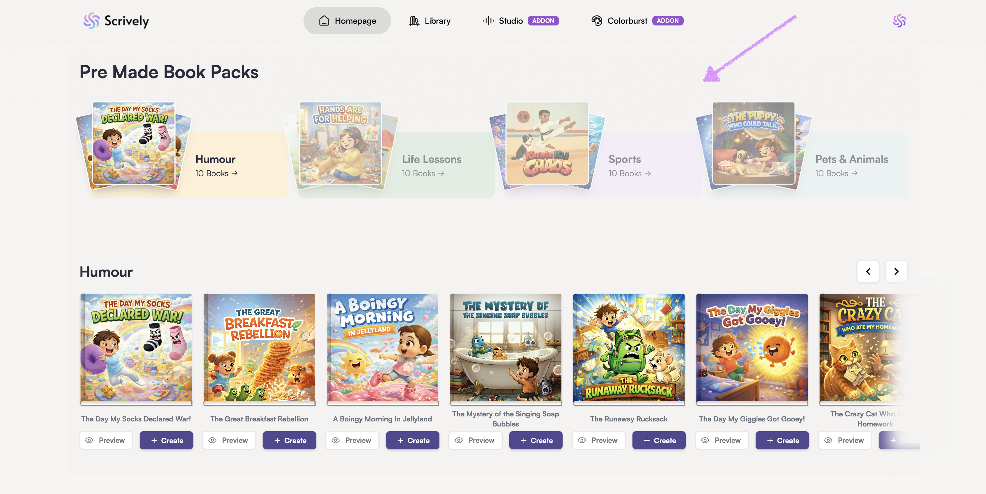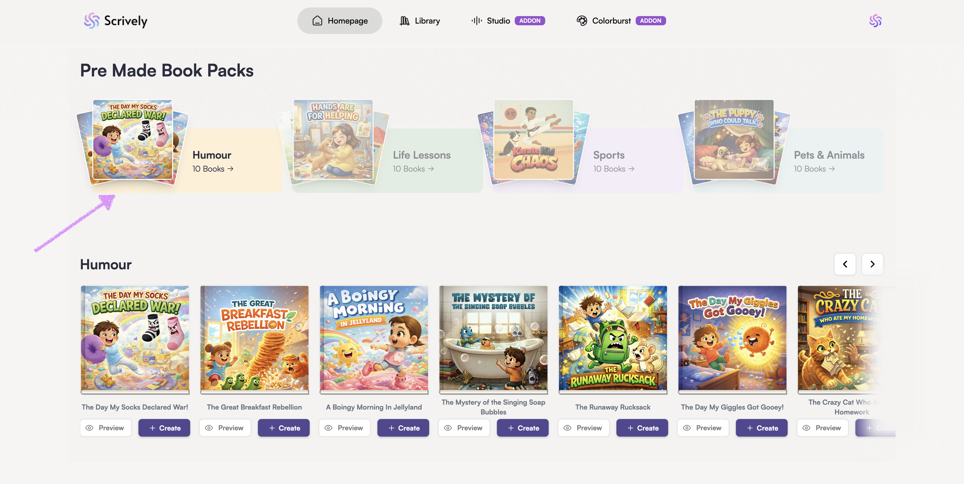 From the Homepage, scroll down to the Pre Made Book Packs.