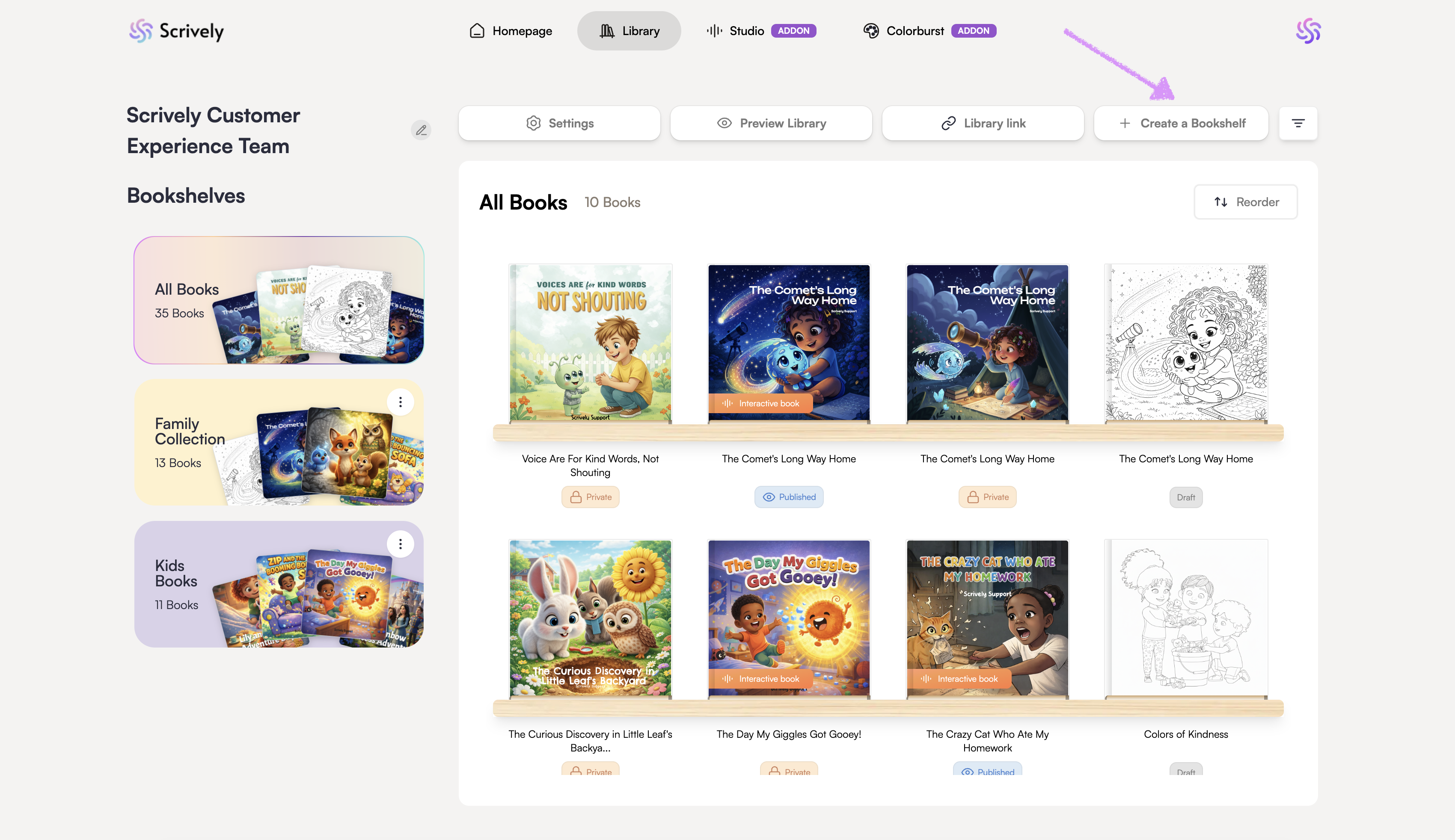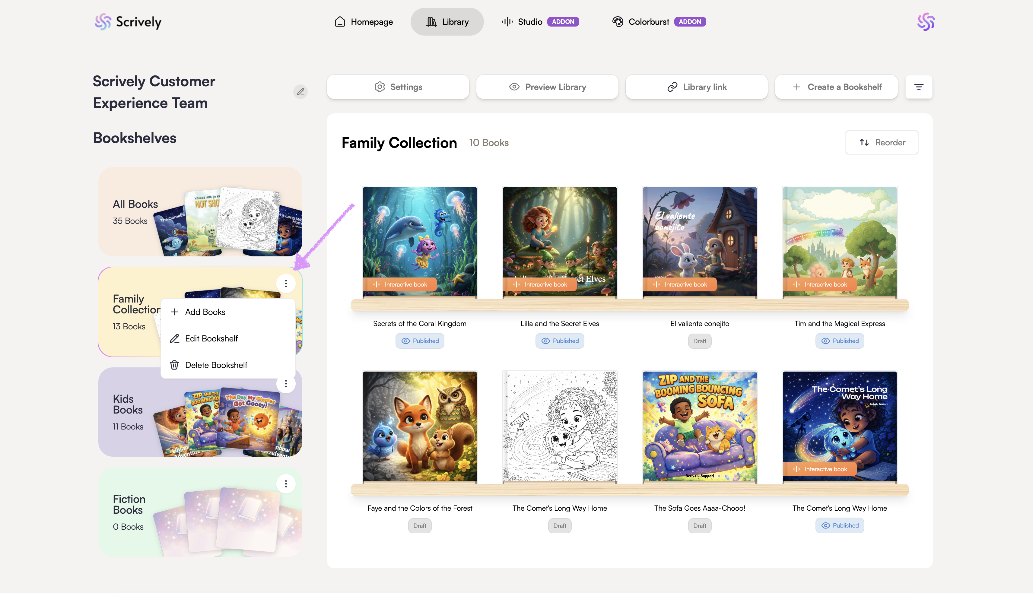 If you'd like to add a book to an existing bookshelf, hover over click on ellipsis (:) menu on the right side of the bookshelf and select "Add Books."