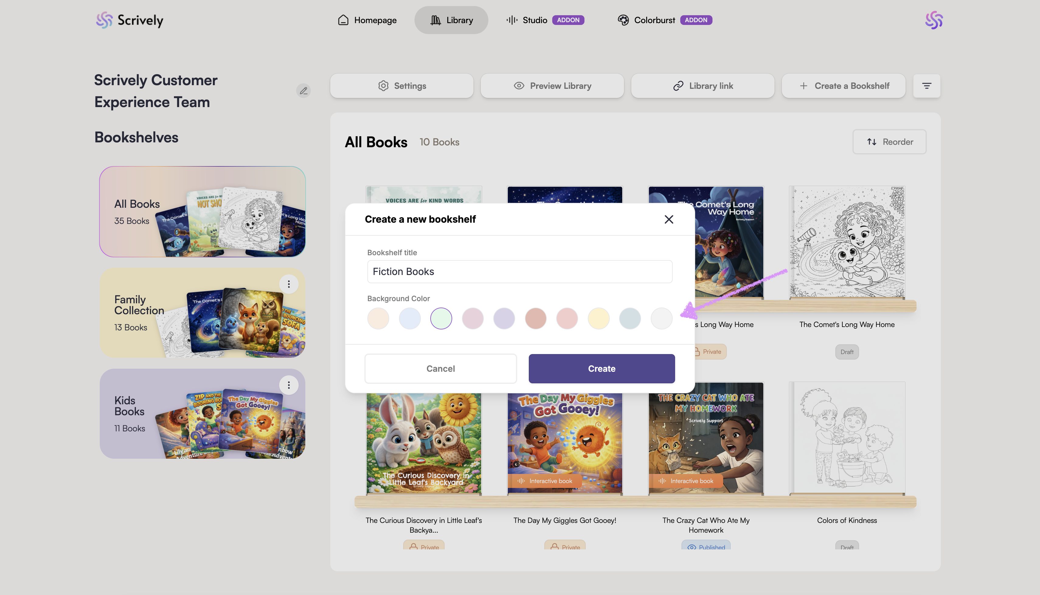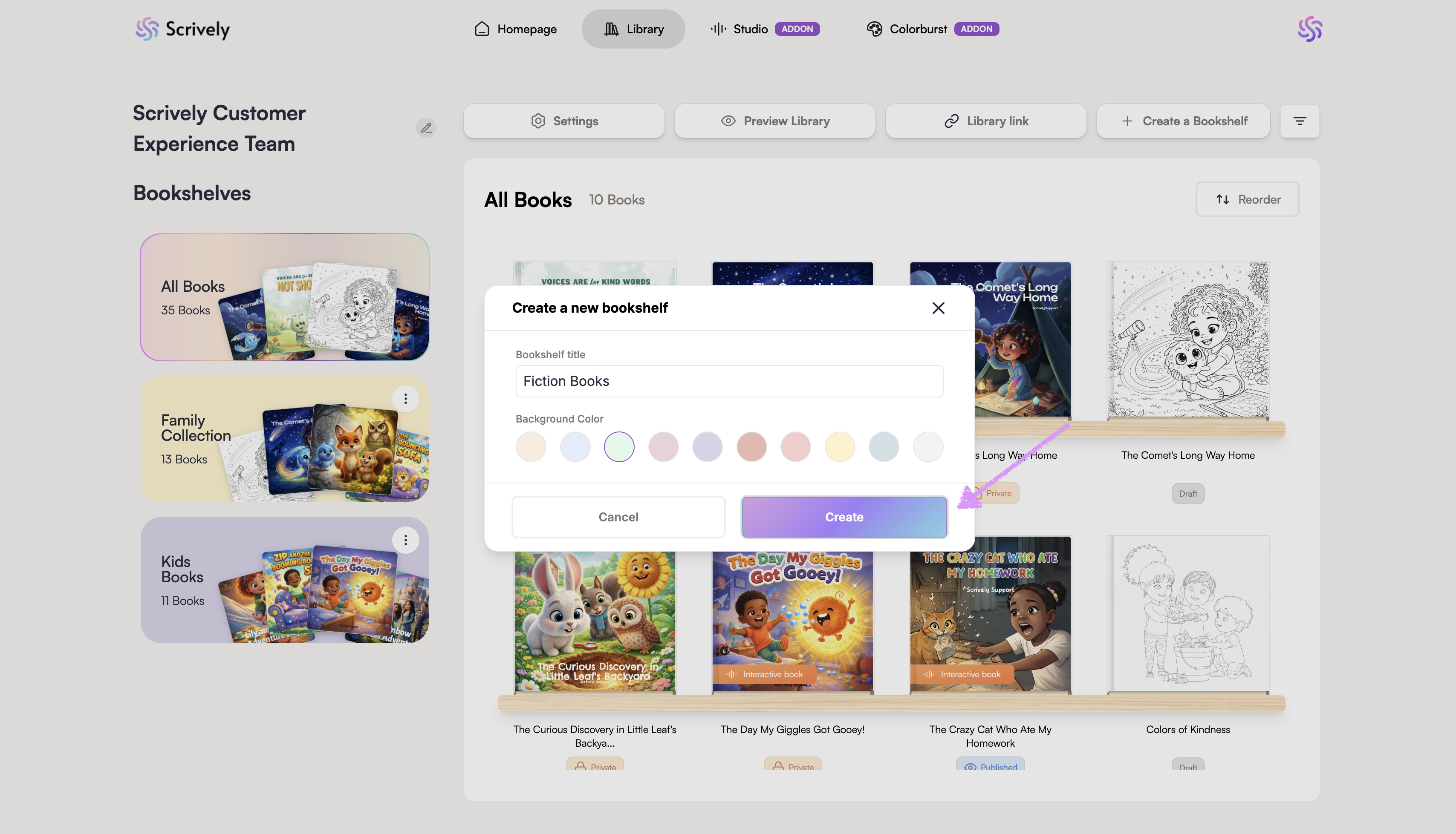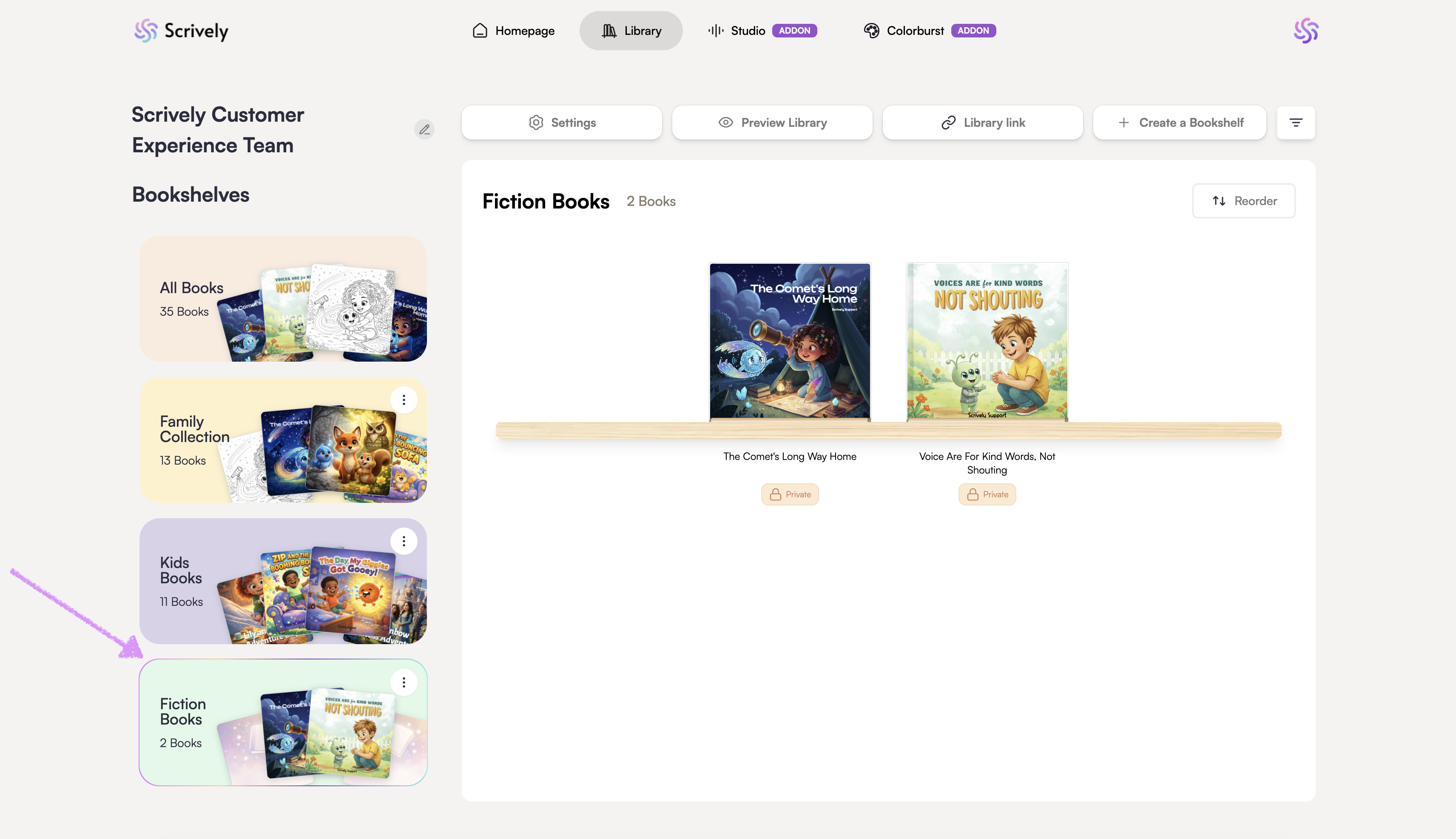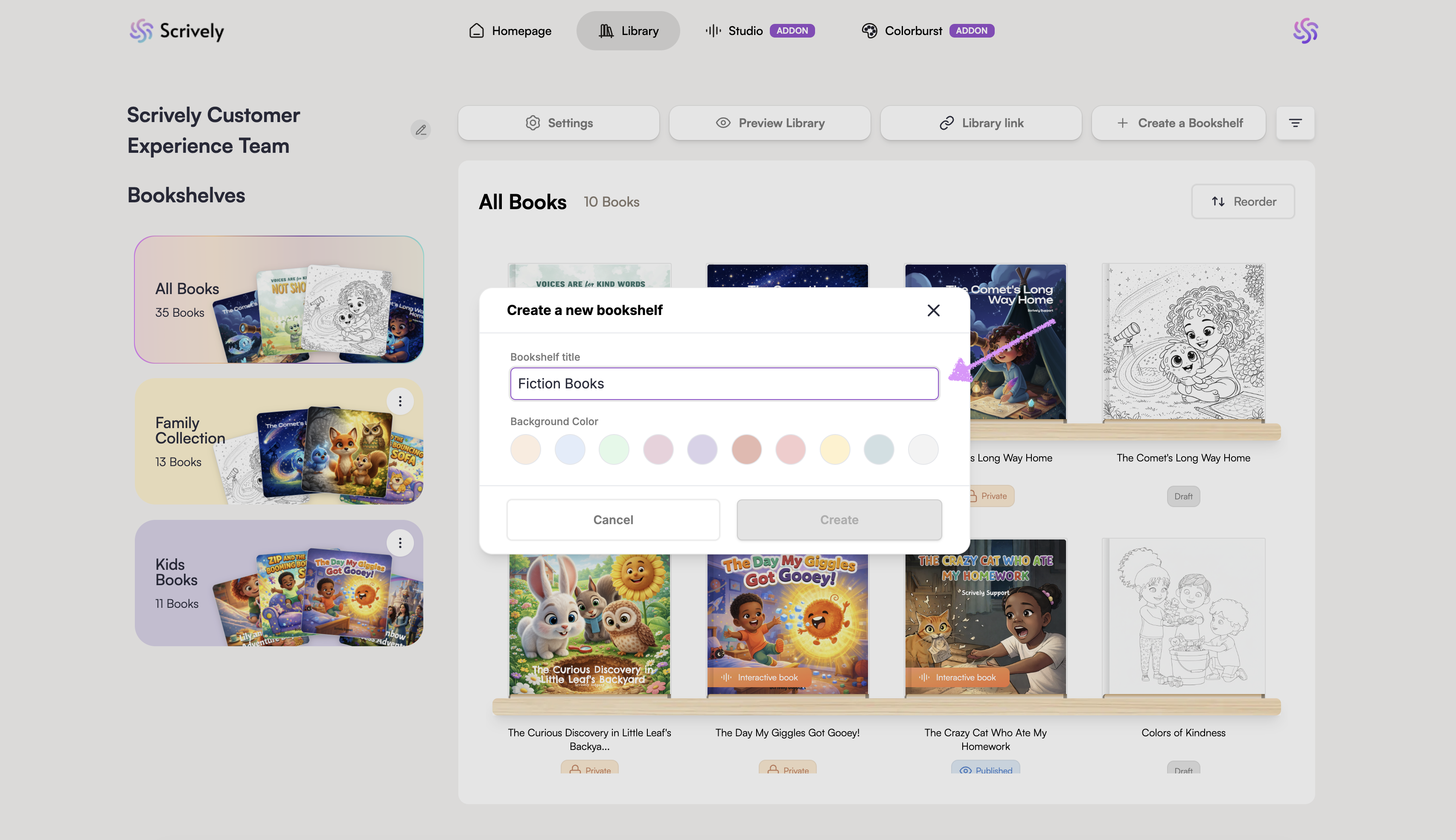 Keeping your projects organized is easy in Scrively. You can create folders/bookshelves to group your books by theme or project type. Adding a new folder takes just a few clicks and helps you keep your workspace tidy, so you can focus on creating instead of searching.