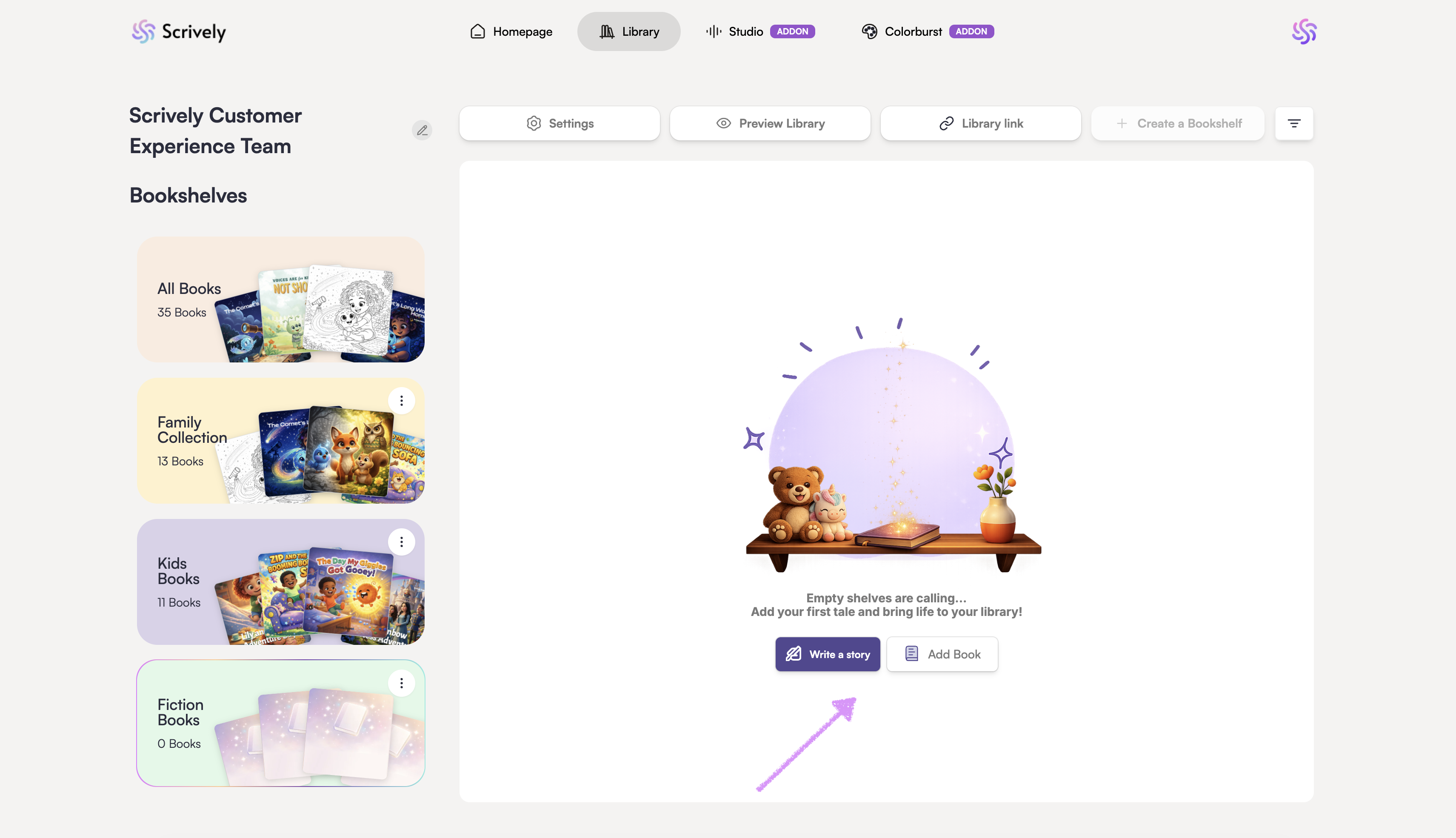 The bookshelf will be created and you will have the options to "Write a story" or "Add Book"when needed.