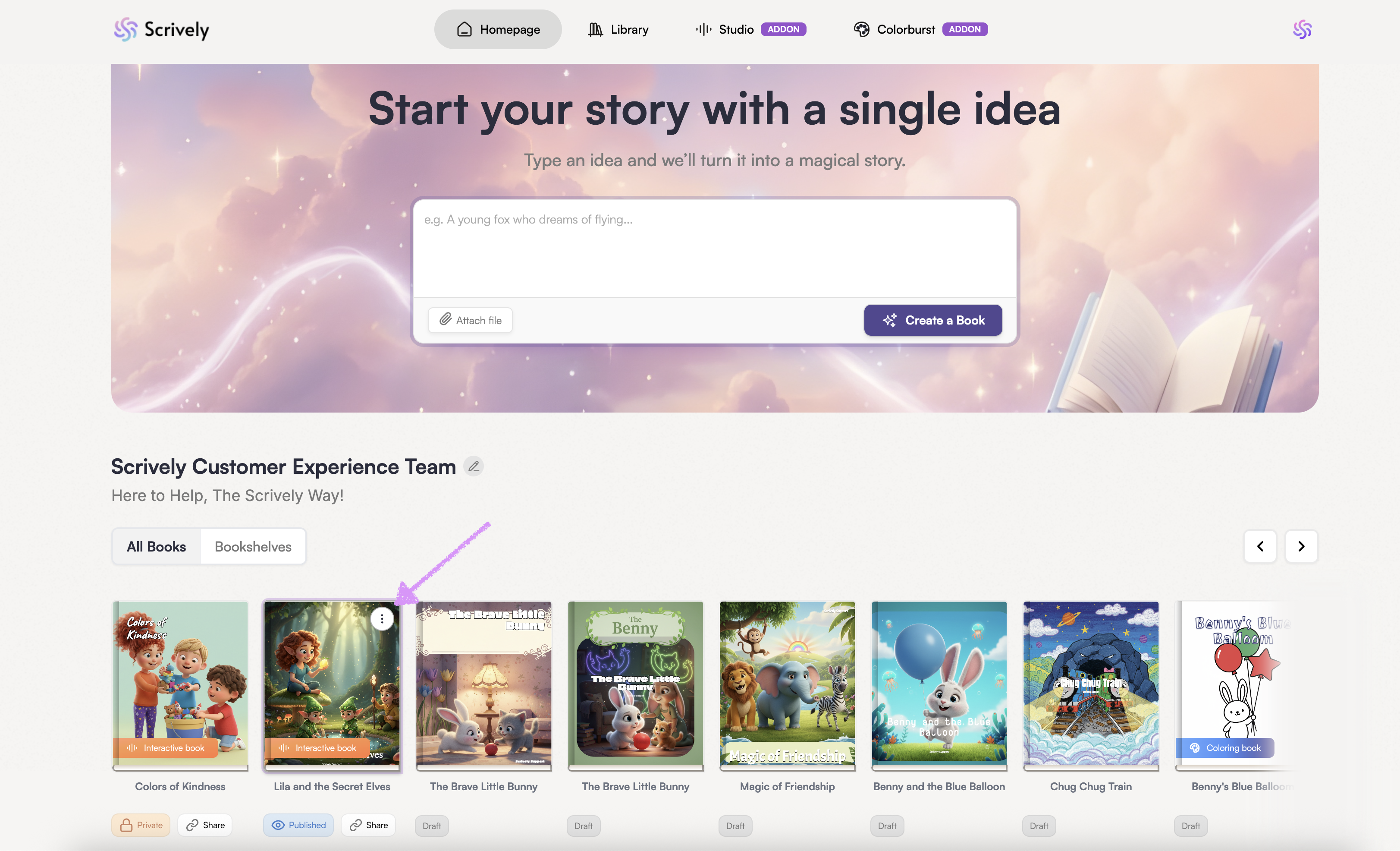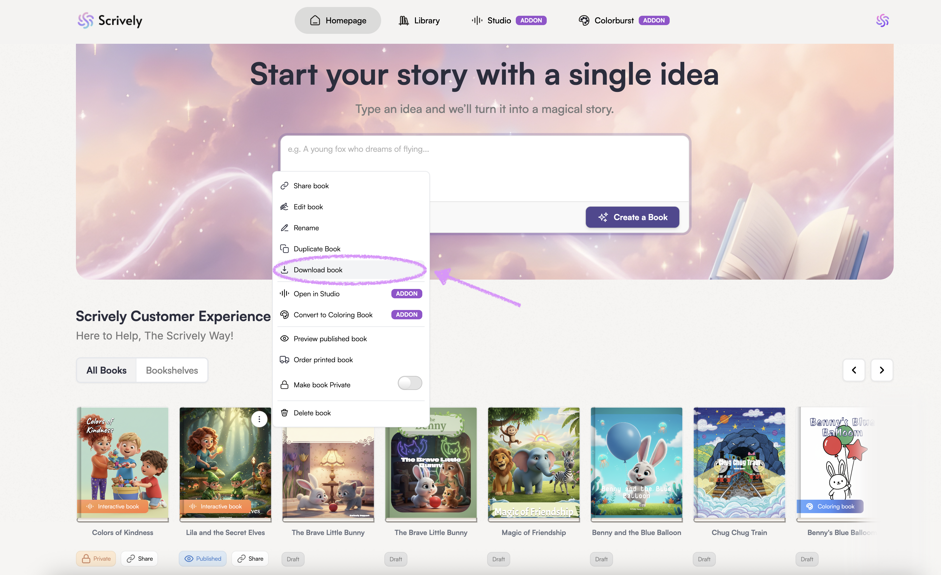 From your Scrively Homepage, go to your Bookshelf and hover over the book you’d like to export the audiobook for. Click the ellipsis (⋮) menu that appears.