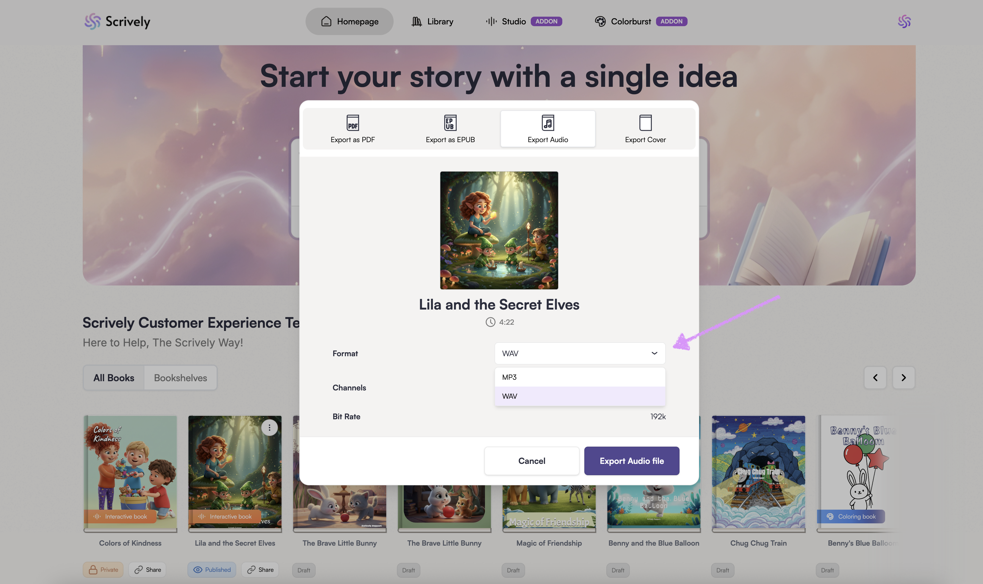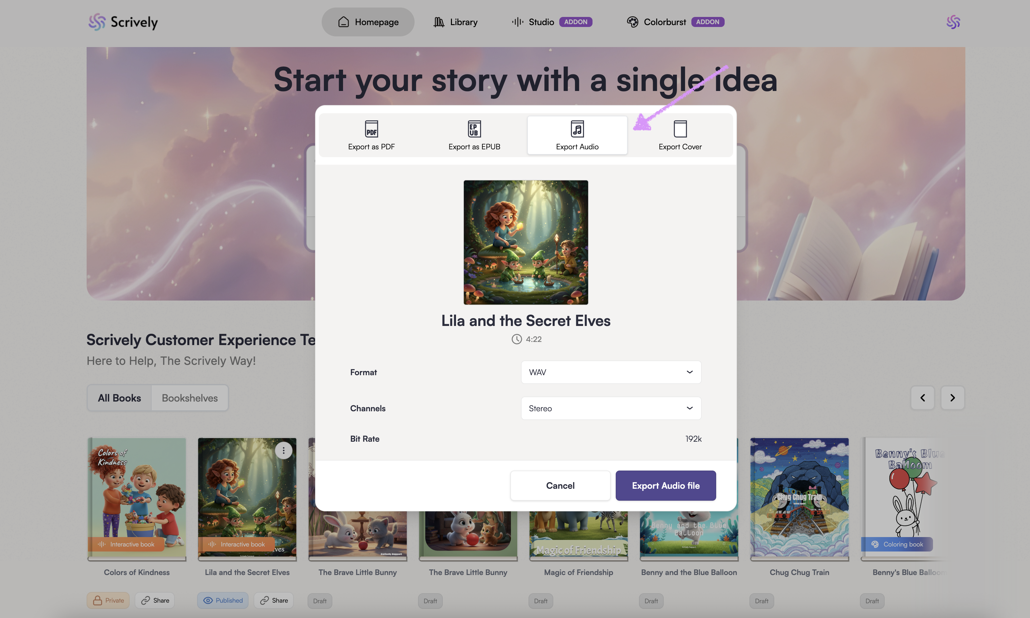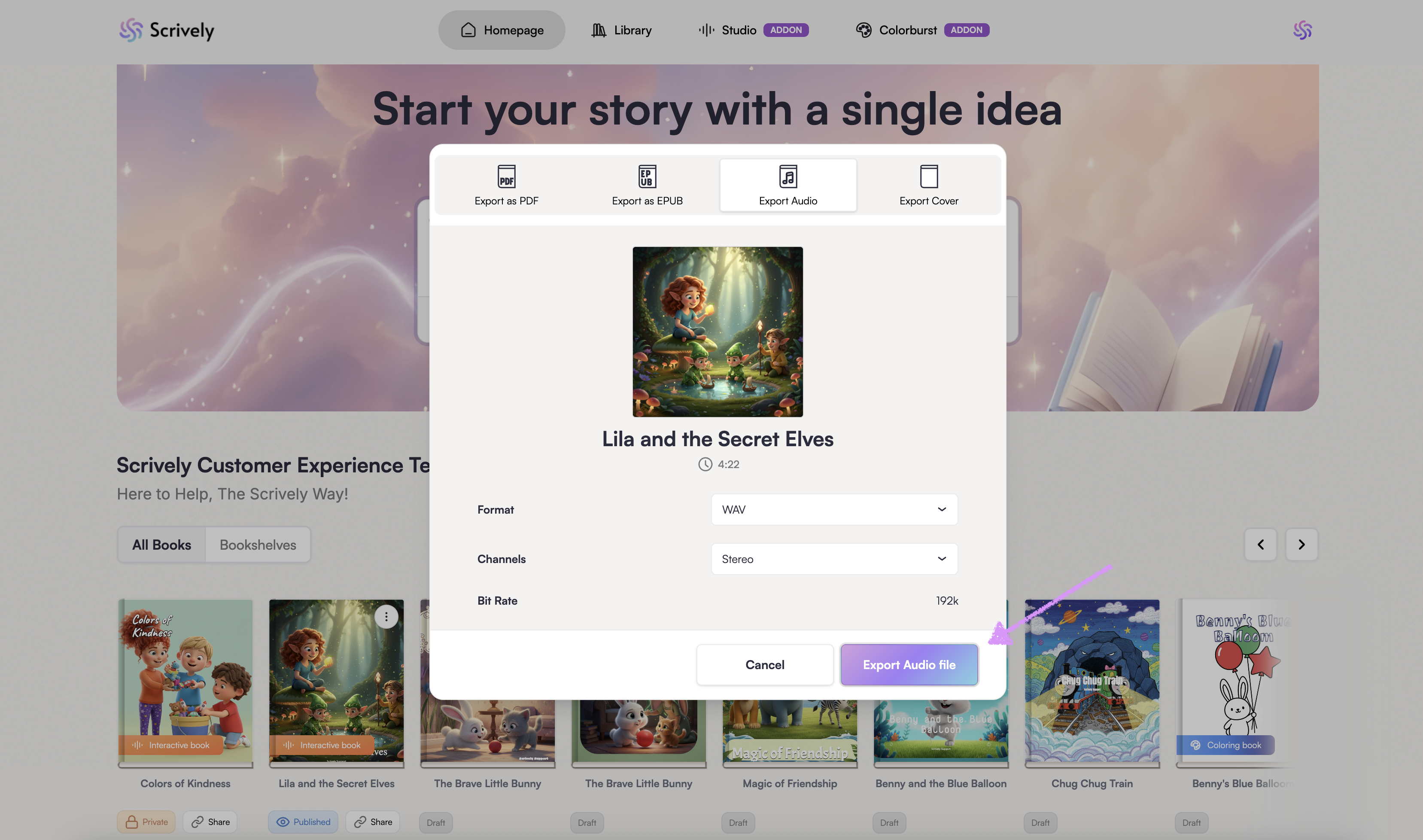Want to share your narrated story beyond Scrively? You can easily export it as an audiobook to download, share on social media, or save for later. This lets more listeners enjoy your story wherever they are.
