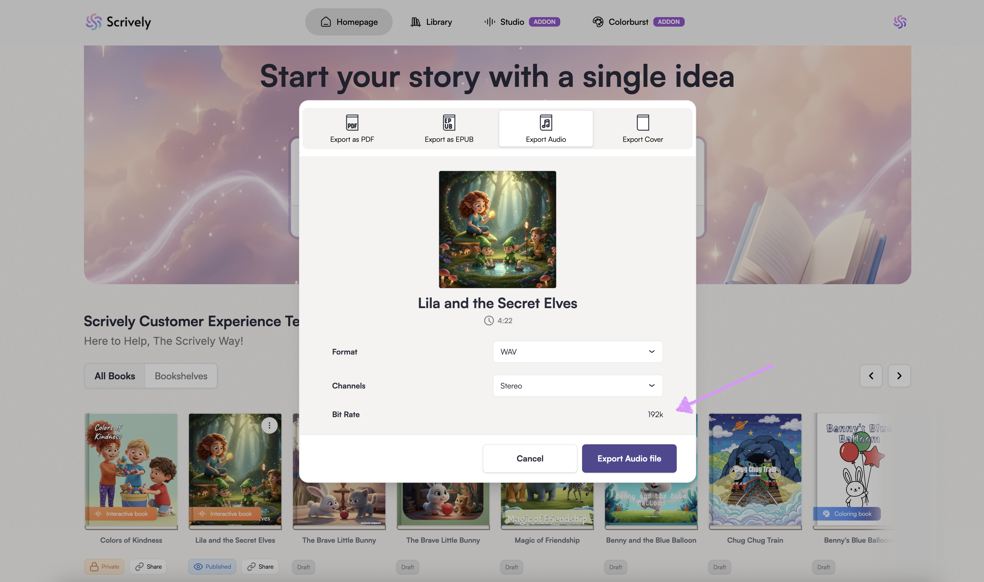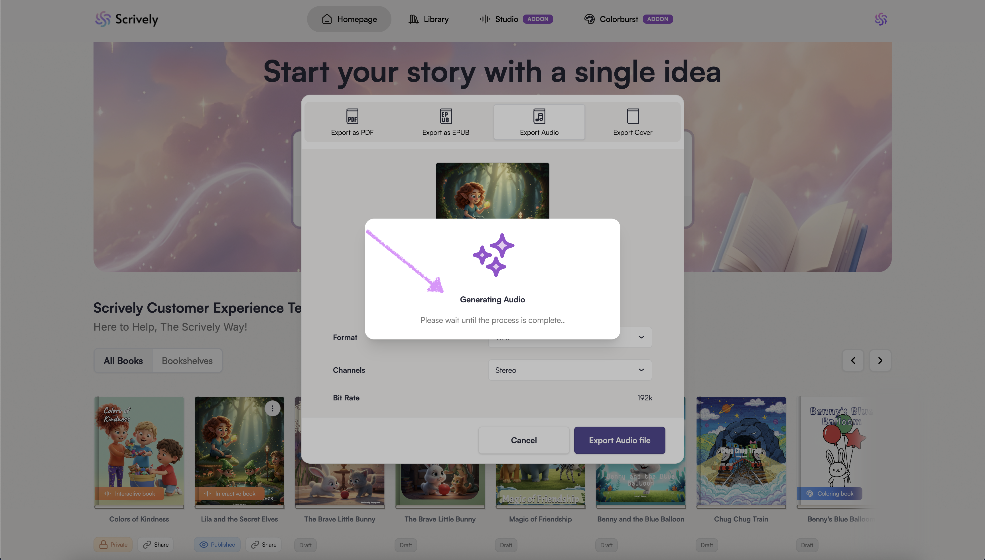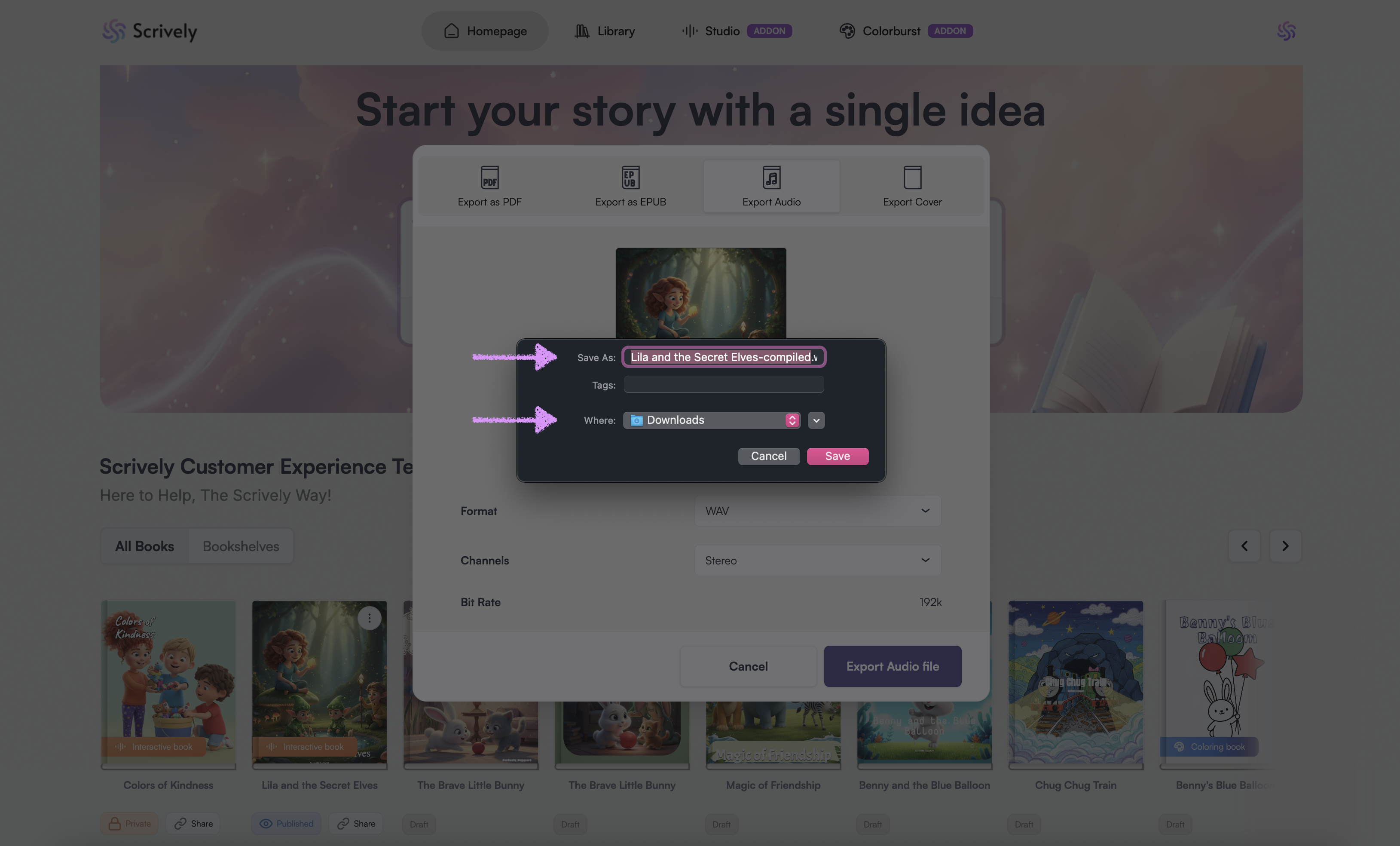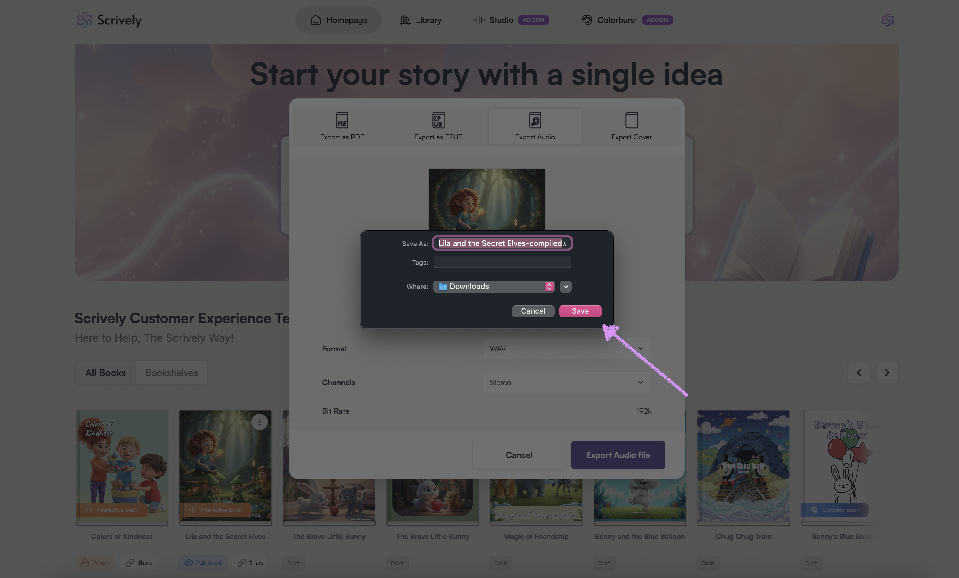 Want to share your narrated story beyond Scrively? You can easily export it as an audiobook to download, share on social media, or save for later. This lets more listeners enjoy your story wherever they are.