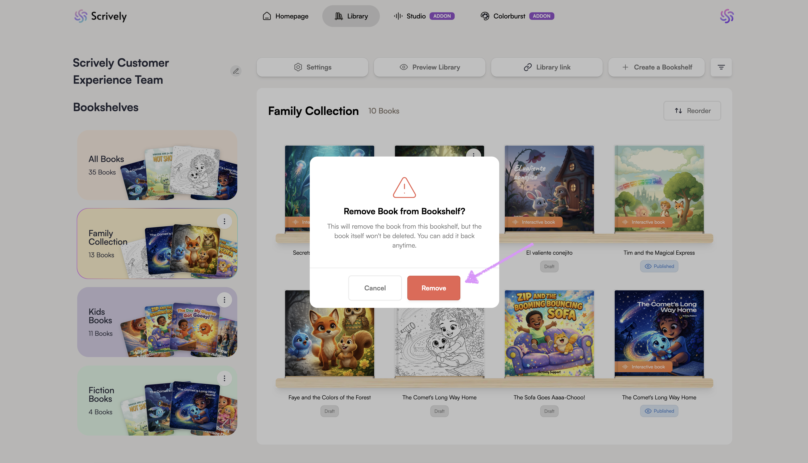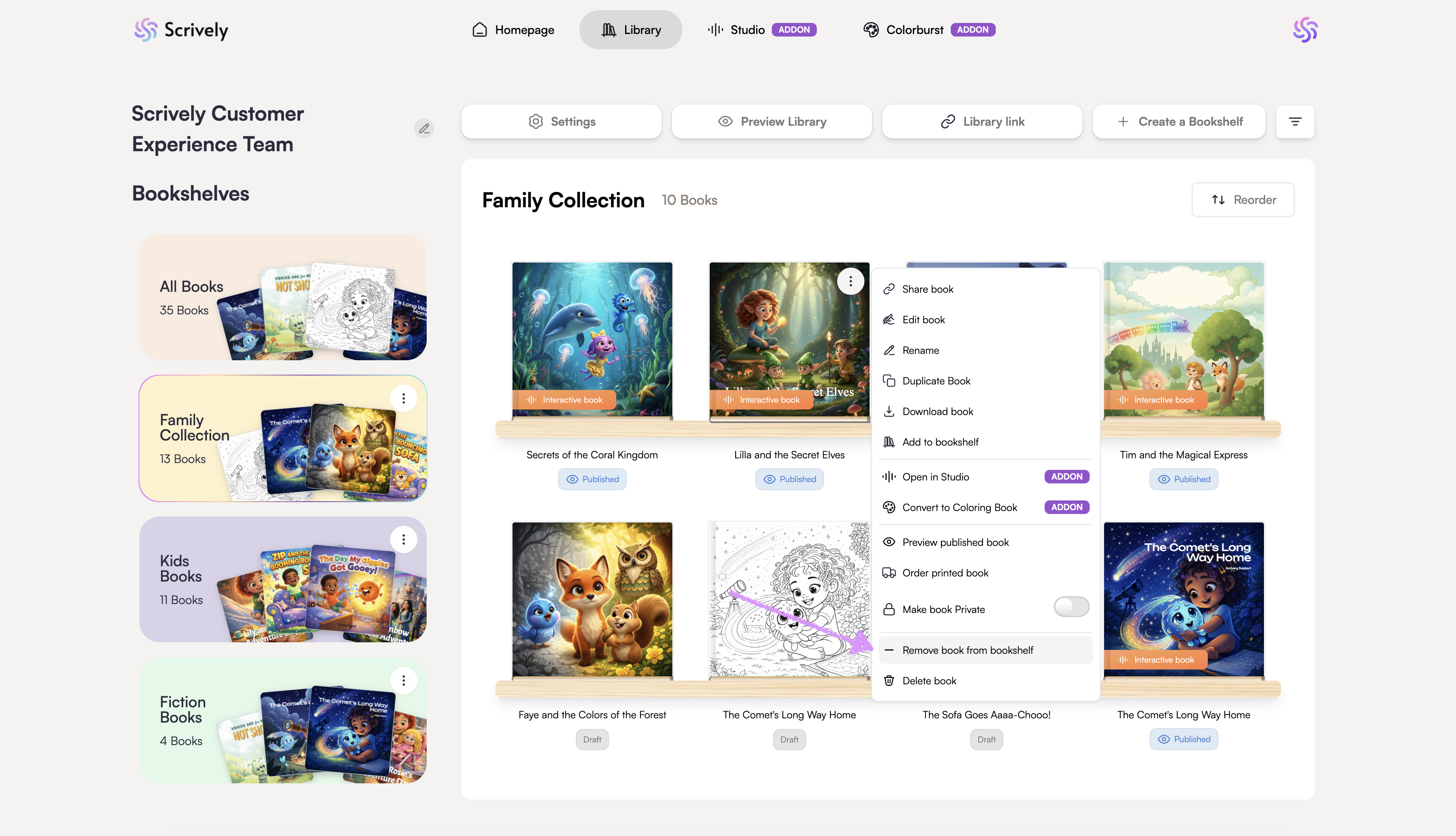 Keeping your Scrively library tidy is simple when you can quickly move books where they belong. If you’ve placed a book on the wrong shelf or just want to reorganize, removing it from a bookshelf only takes a moment.