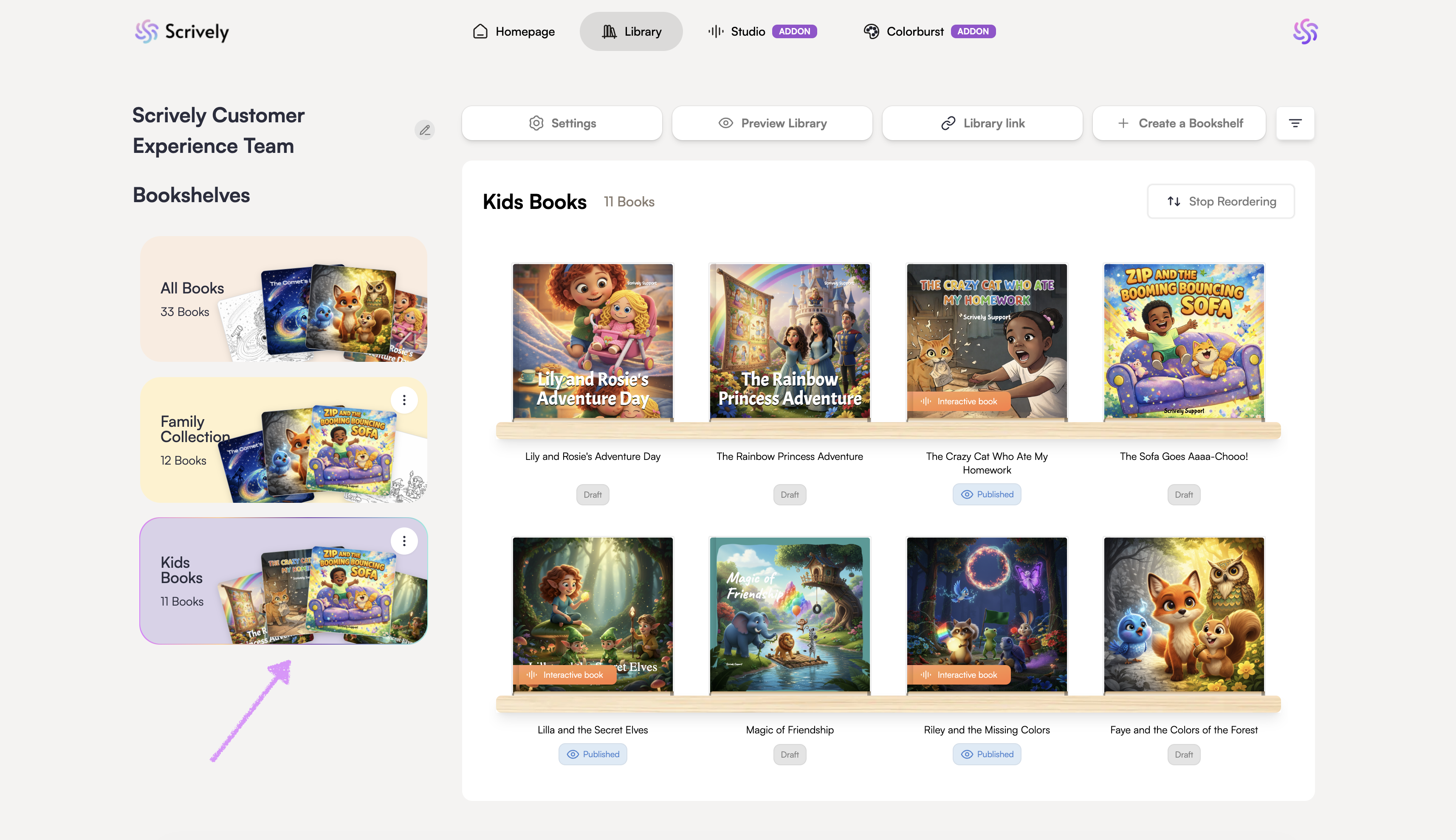 Keeping your Scrively library organized is simple when you can quickly switch between your bookshelves. Whether you’ve set up multiple shelves for different projects or genres, toggling between them helps you locate your stories faster and manage your collection more efficiently.