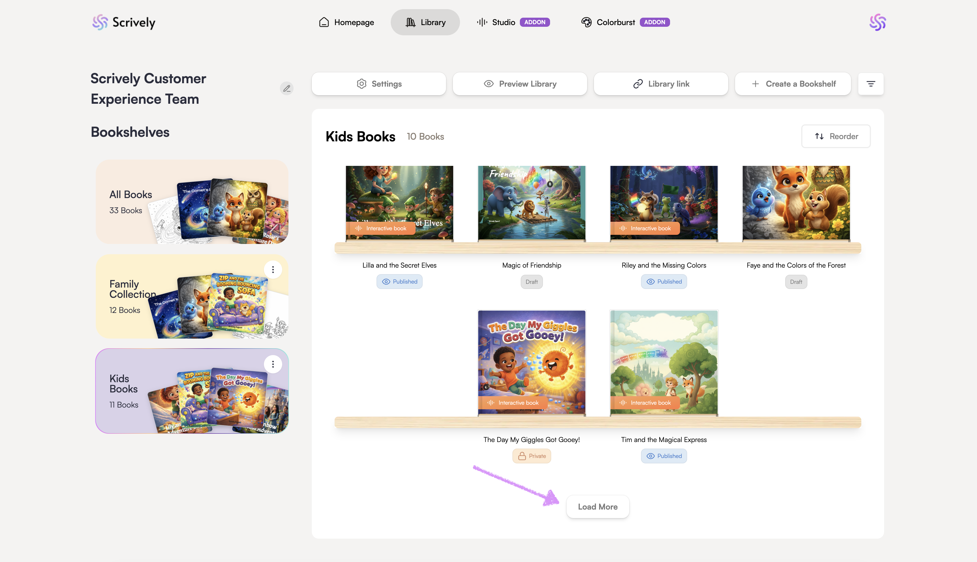 Scroll down to reveal the "Load More" button where applicable to view all books on the bookshelf.