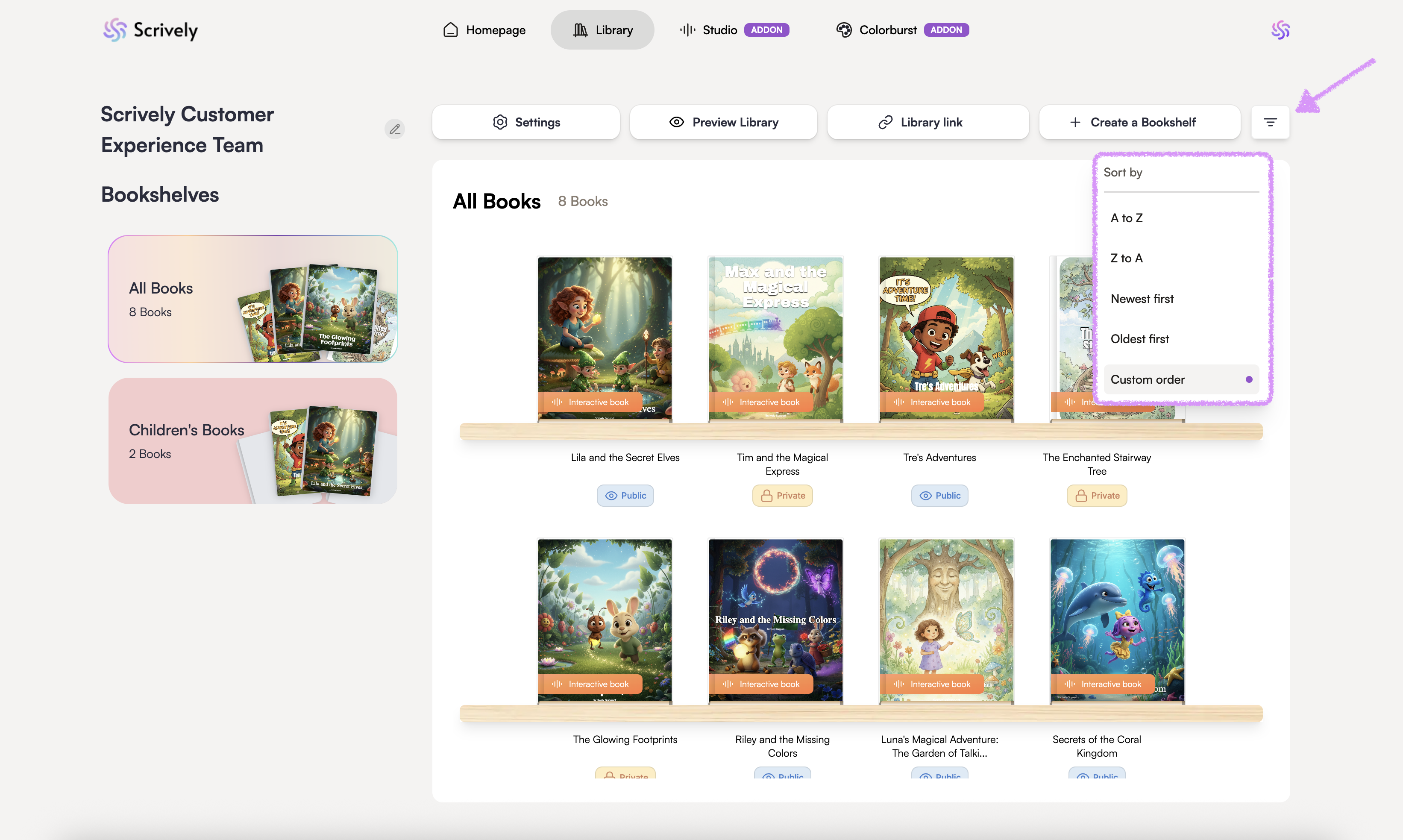 Keeping your library organized is easy when you can sort your bookshelves in Scrively. Sorting lets you arrange your books by title, date, or custom order, so you can quickly find what you need and manage your collection more efficiently.