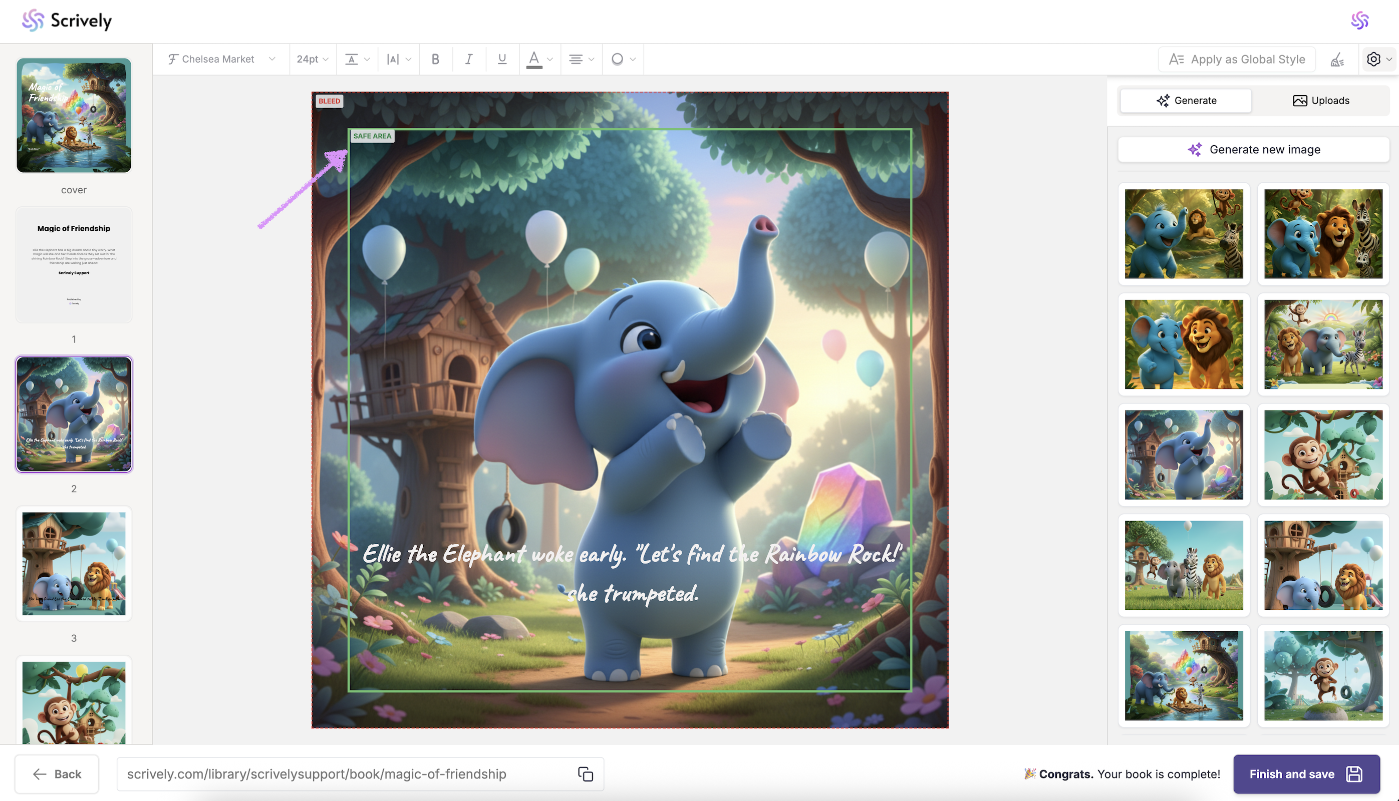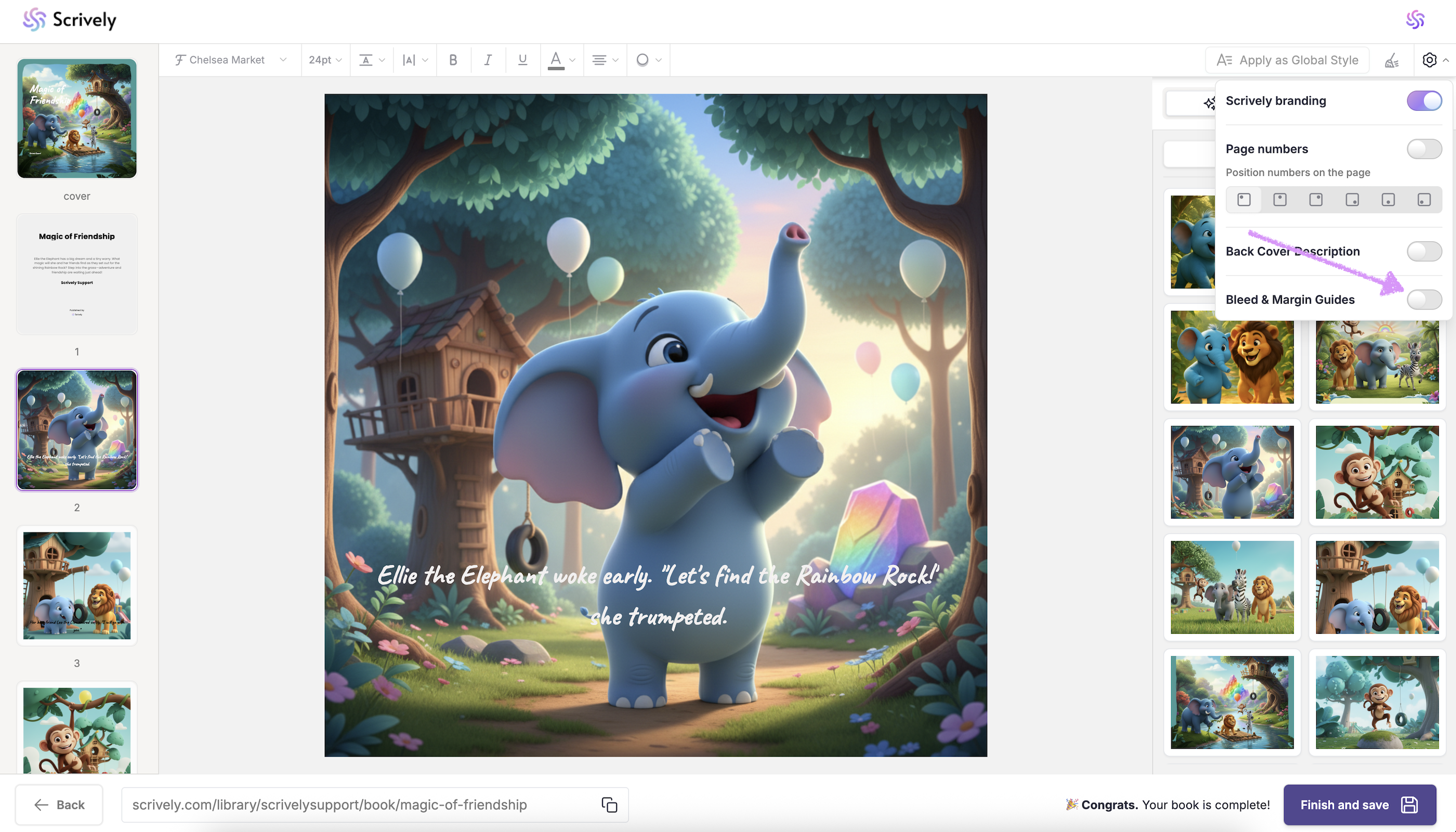 Once you turn on the “Bleed and Margin Guides,” they will appear on every page of your book. You can then adjust each page individually as needed to ensure your content stays within the safe area and extends properly to the bleed edges.
