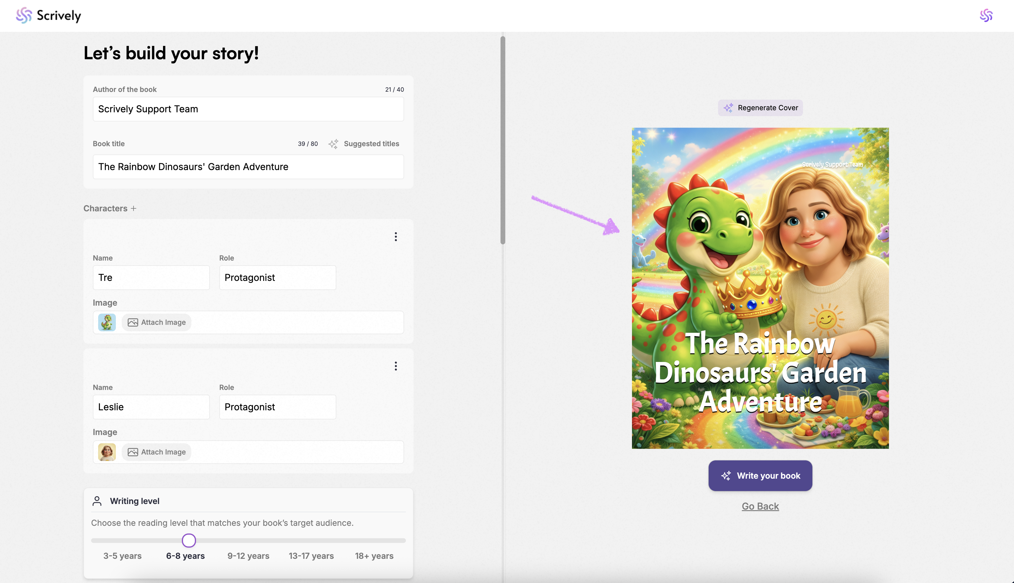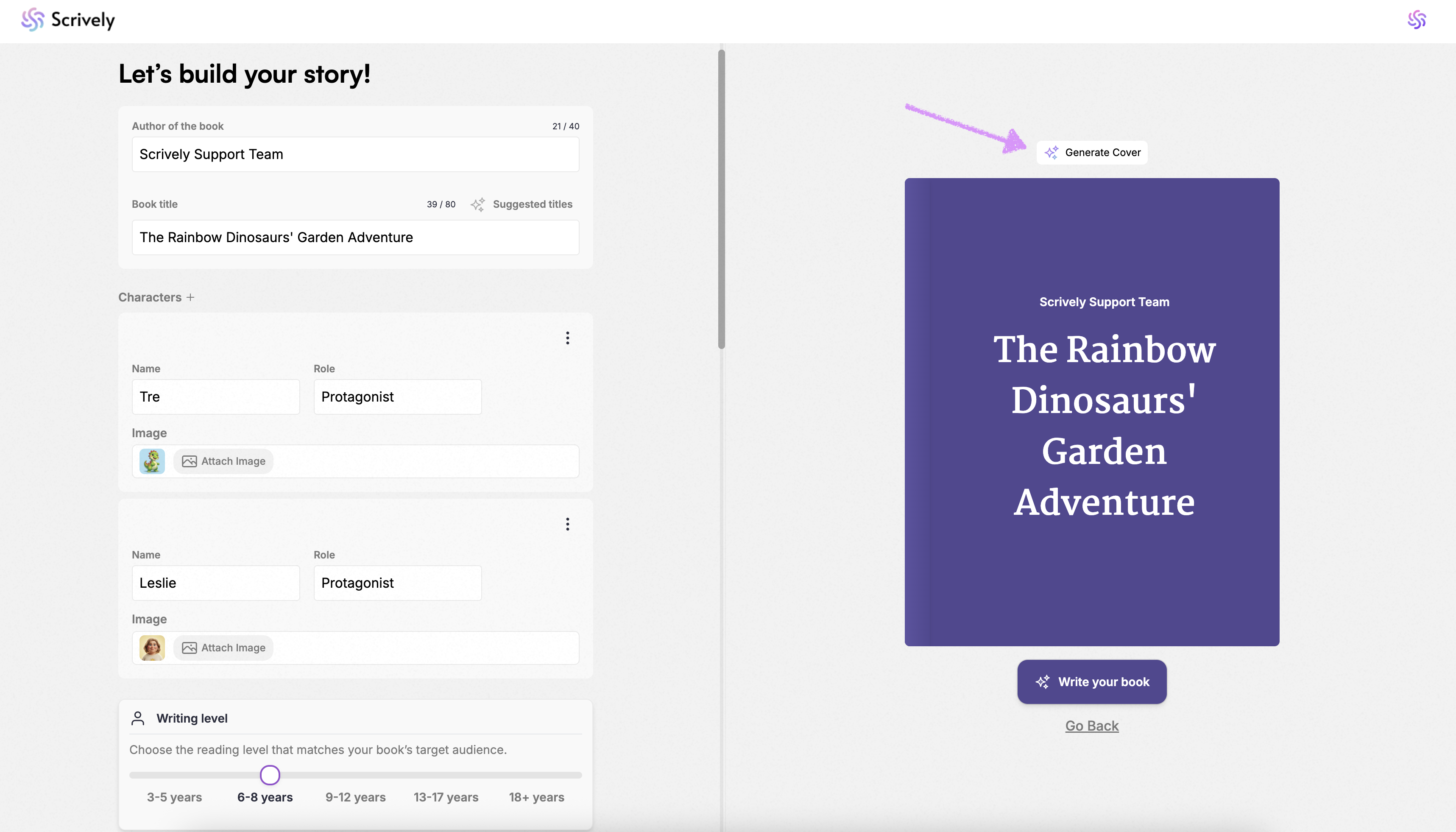 Create your book’s front cover in the Story Builder by generating a cover and fine-tuning the visuals and details to match your story.