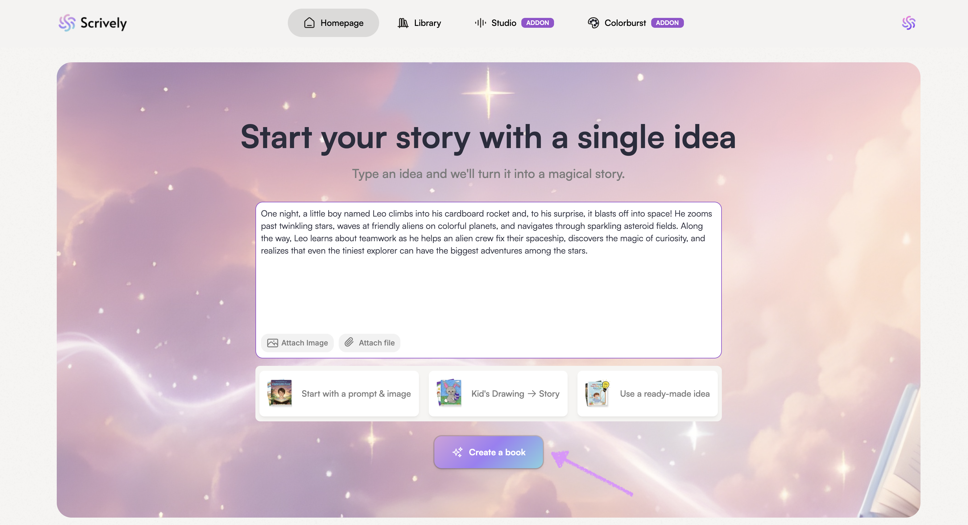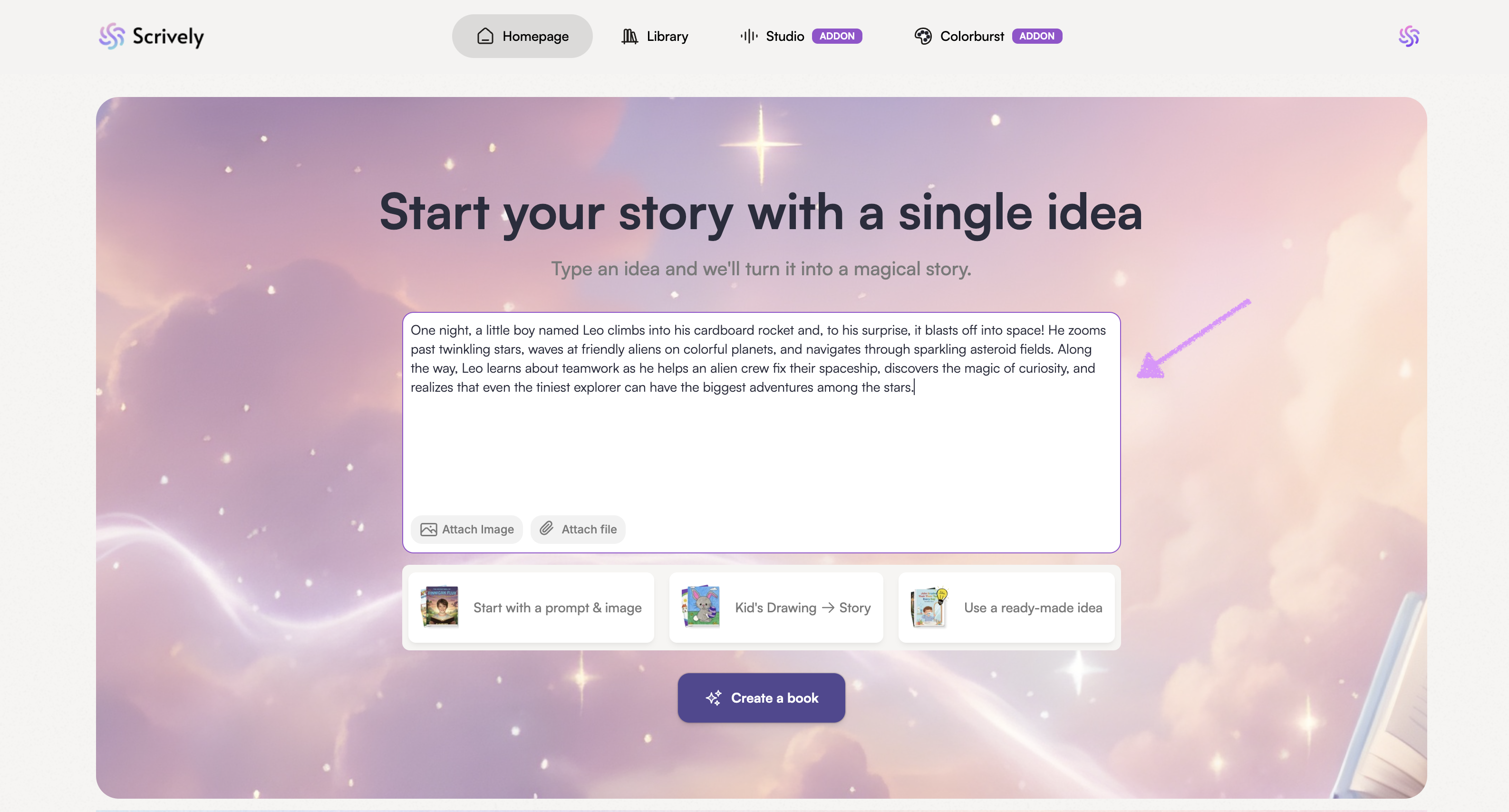 From the Homepage, in the story box, add your prompt. Be as detailed as possible to help Scrively better build your story and bring your vision to life.