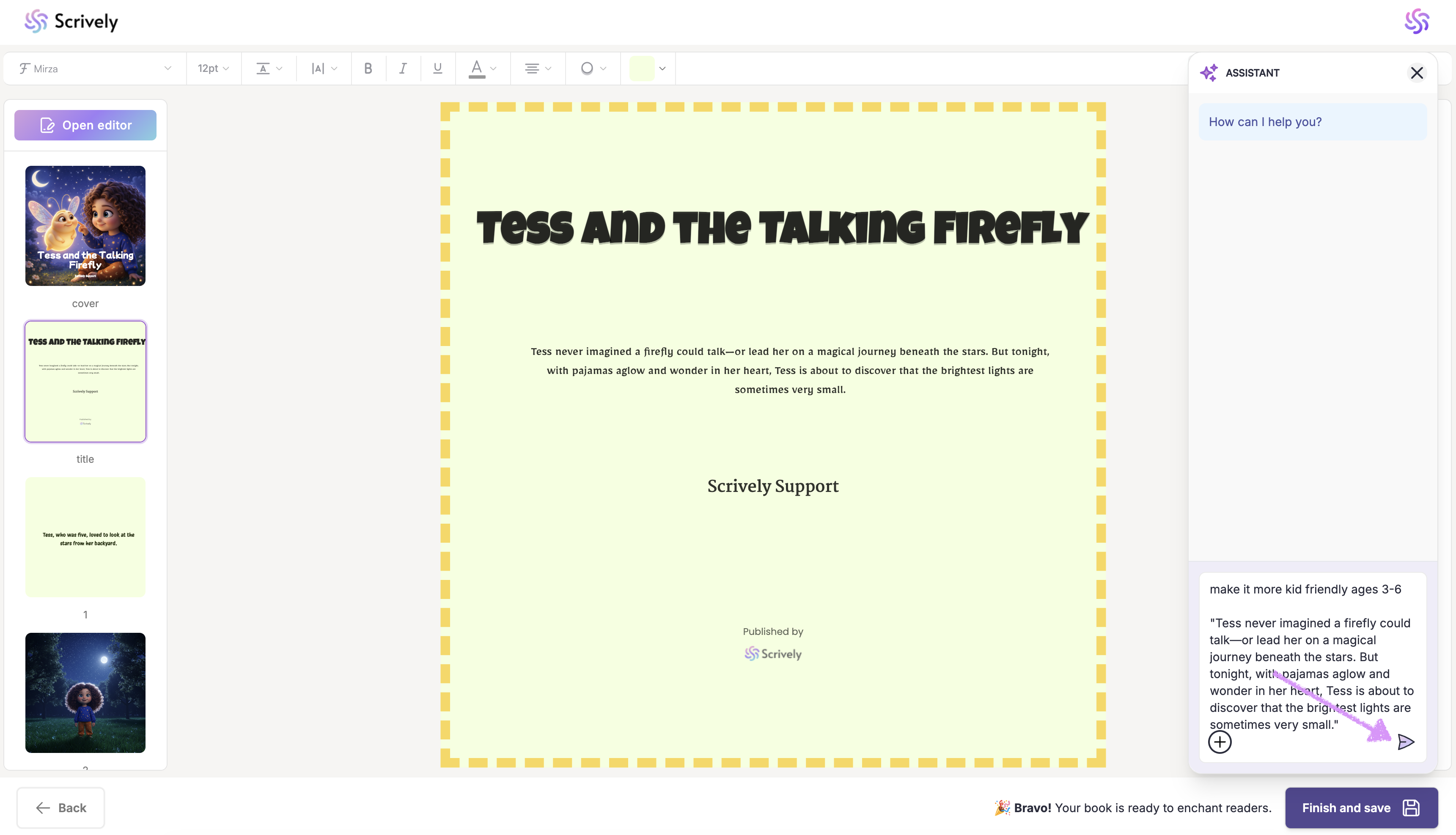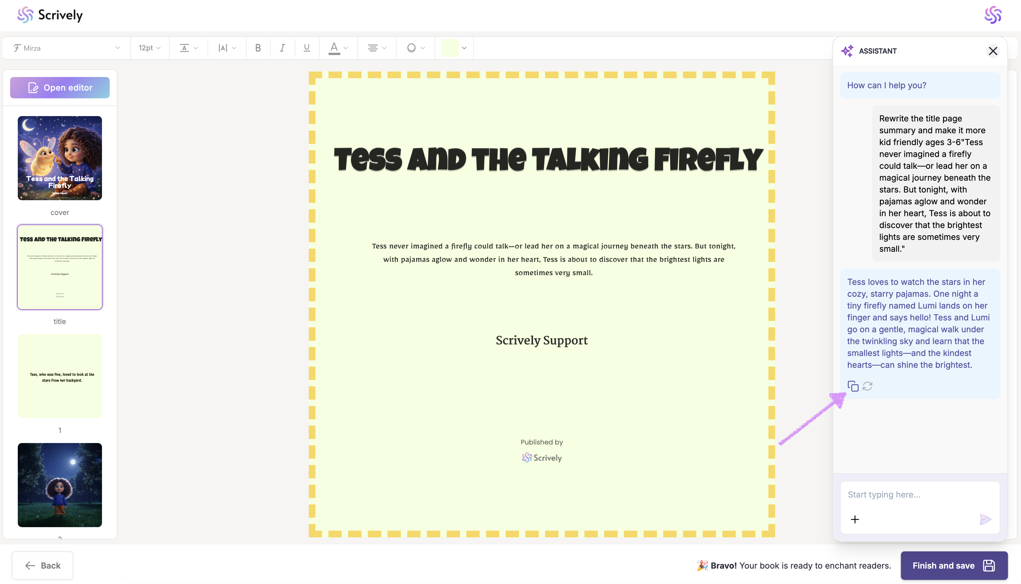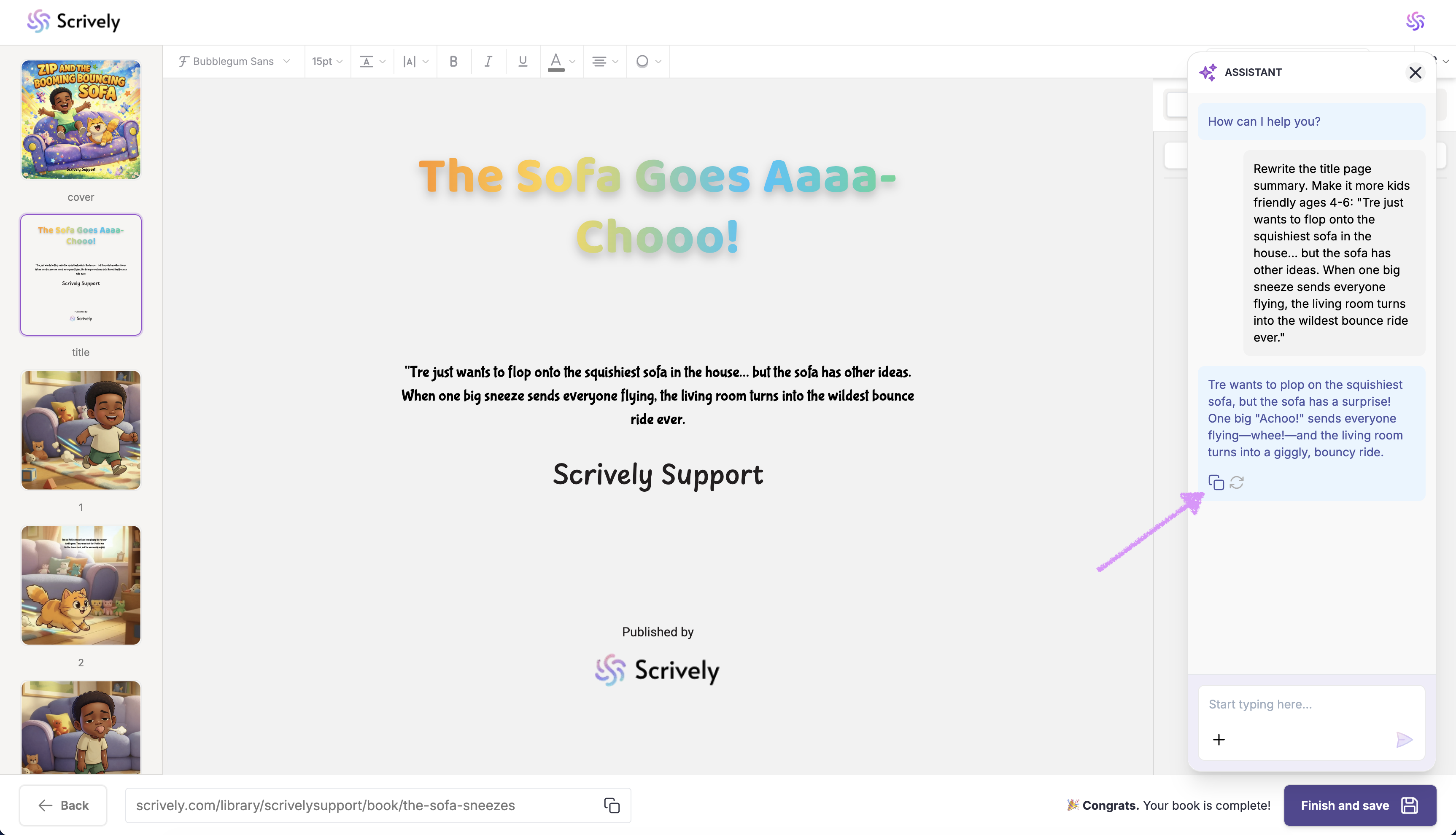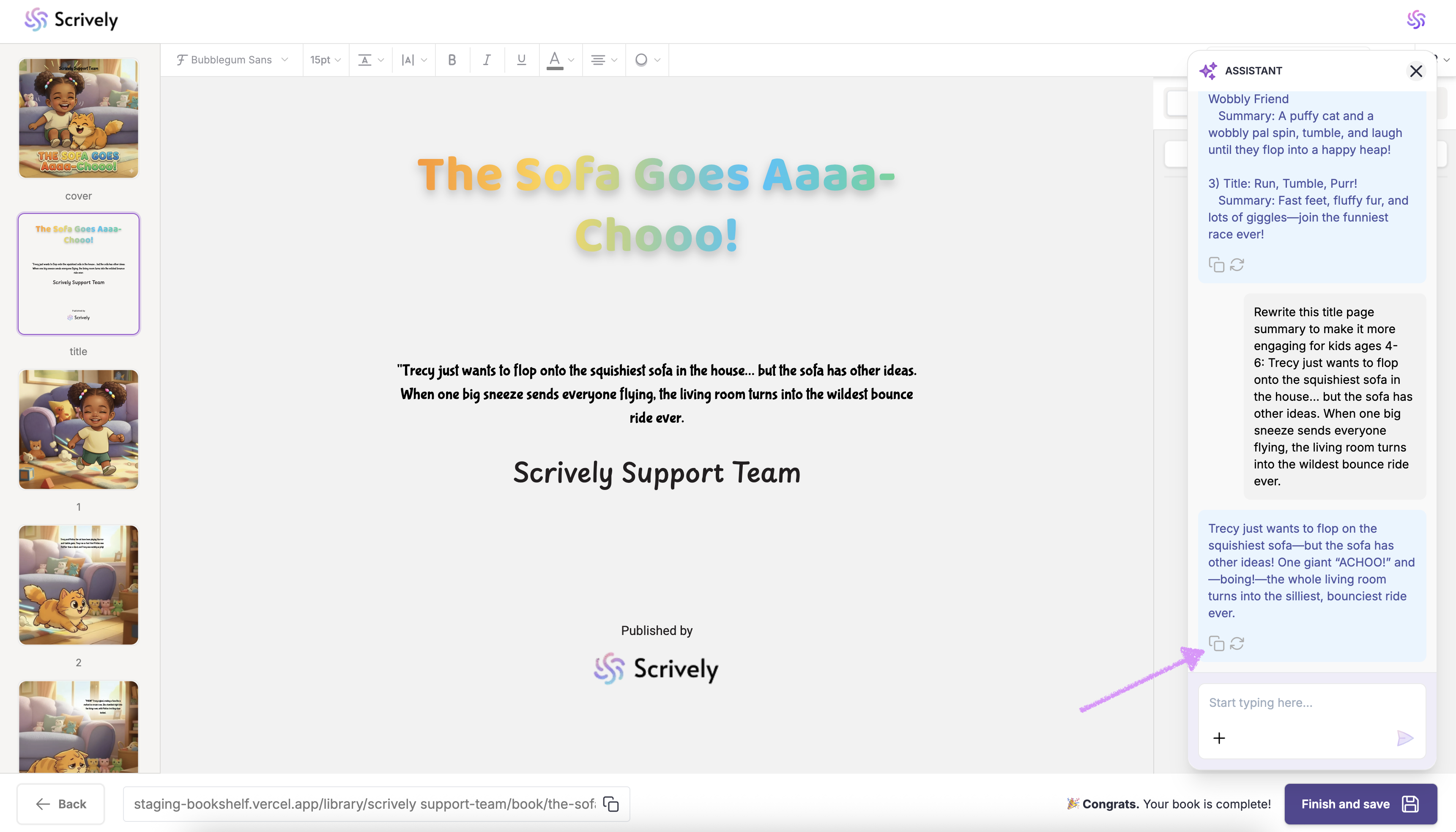 The Scrively Assistant is designed to make writing easier, not replace your creativity. By using it strategically, you can save time, stay inspired, and confidently bring your book to life. Experiment with different prompts to discover how the Assistant best supports your workflow.