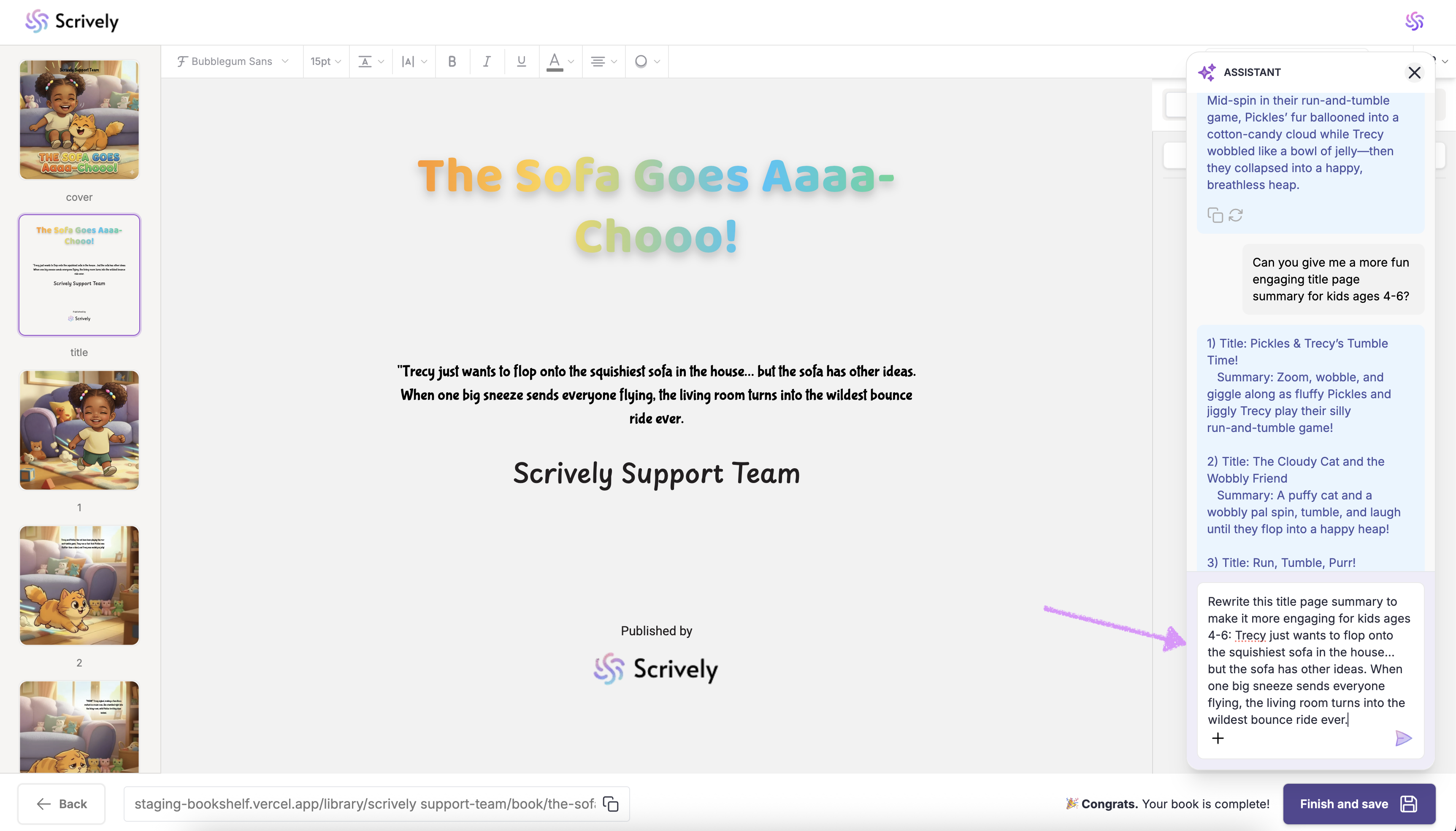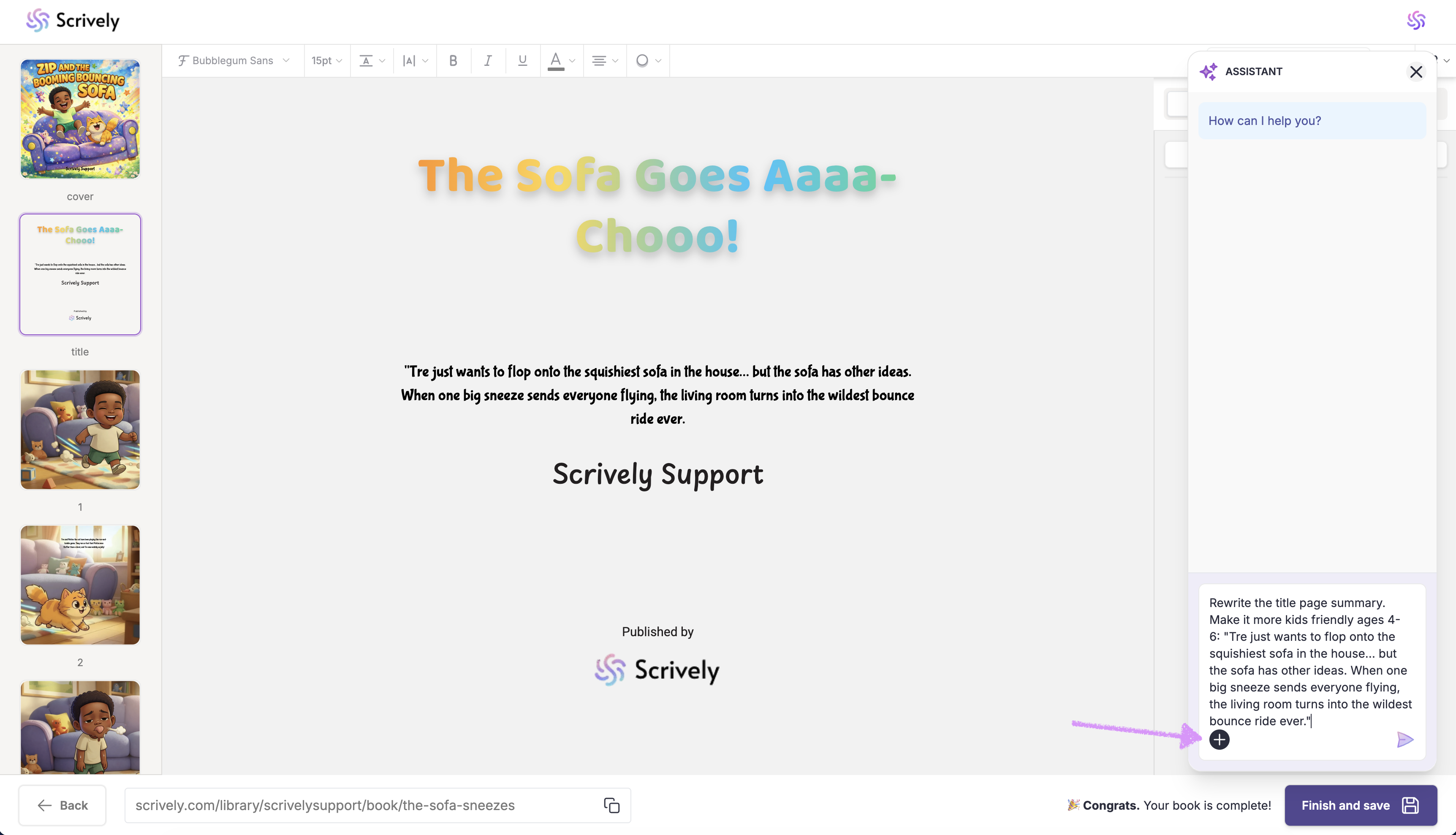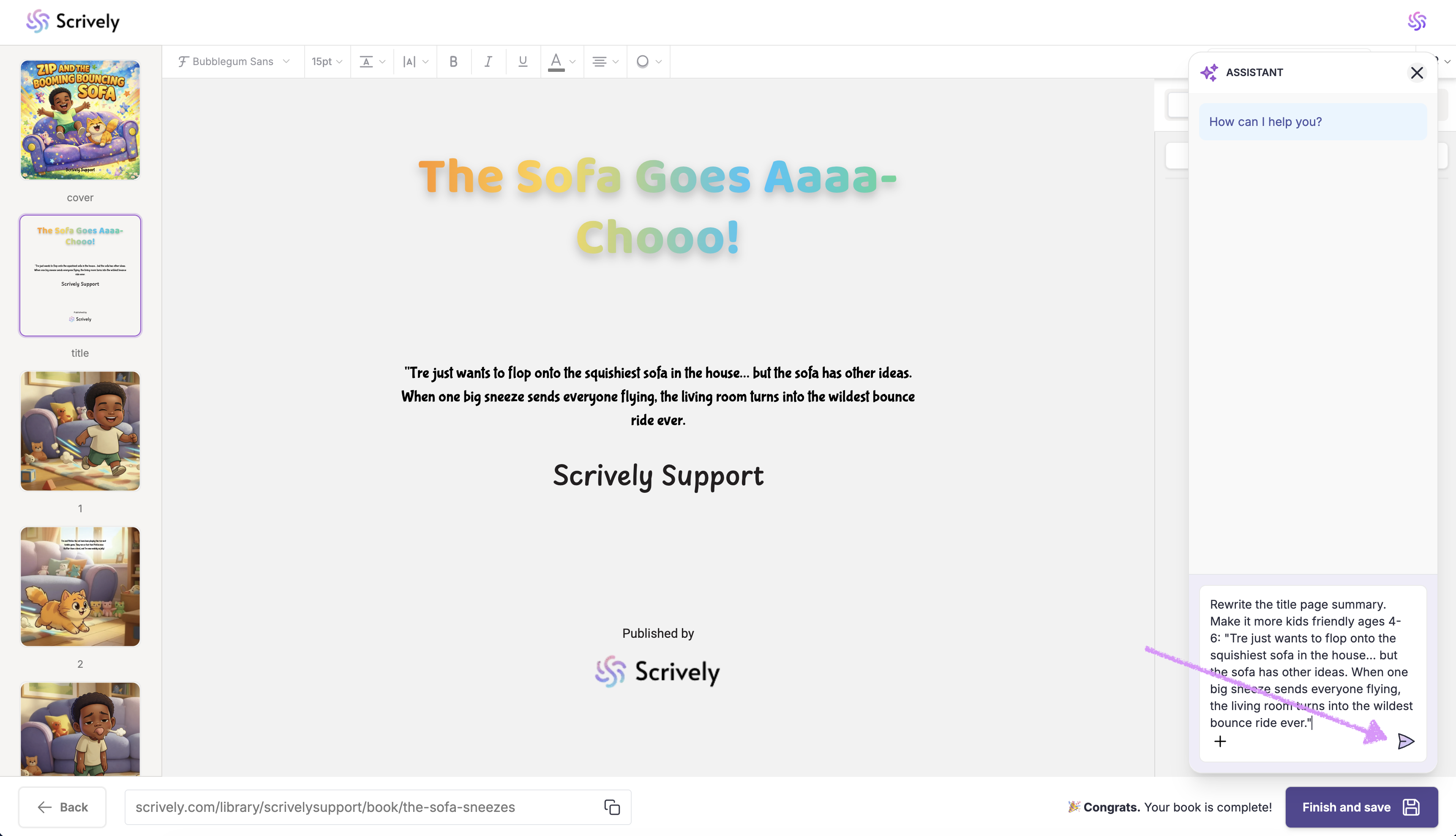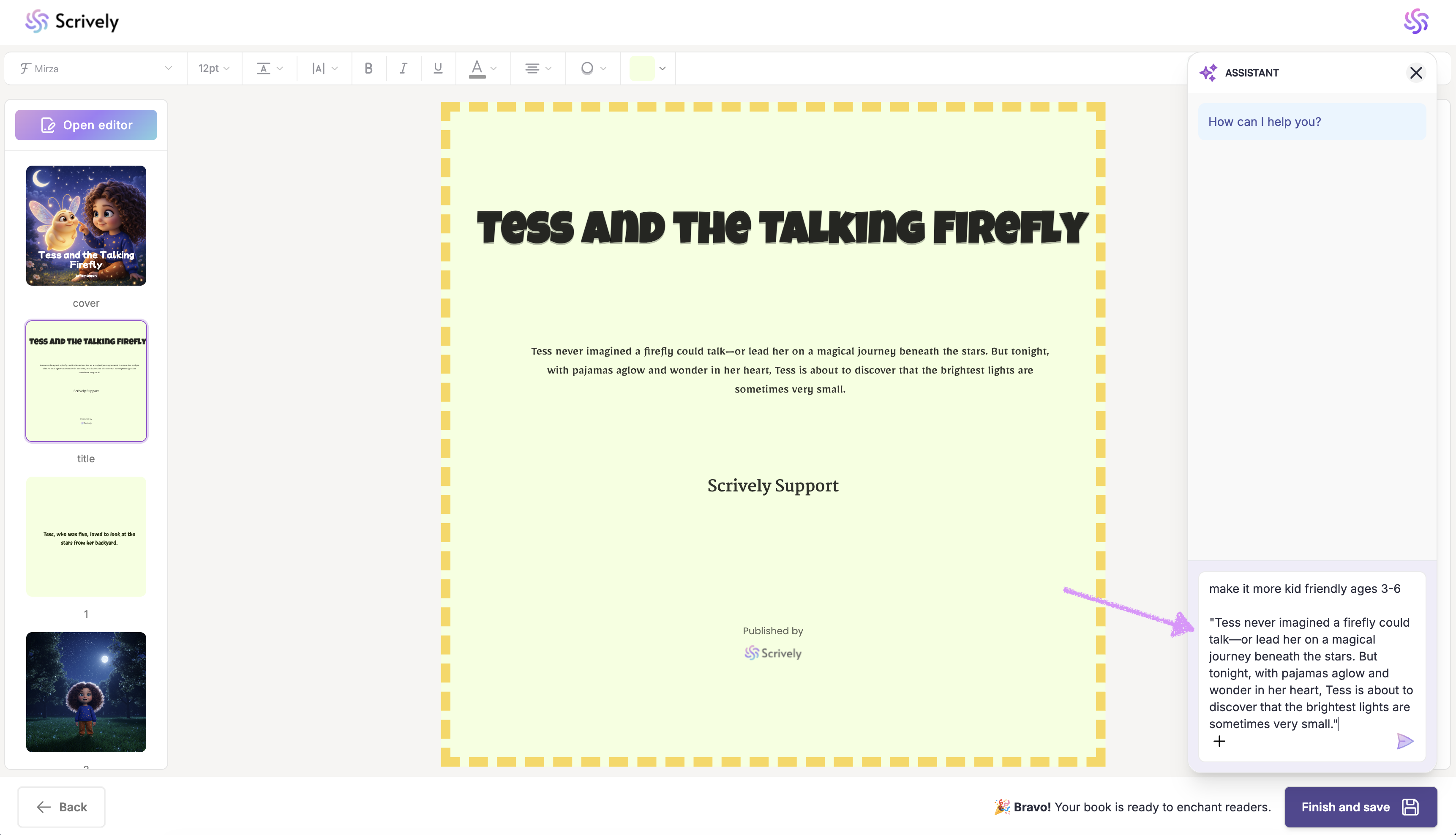The Scrively Assistant is designed to make writing easier, not replace your creativity. By using it strategically, you can save time, stay inspired, and confidently bring your book to life. Experiment with different prompts to discover how the Assistant best supports your workflow.