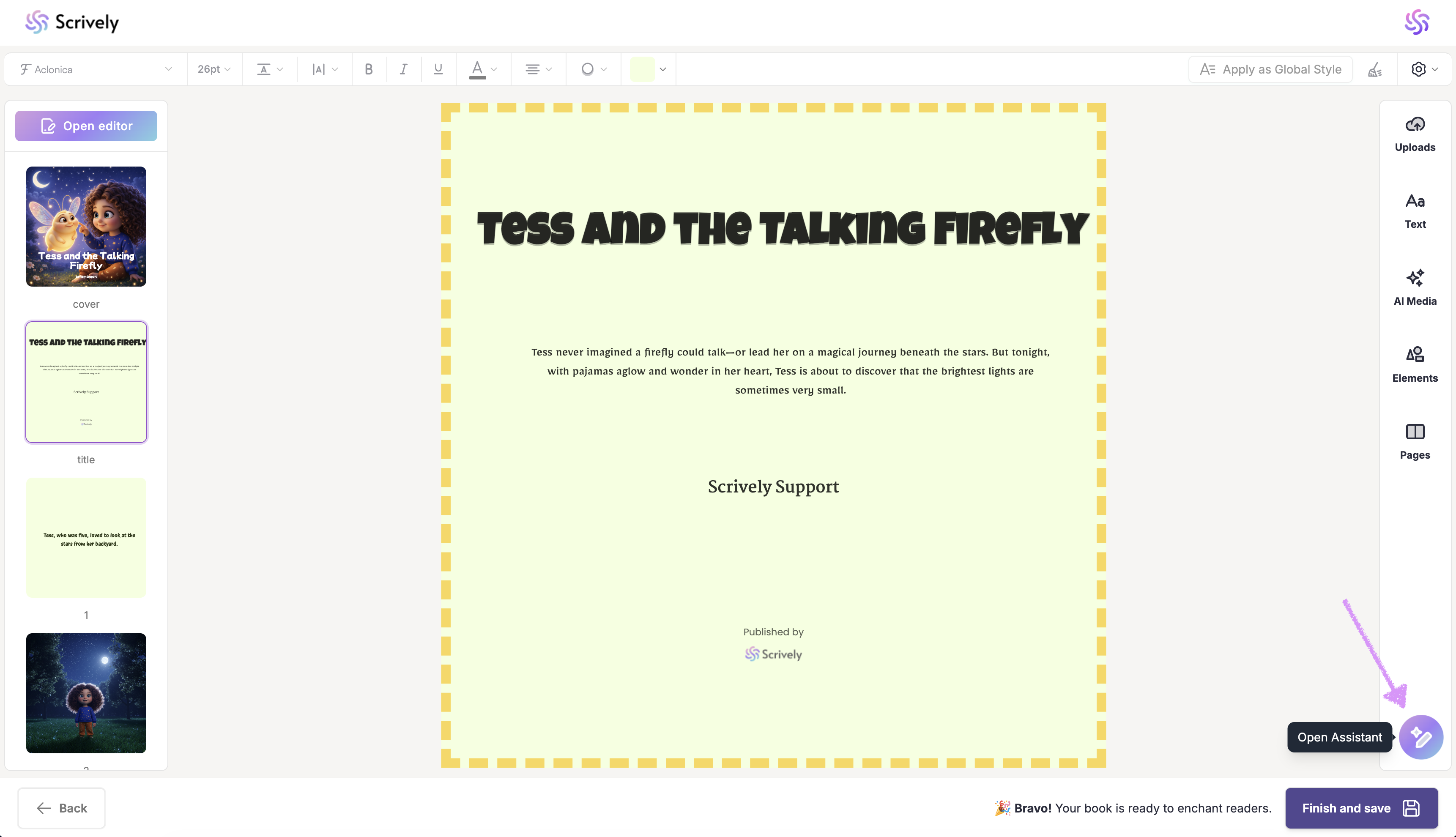 You can access the Scrively Assistant tool directly within the Designer (book layout view) on the bottom right side.