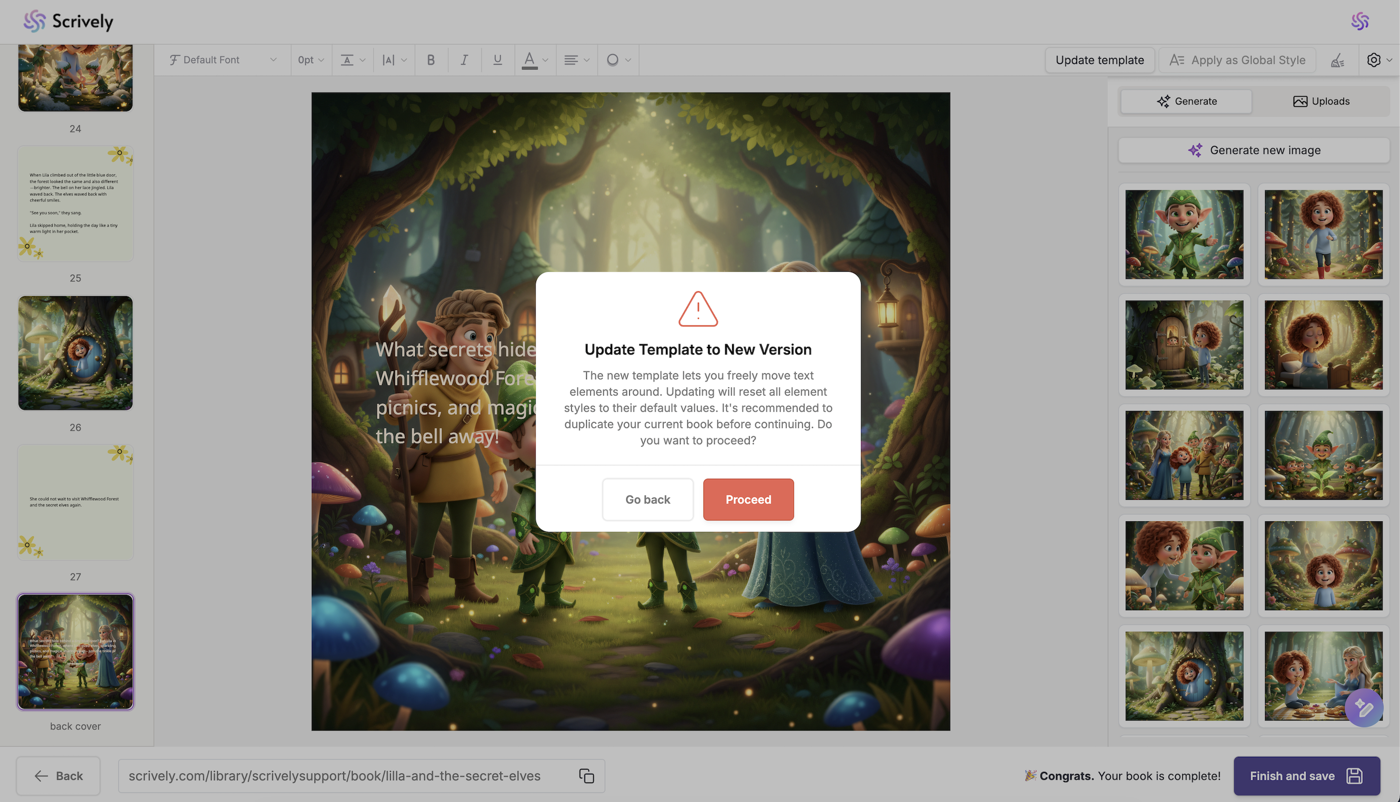 Clicking "Update template" opens a modal showing the details of the update and any expected changes. Click "Proceed" to apply the update, or "Go back" to continue working with the template in its current state.