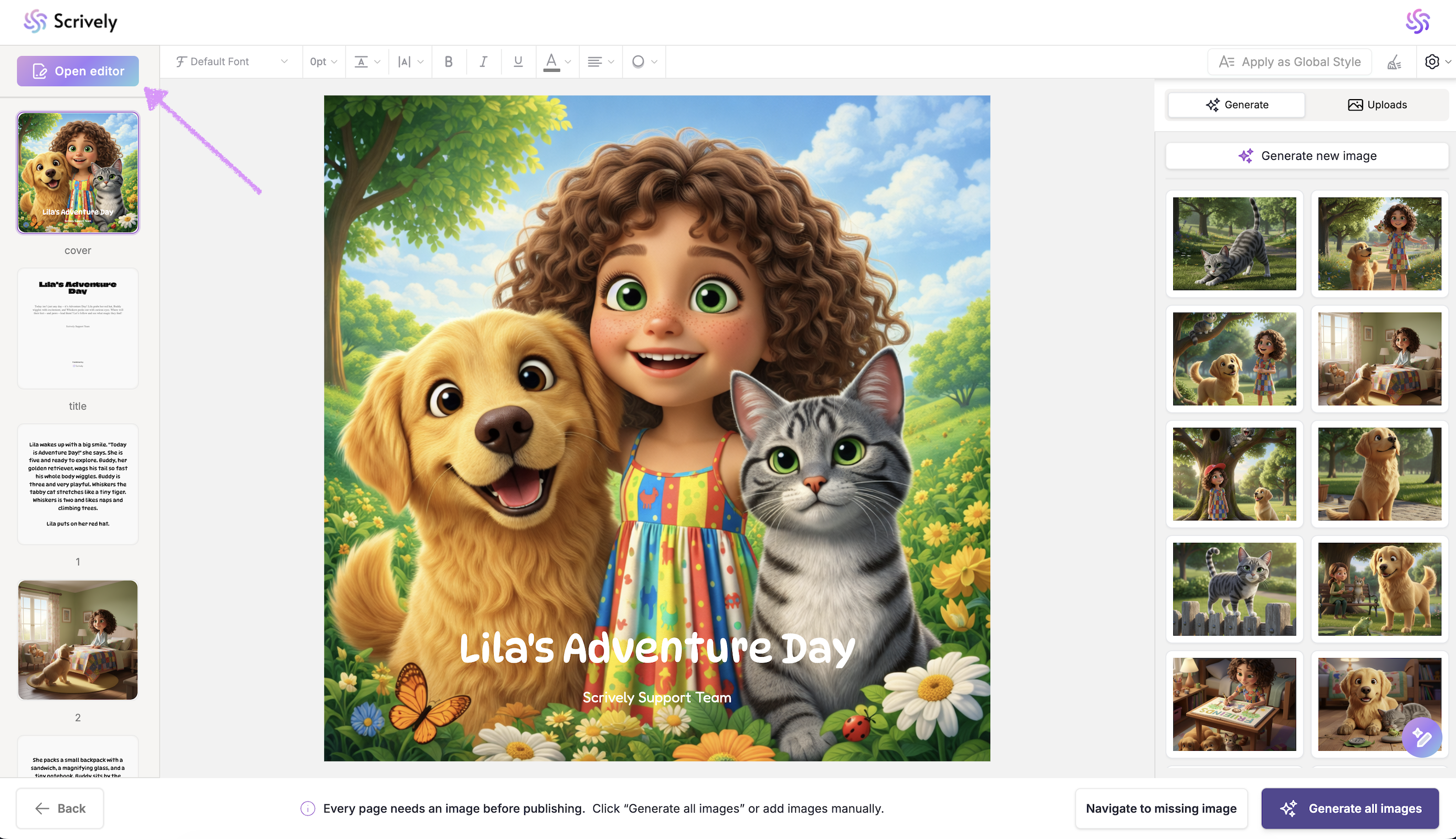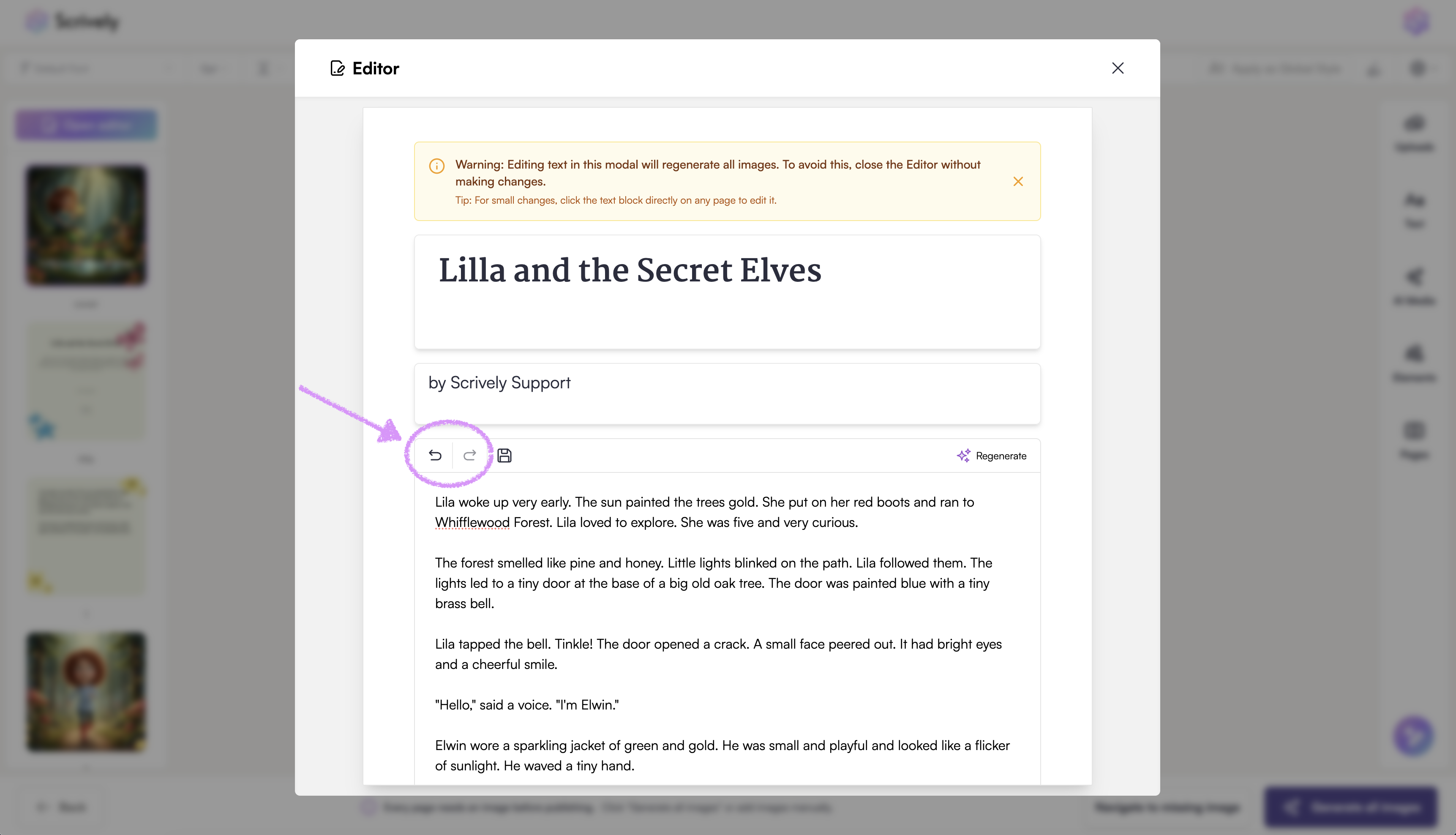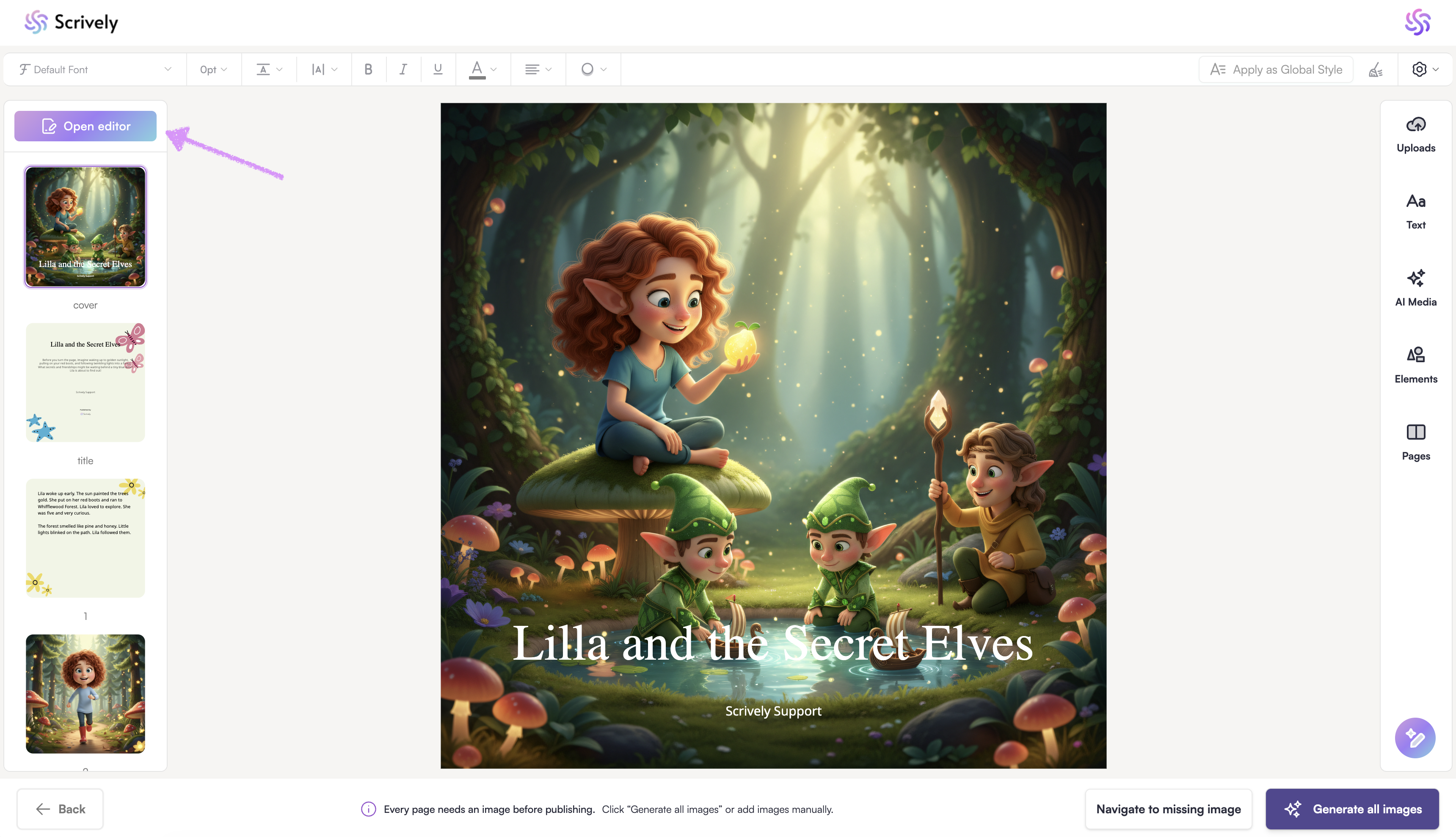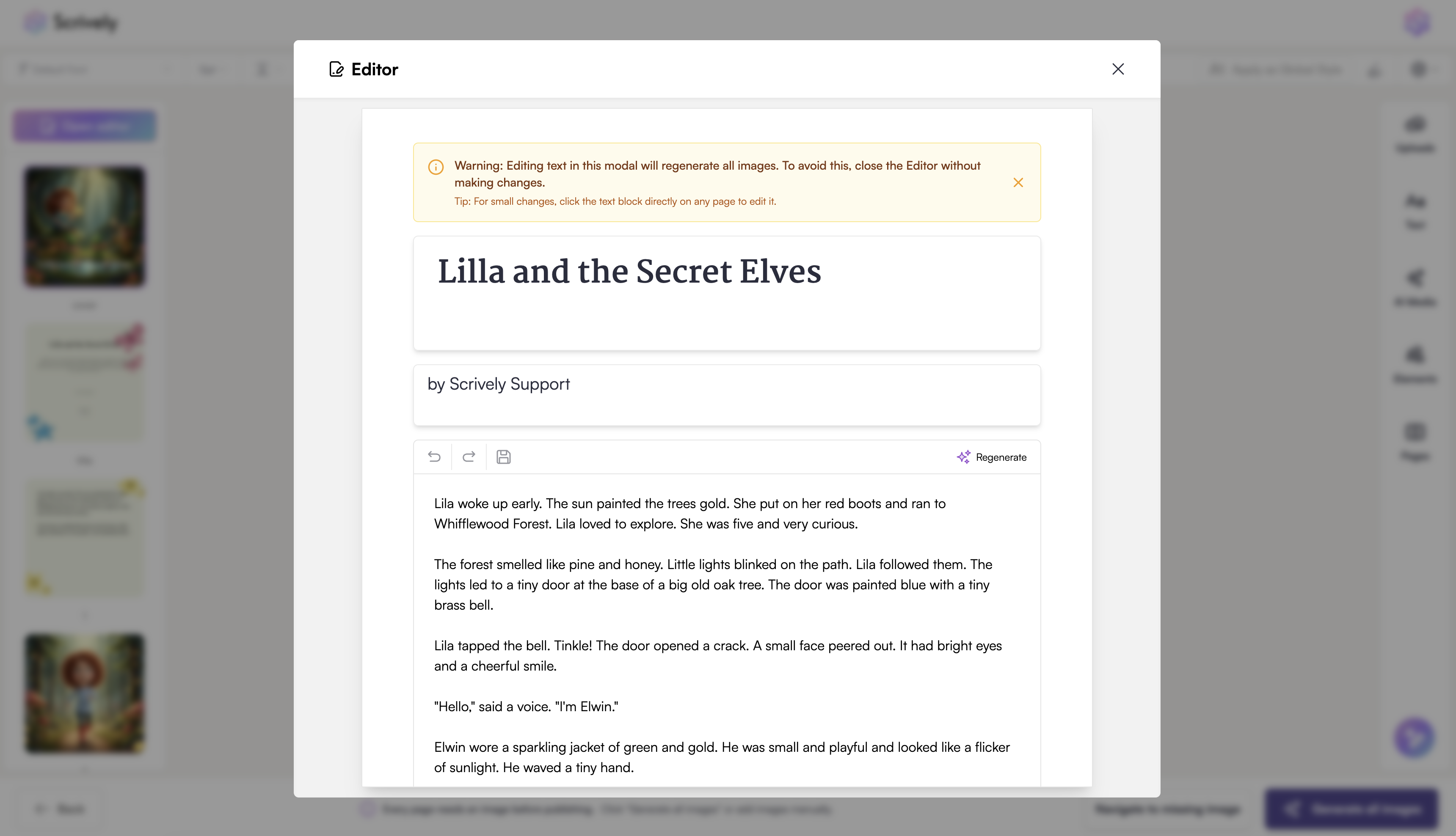 The Scrively Editor is where your story truly comes to life. Inside the Editor, you’ll find a complete visual overview of your book, making it easy to review, edit, and fine-tune each page. Whether you’re adjusting text or refining the flow of your story, the Editor gives you the tools you need to polish your book with confidence.