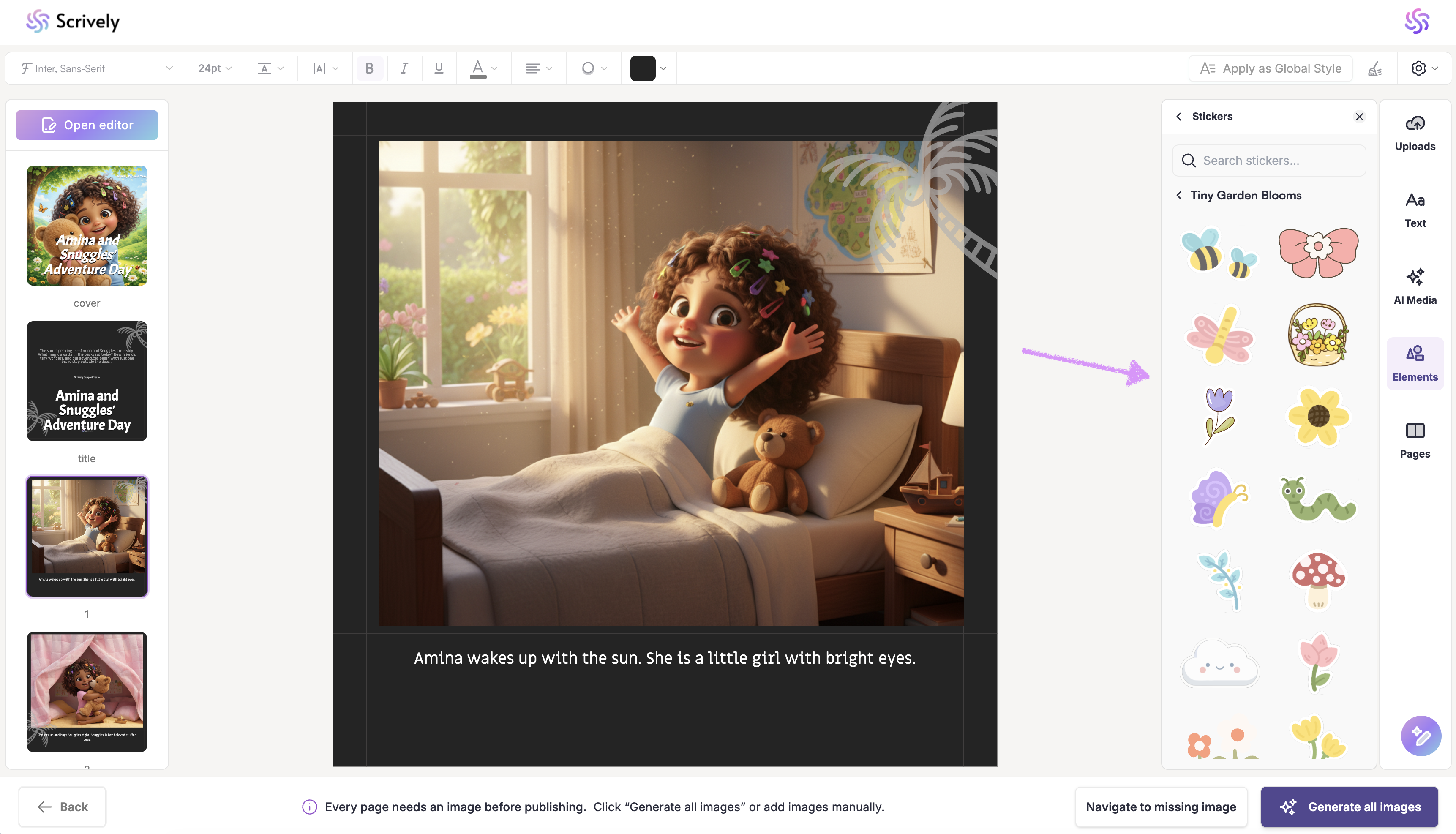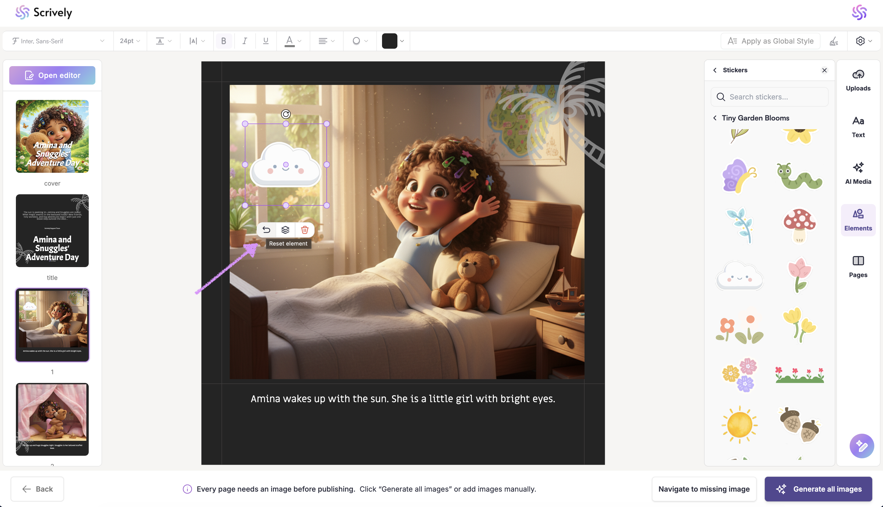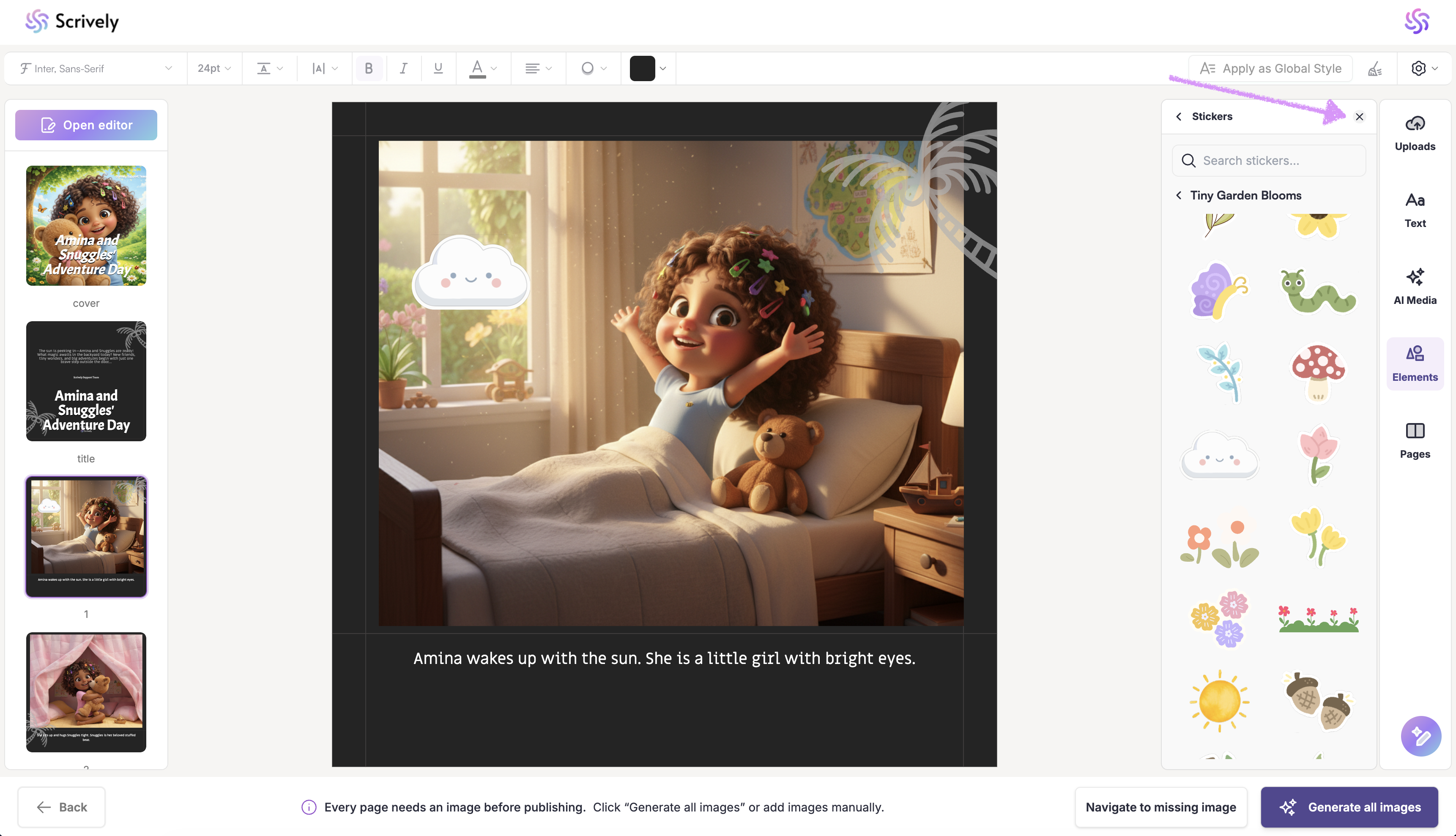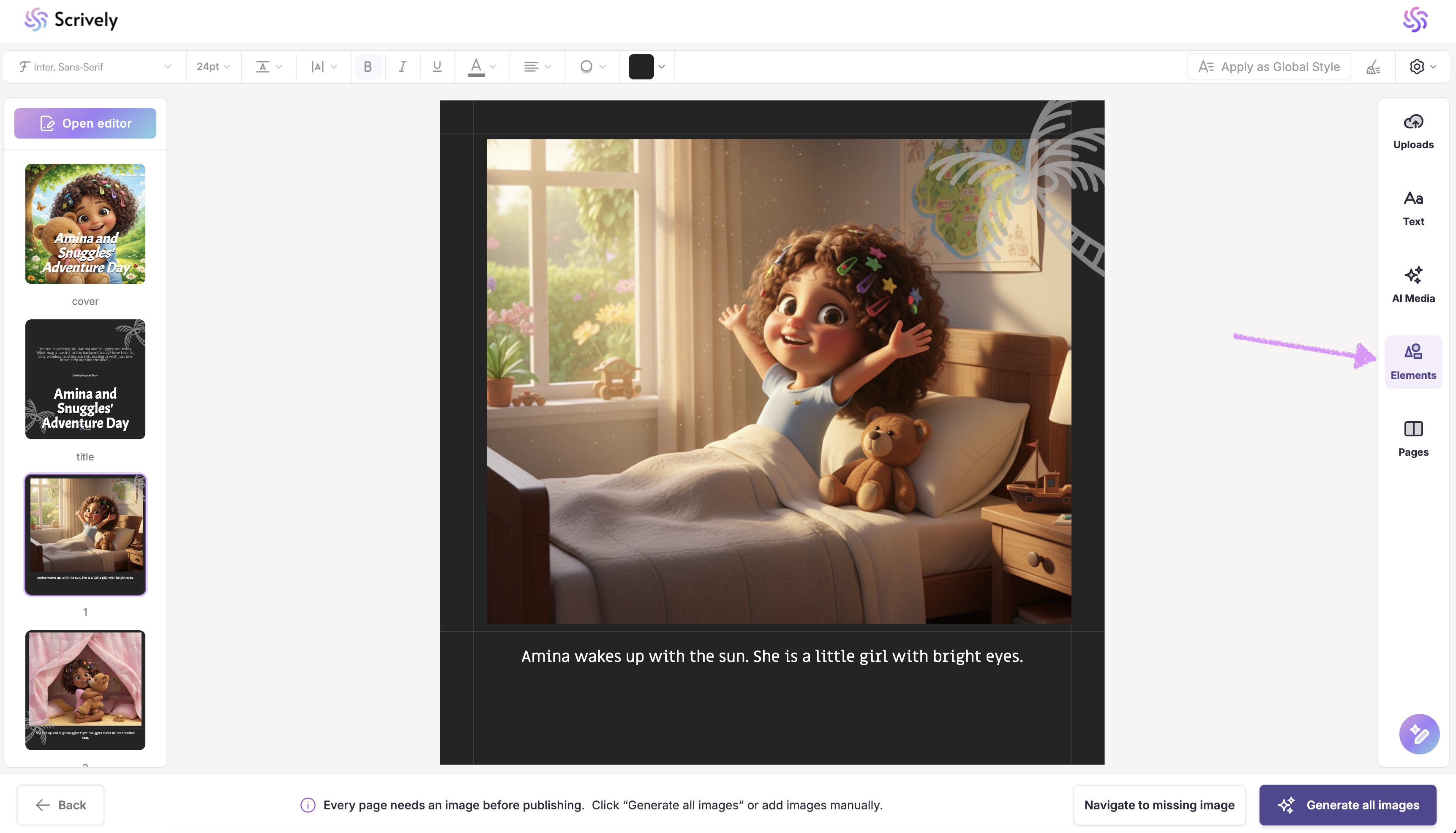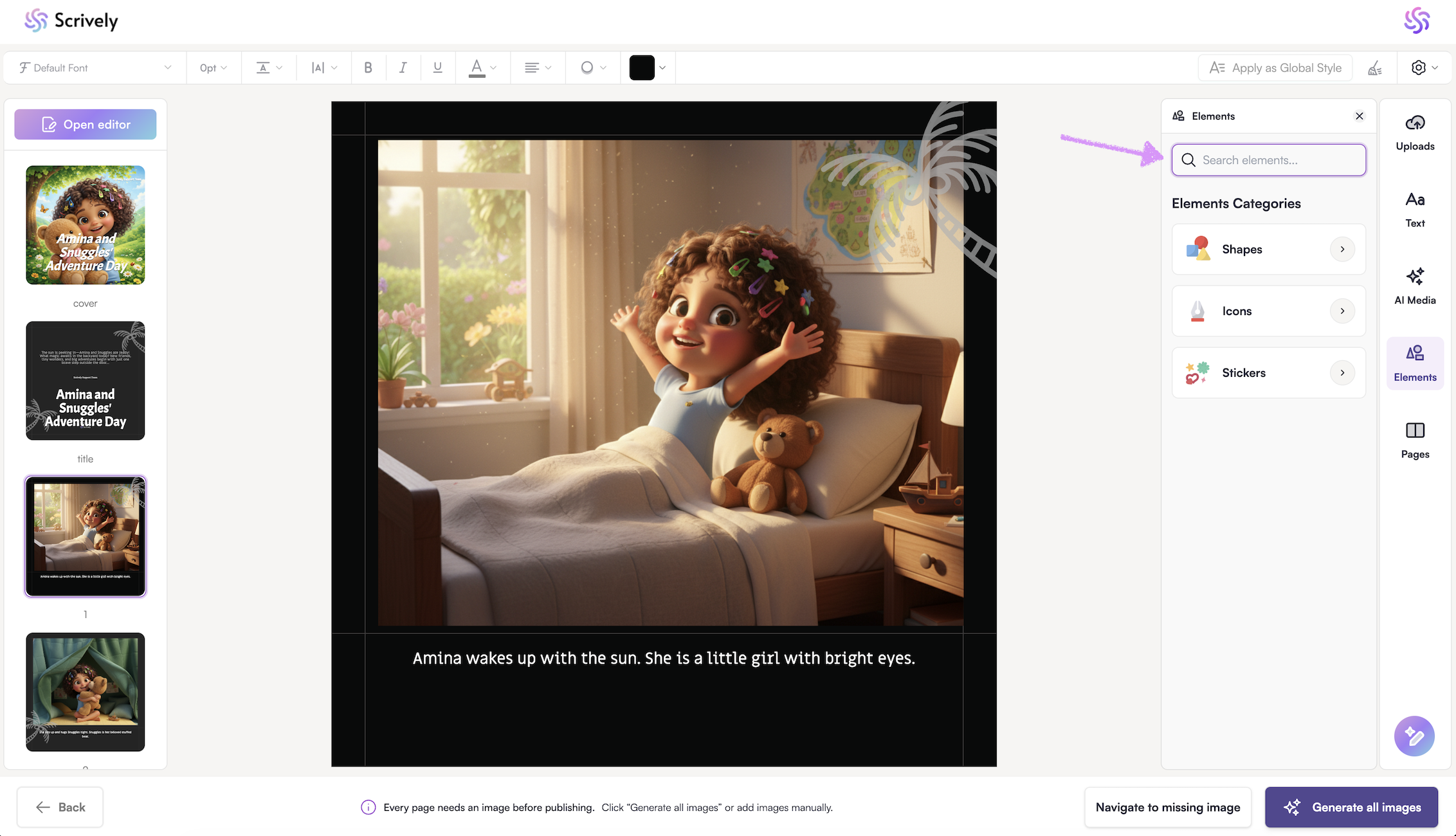 Elements allow you to enhance your book pages with additional design details like shapes, icons and other visual components. By adding and arranging elements, you can customize each page’s layout, control layering, and create a polished look that brings your story to life.