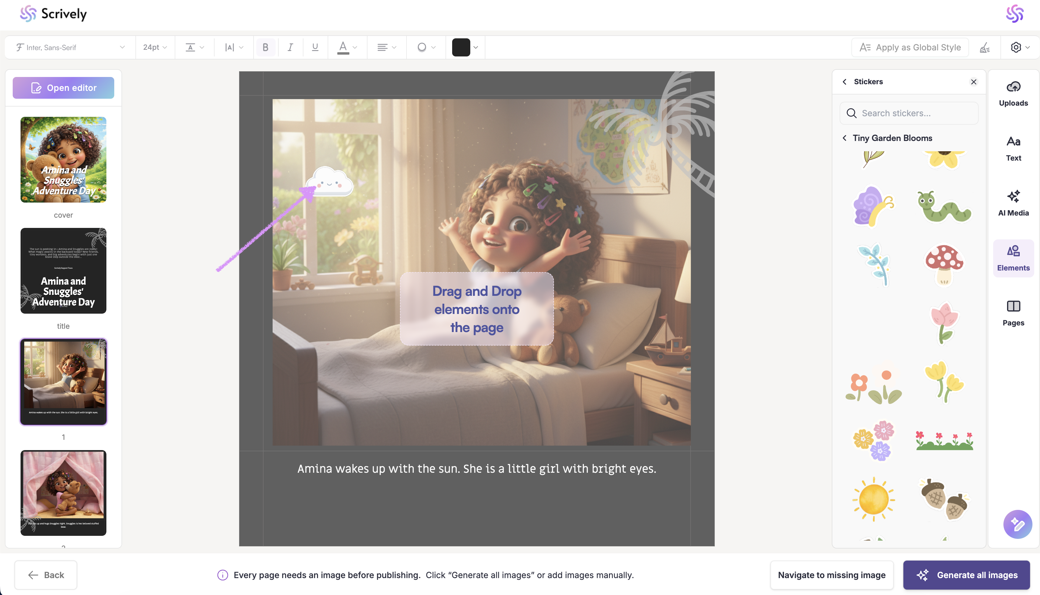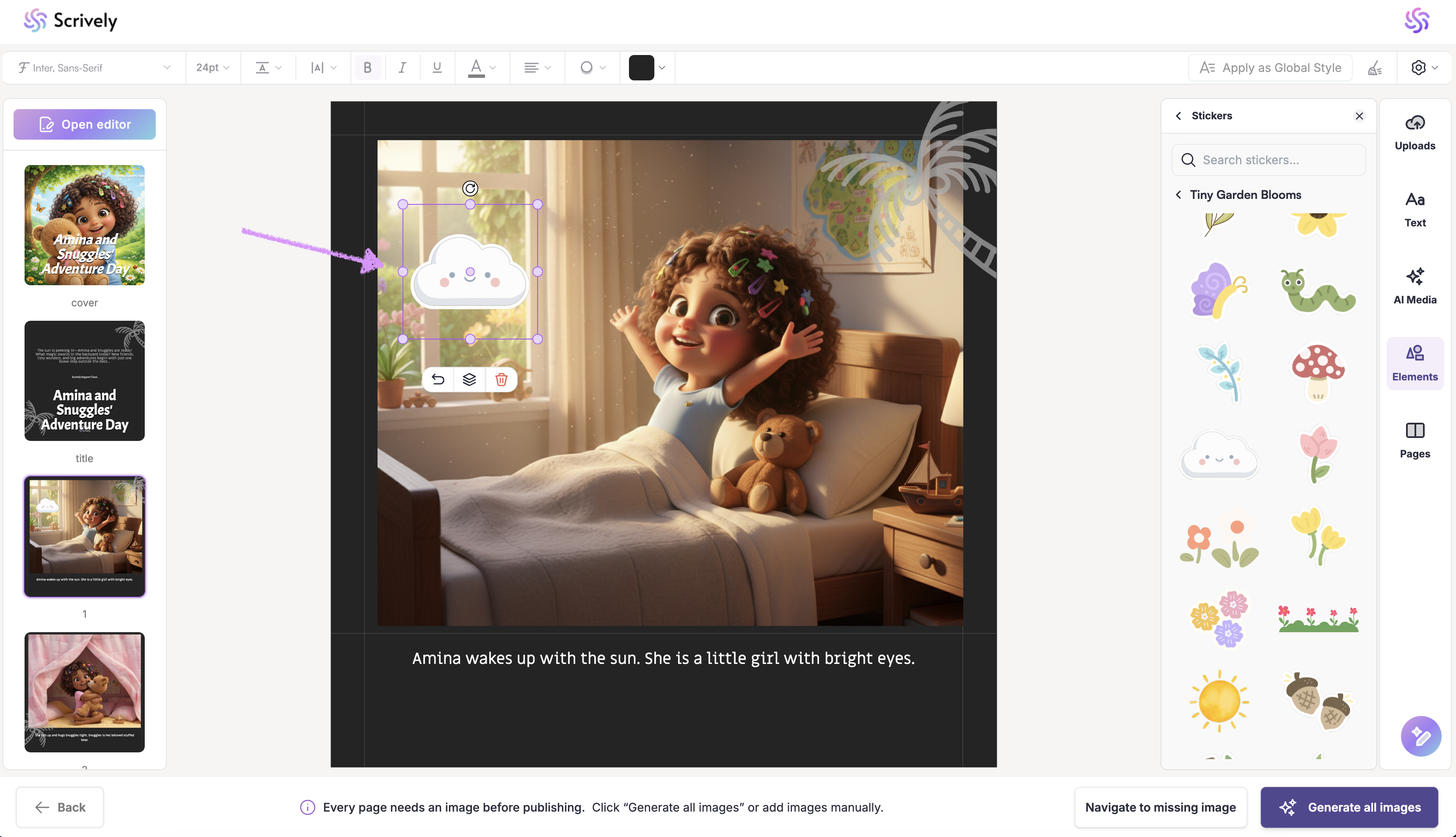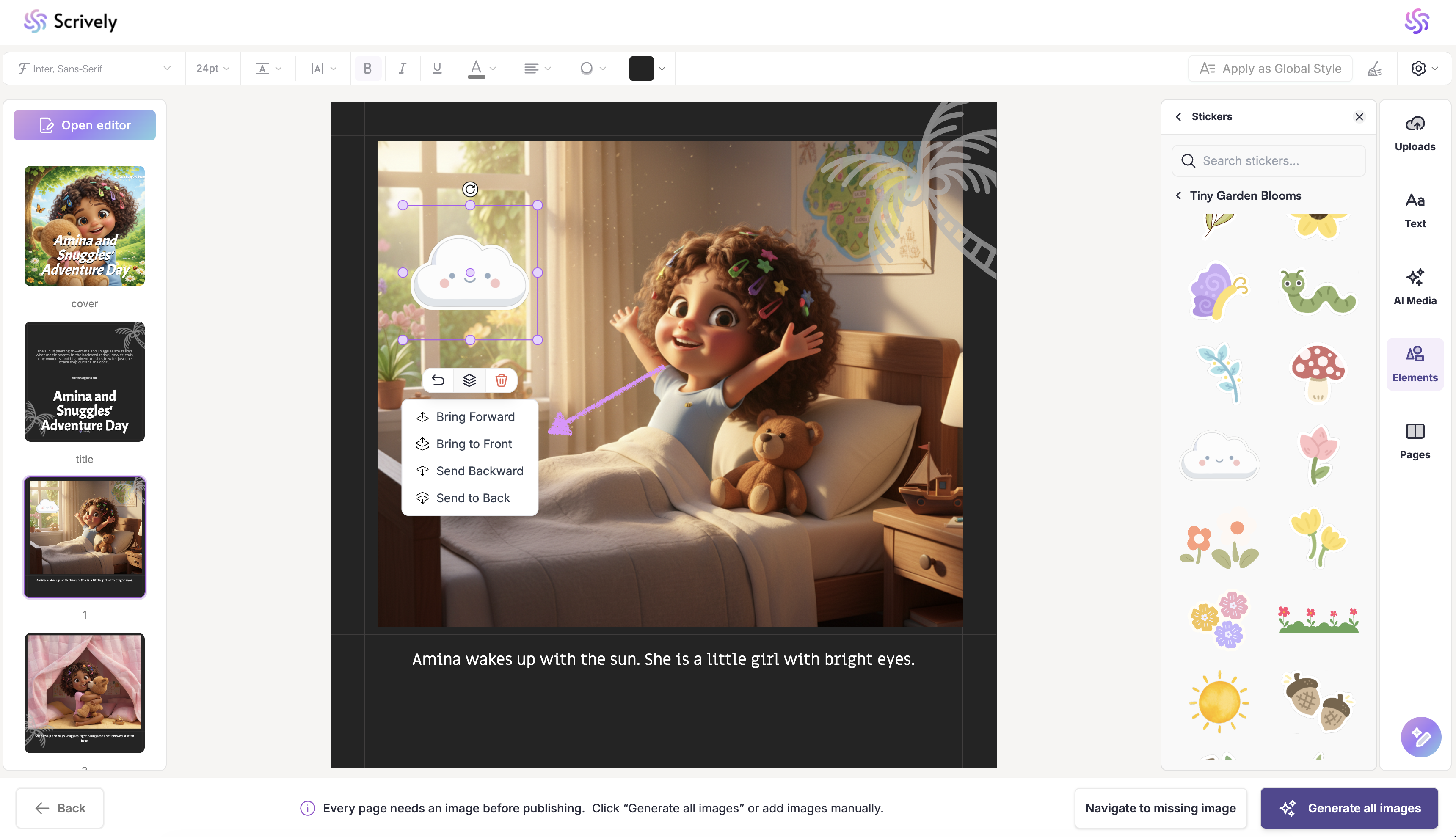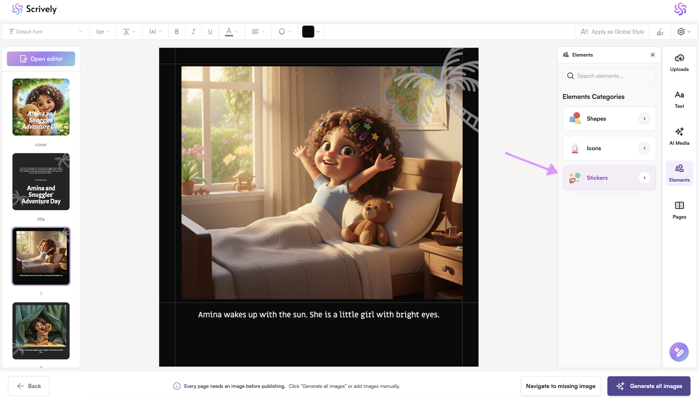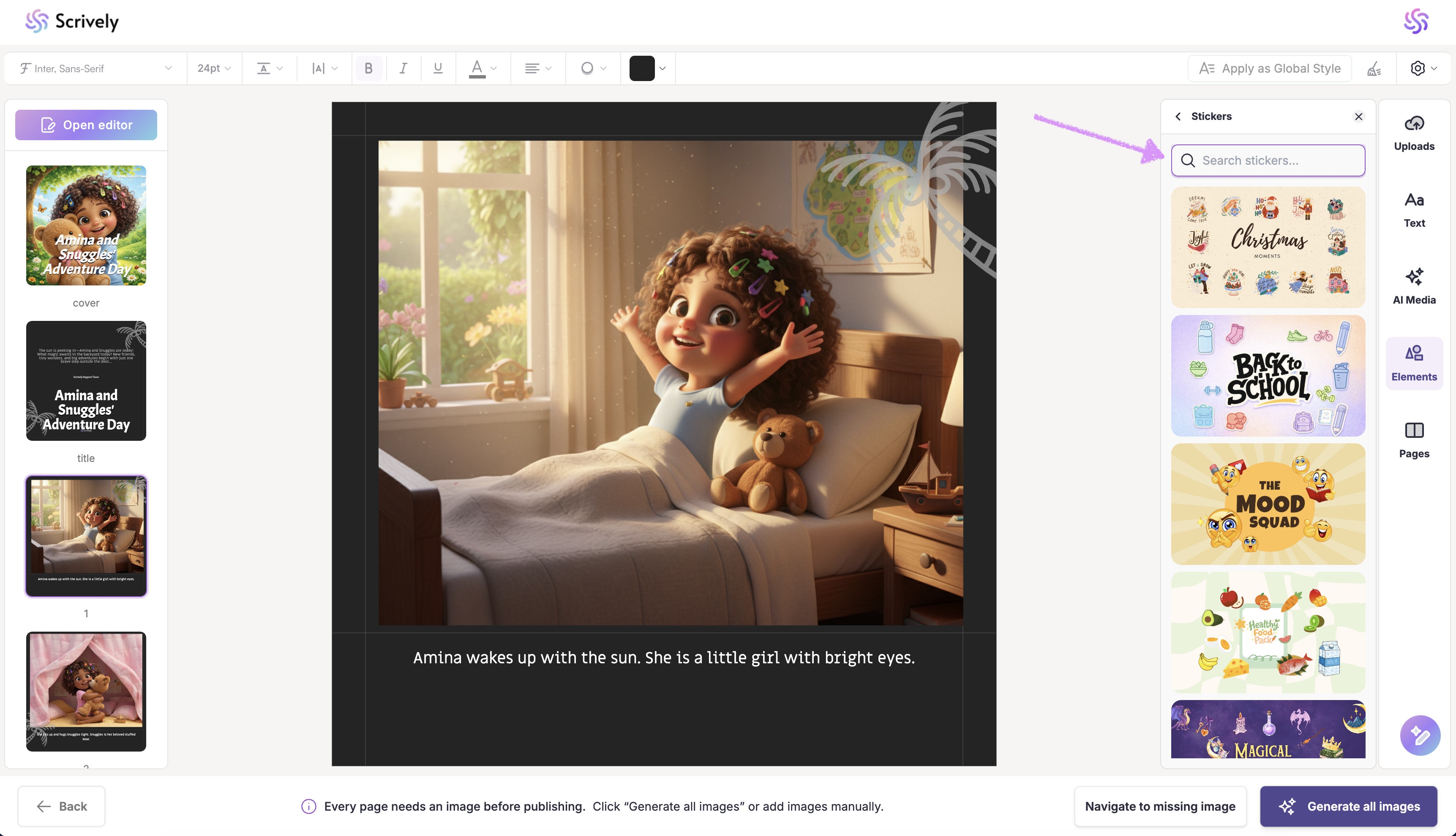 Elements allow you to enhance your book pages with additional design details like shapes, icons and other visual components. By adding and arranging elements, you can customize each page’s layout, control layering, and create a polished look that brings your story to life.