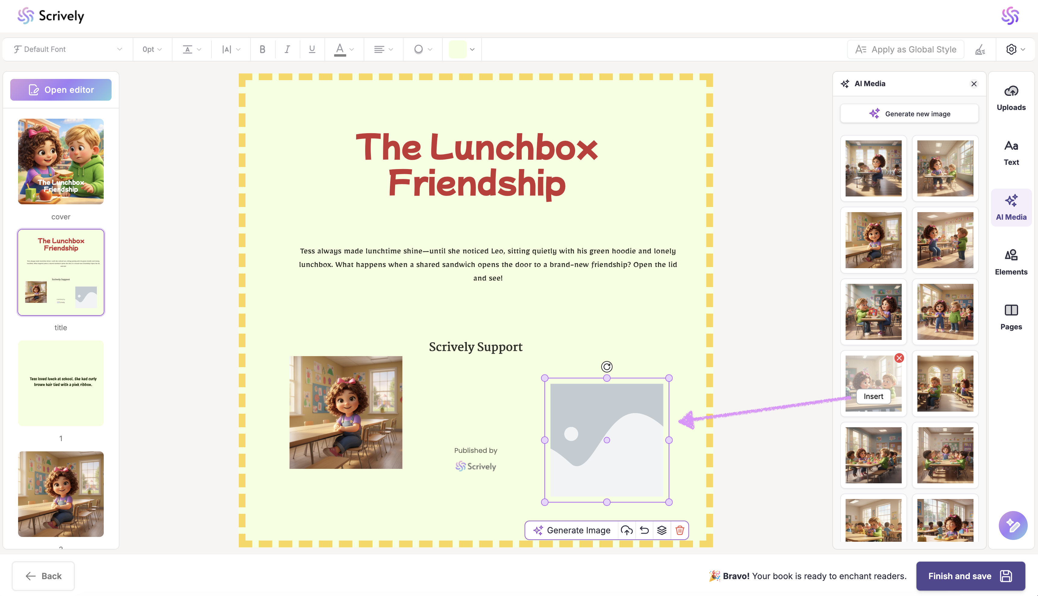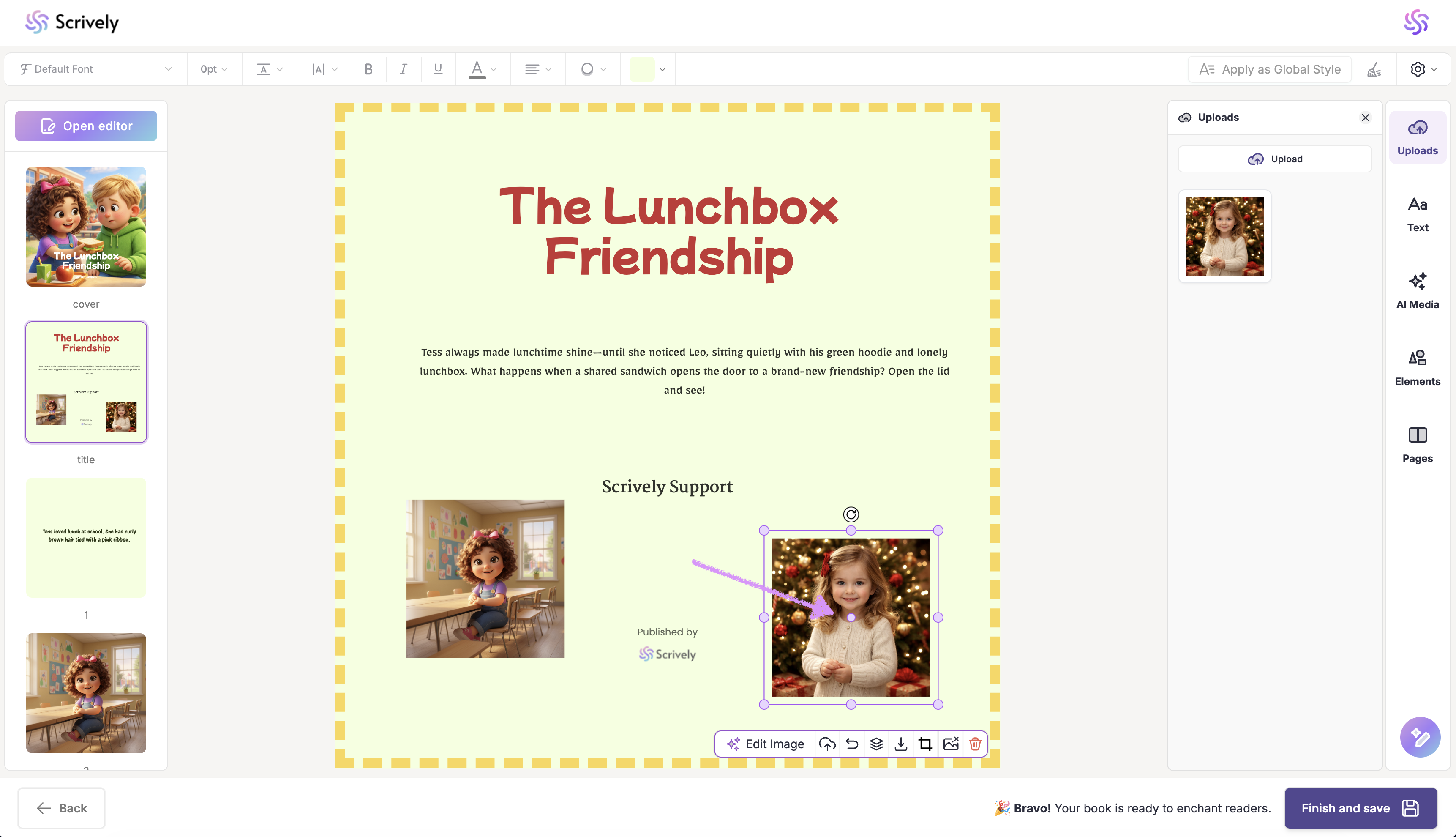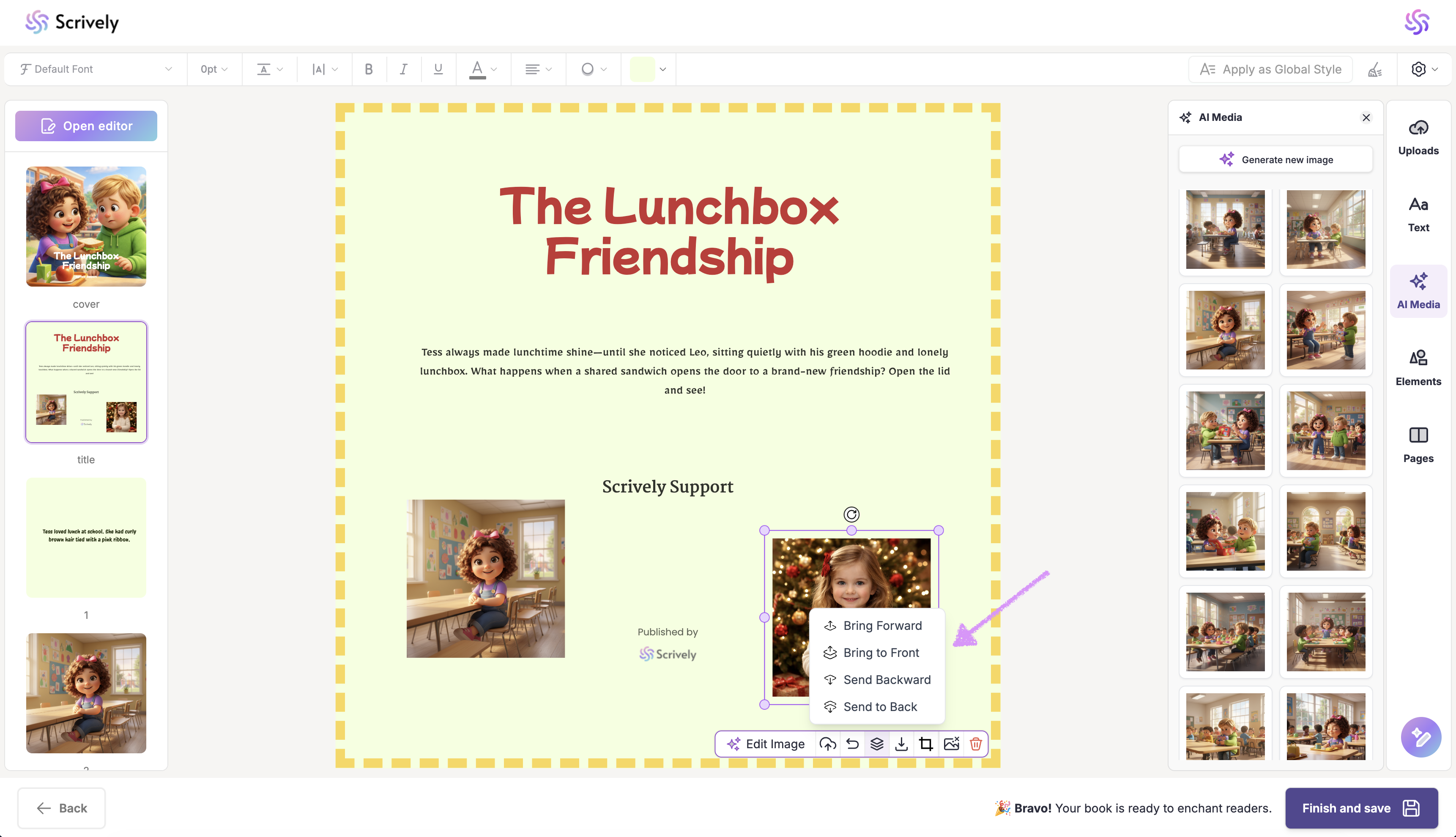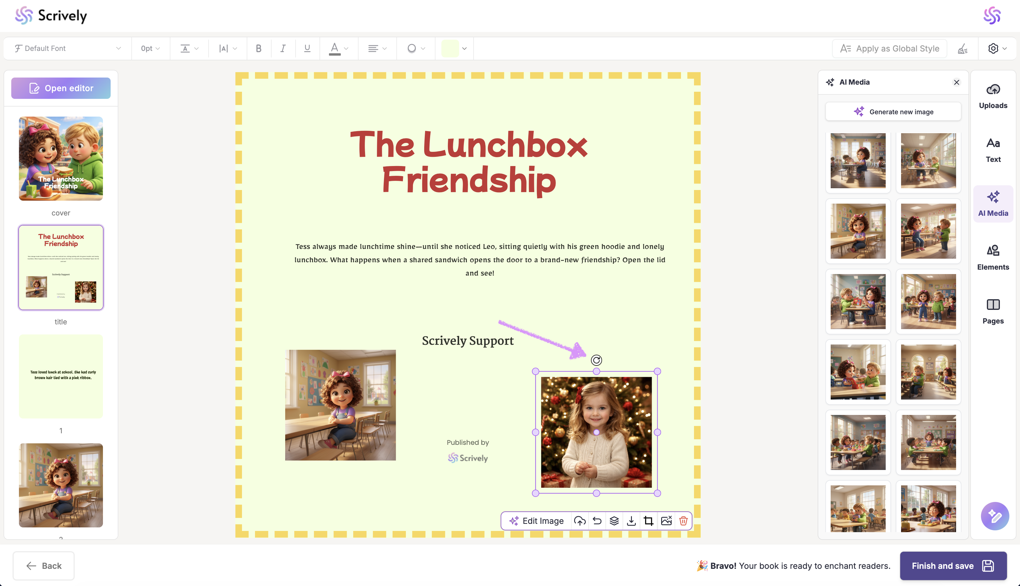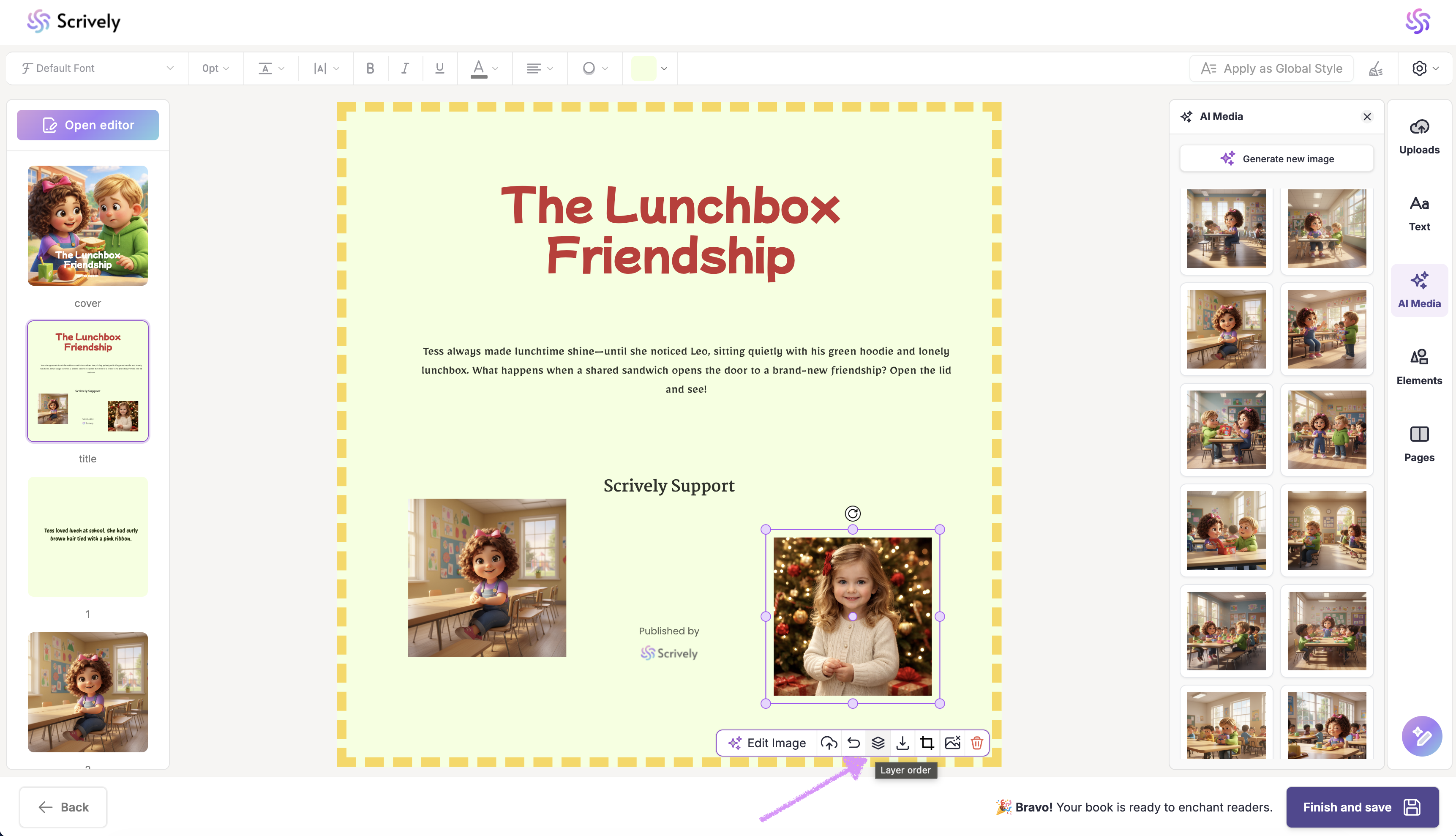 Scrively’s Image Editing Tools give you full control over every illustration in your book. You can rotate, edit, upload, reset, adjust layers, download, crop, clear, or delete images to fine-tune your layout and create beautifully designed pages with ease.