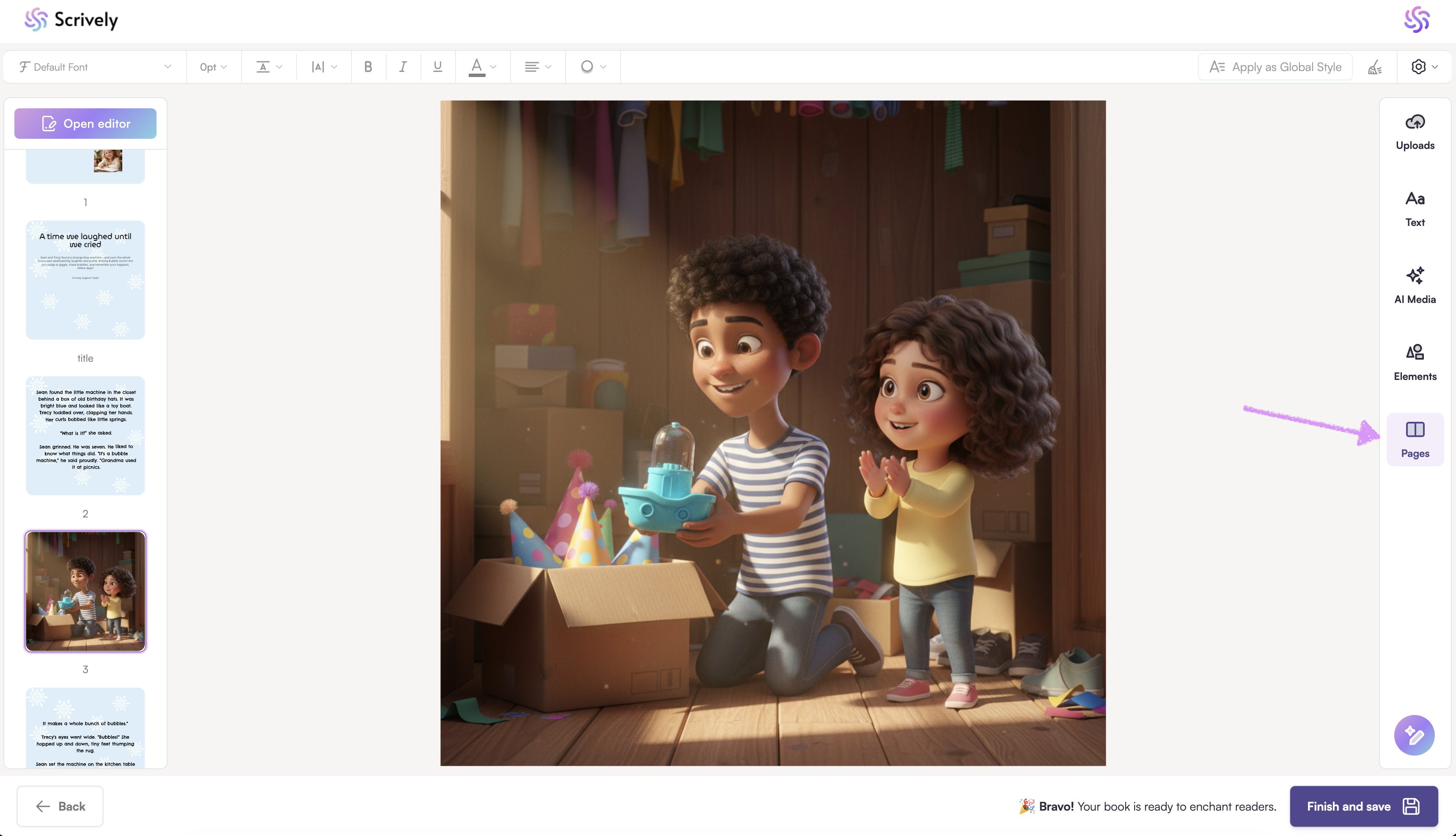 In the Designer (book layout view), open the "Pages" tool from the panel on the right side.